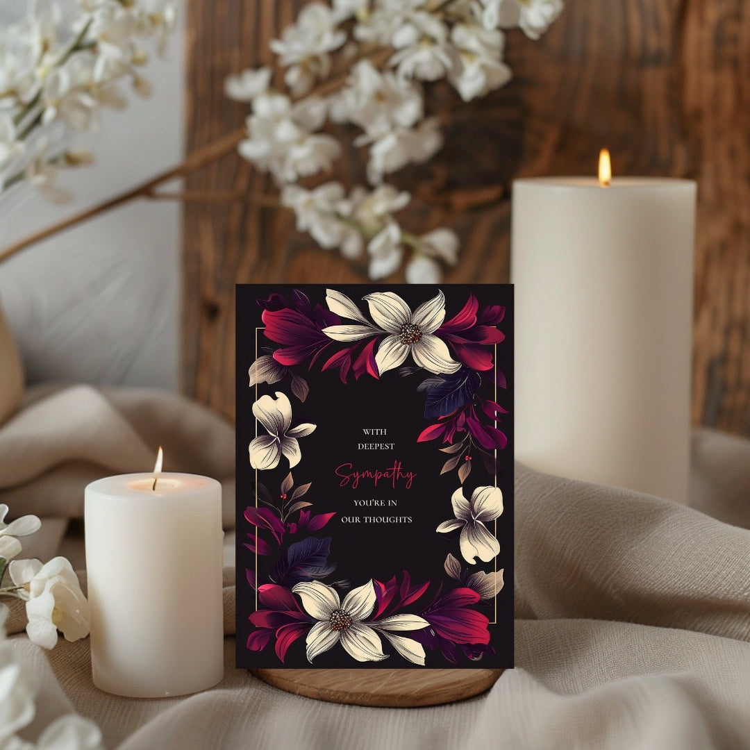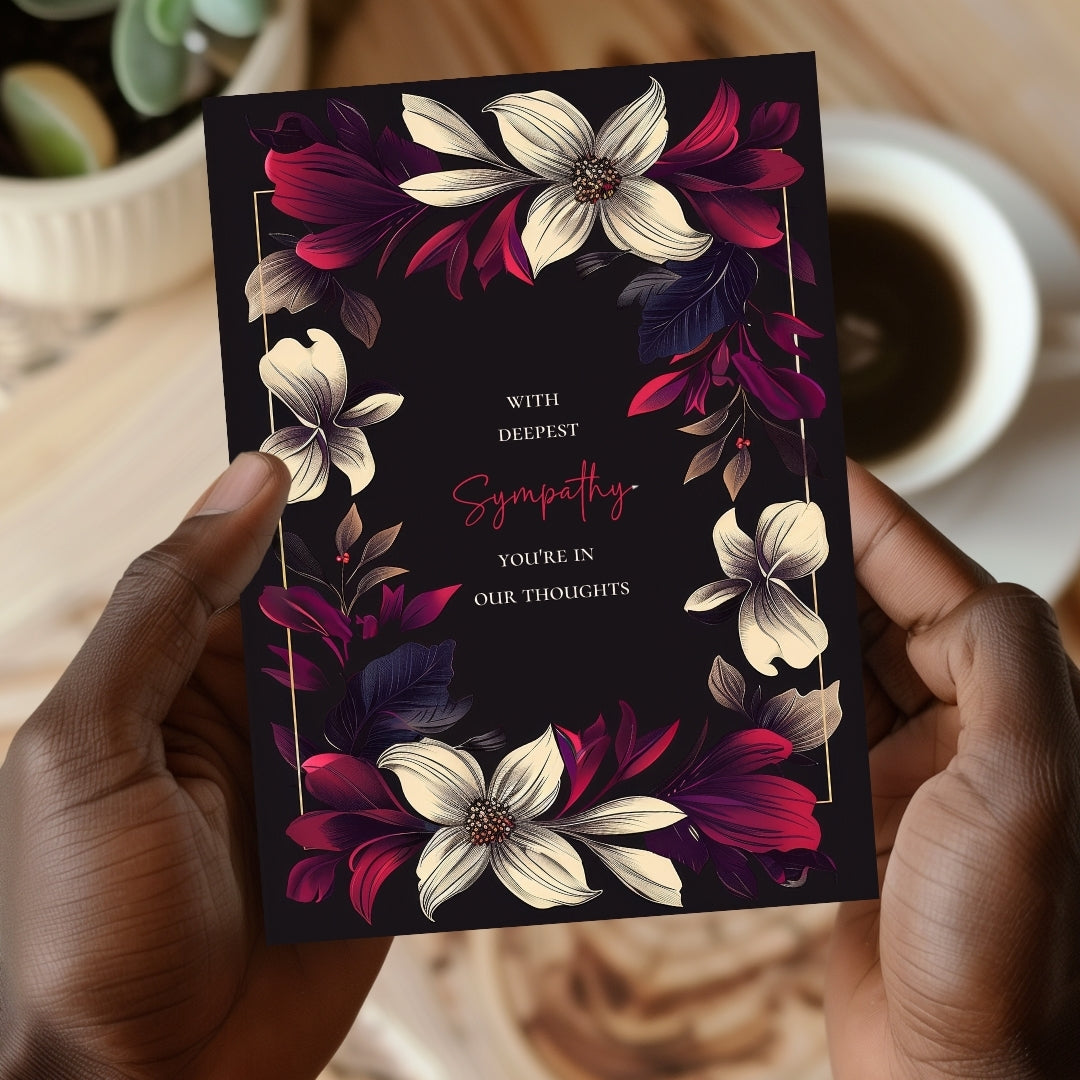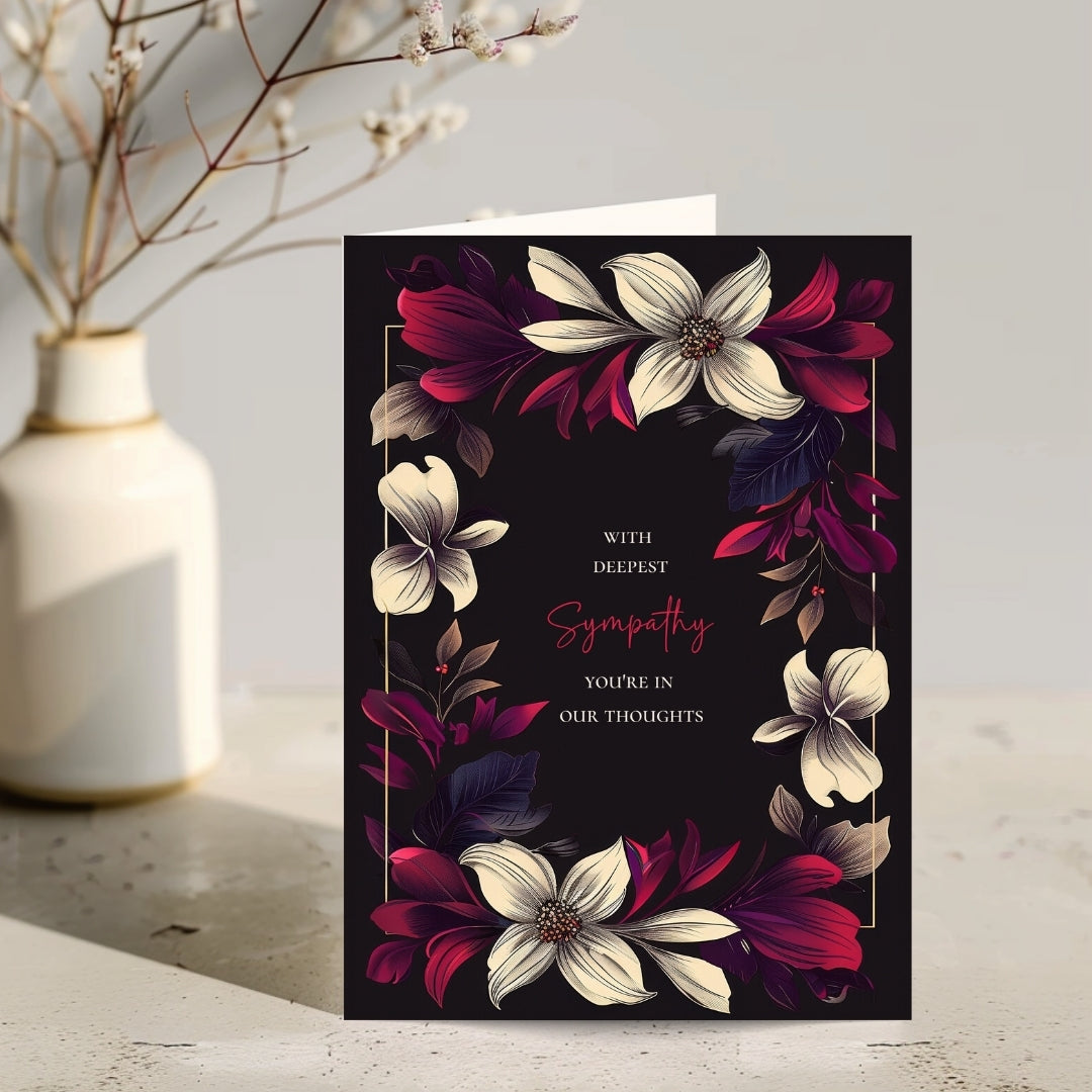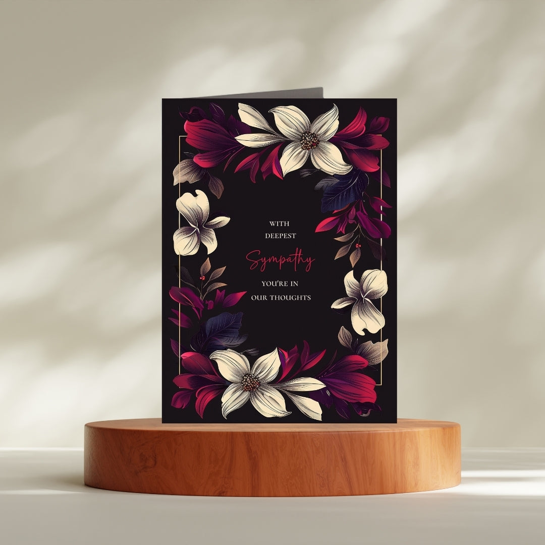 Our sympathy card features a dark black background adorned with beautifully detailed floral elements in vibrant shades of cream, red, and purple. The centralized text is framed by a symmetrical arrangement of flowers and leaves, adding a touch of nature-inspired elegance.