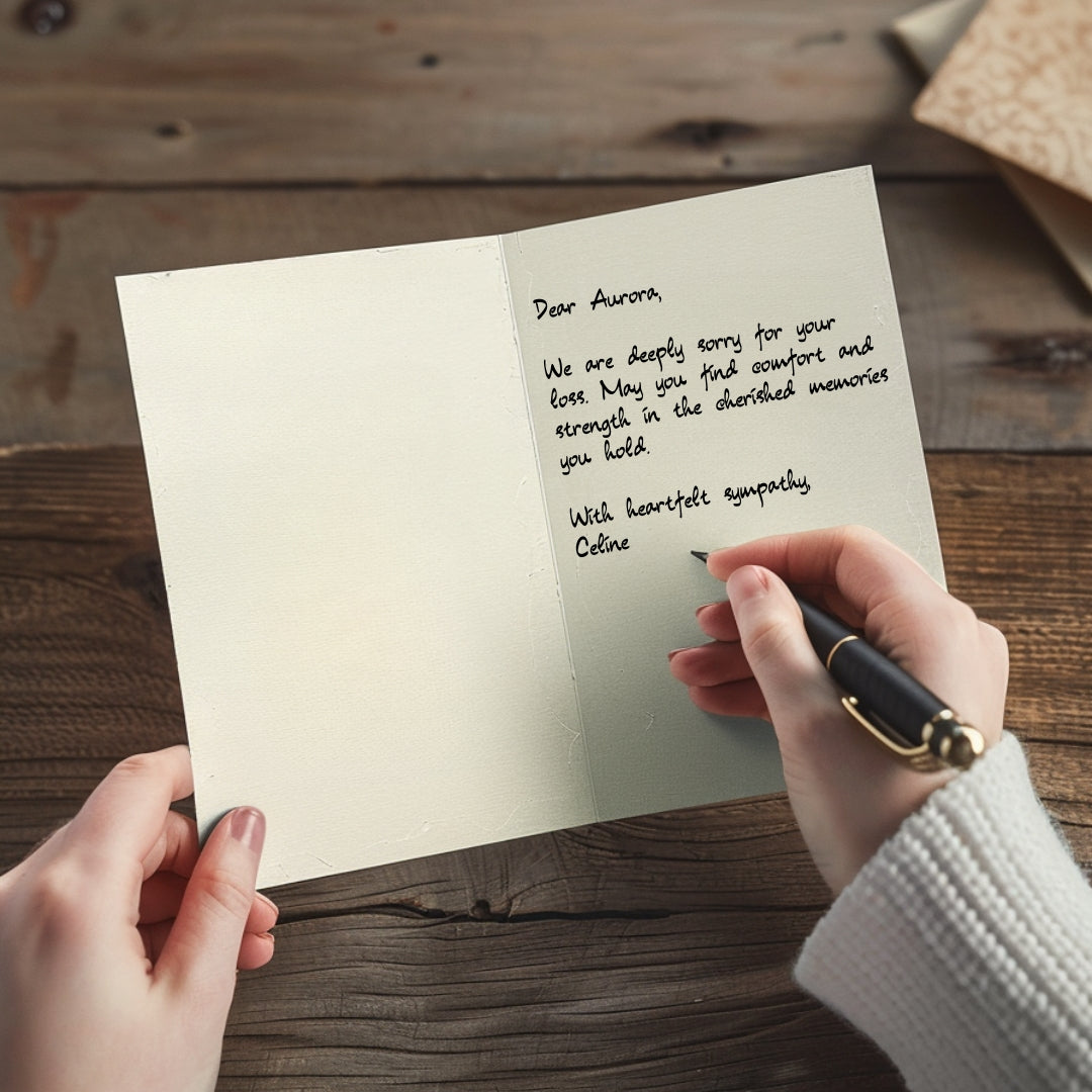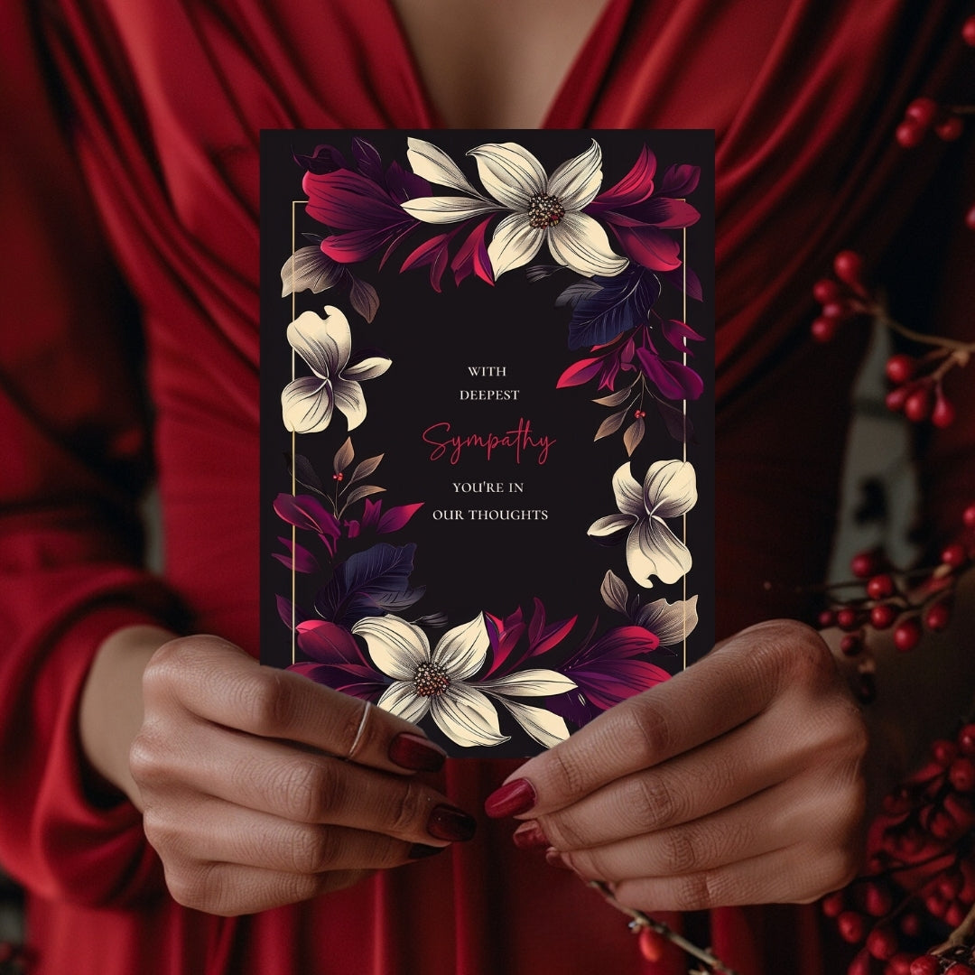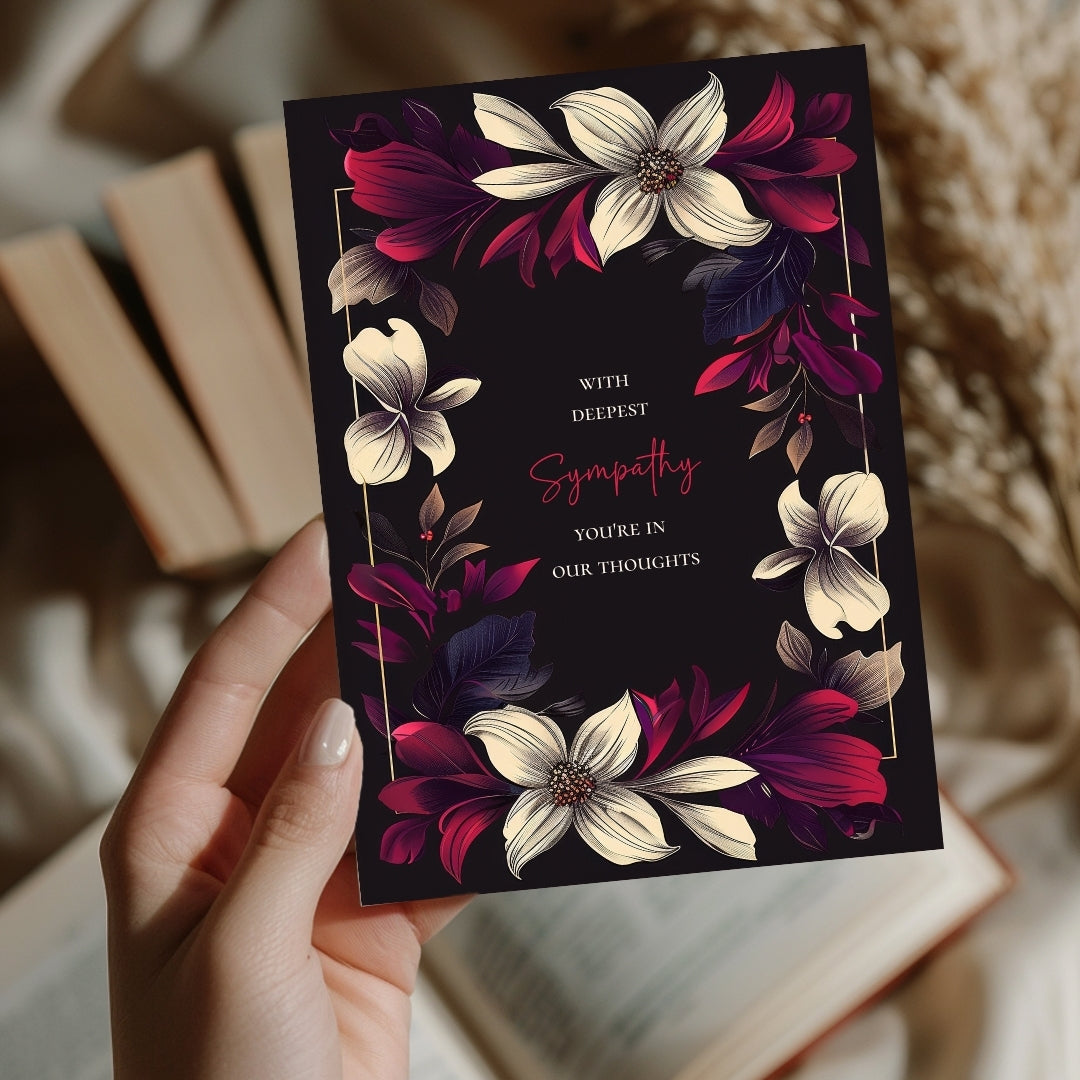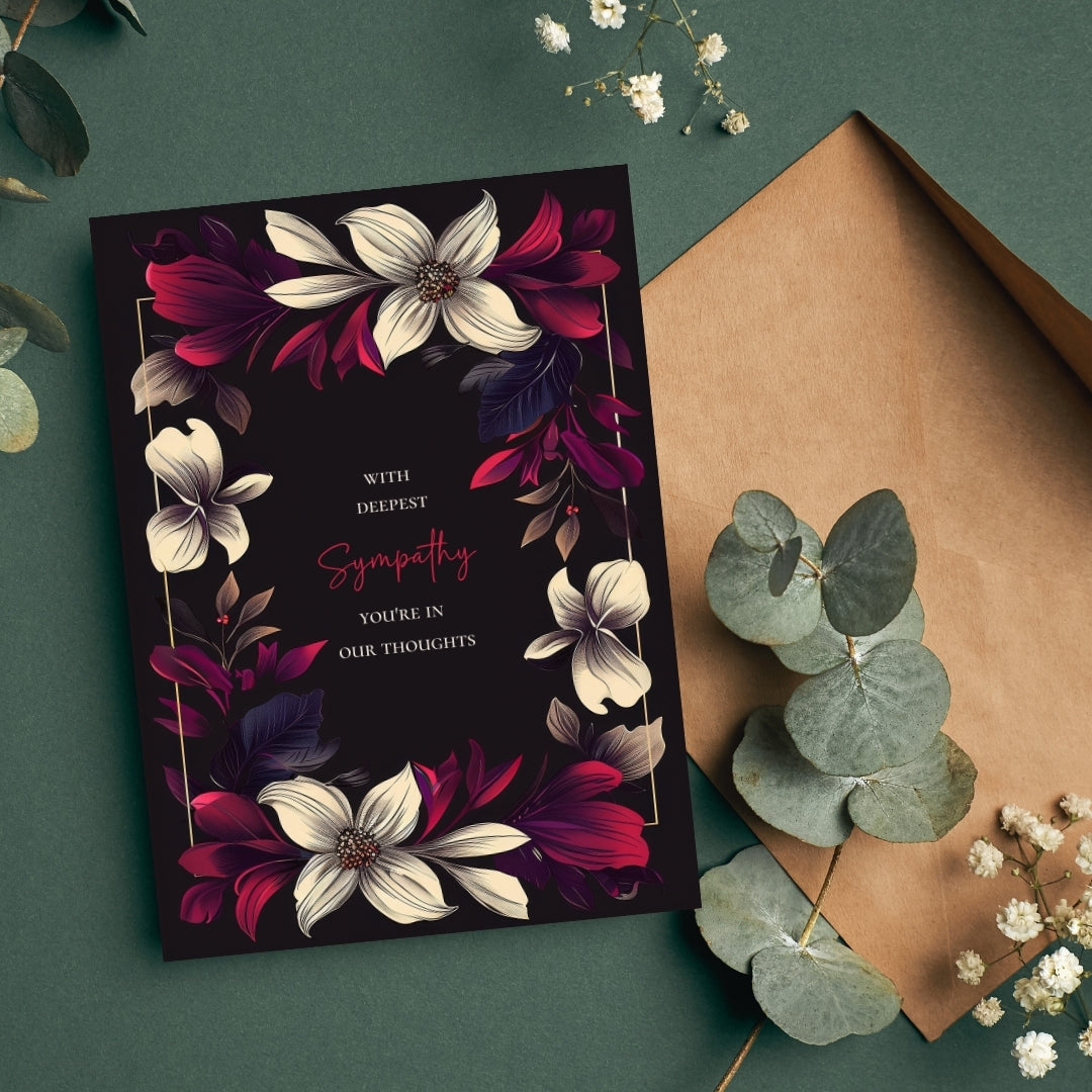 Our sympathy card features a dark black background adorned with beautifully detailed floral elements in vibrant shades of cream, red, and purple. The centralized text is framed by a symmetrical arrangement of flowers and leaves, adding a touch of nature-inspired elegance.