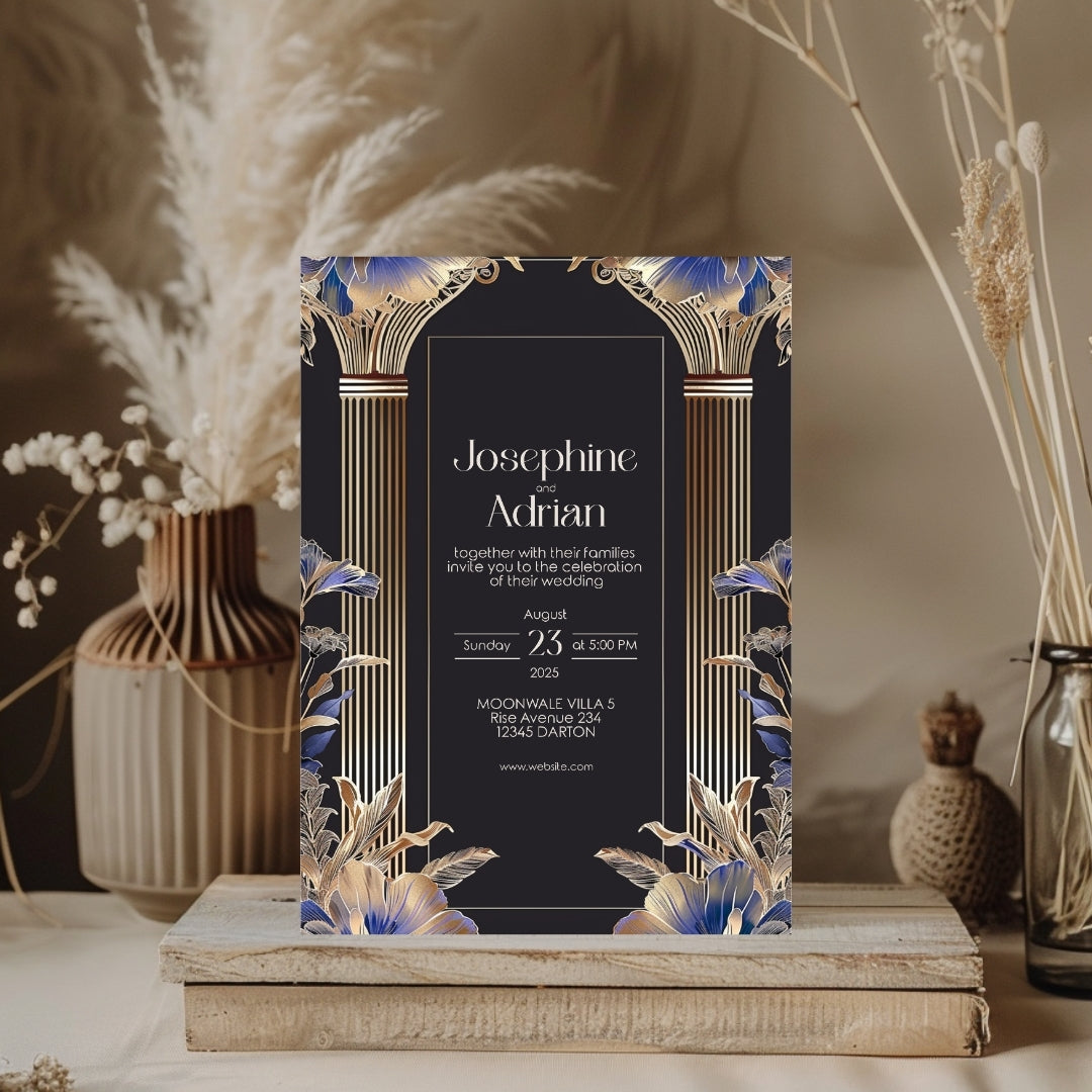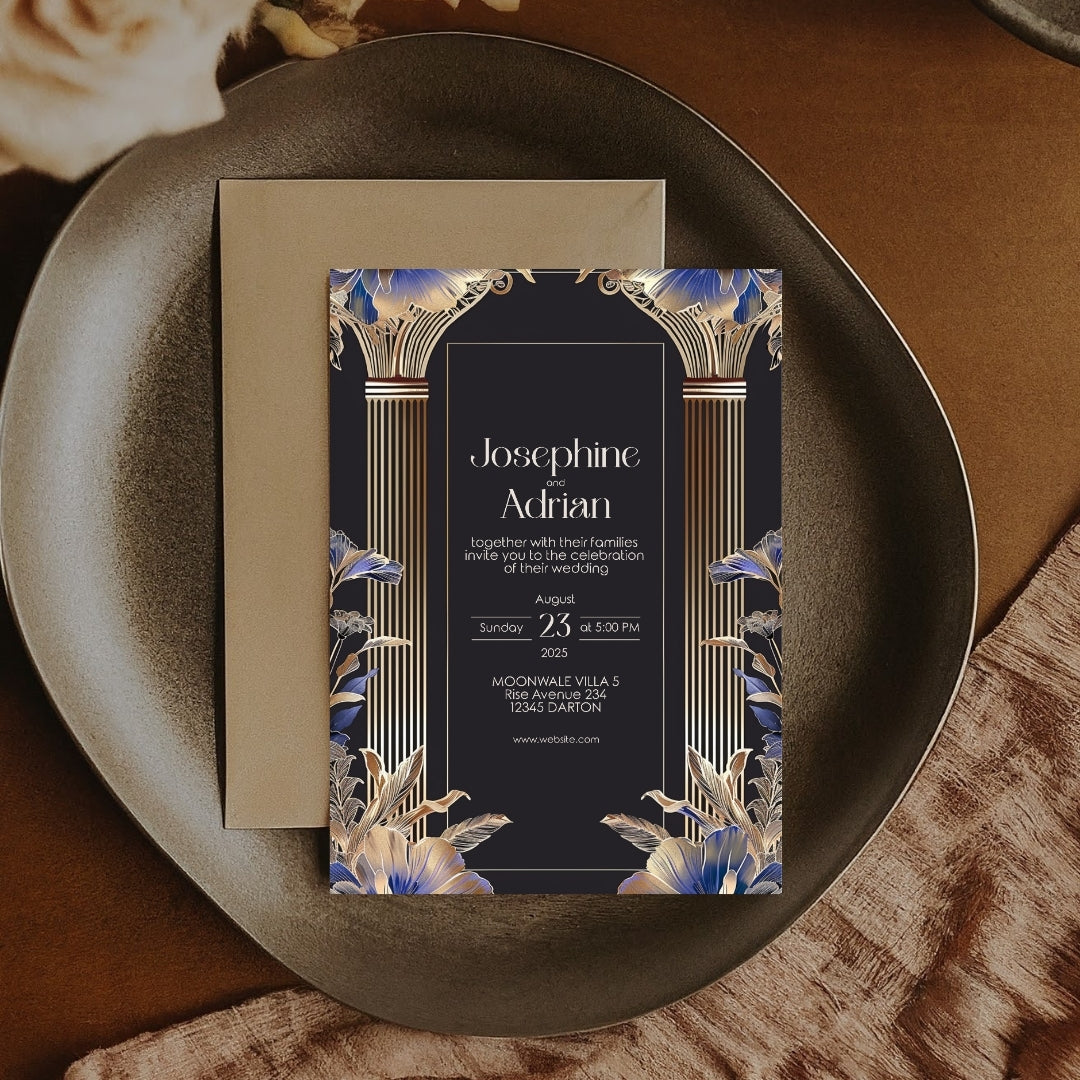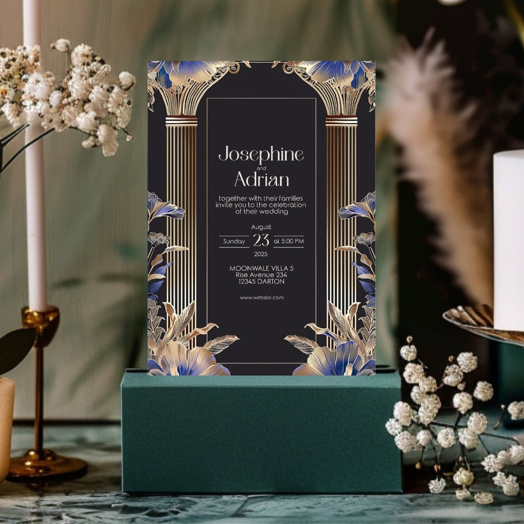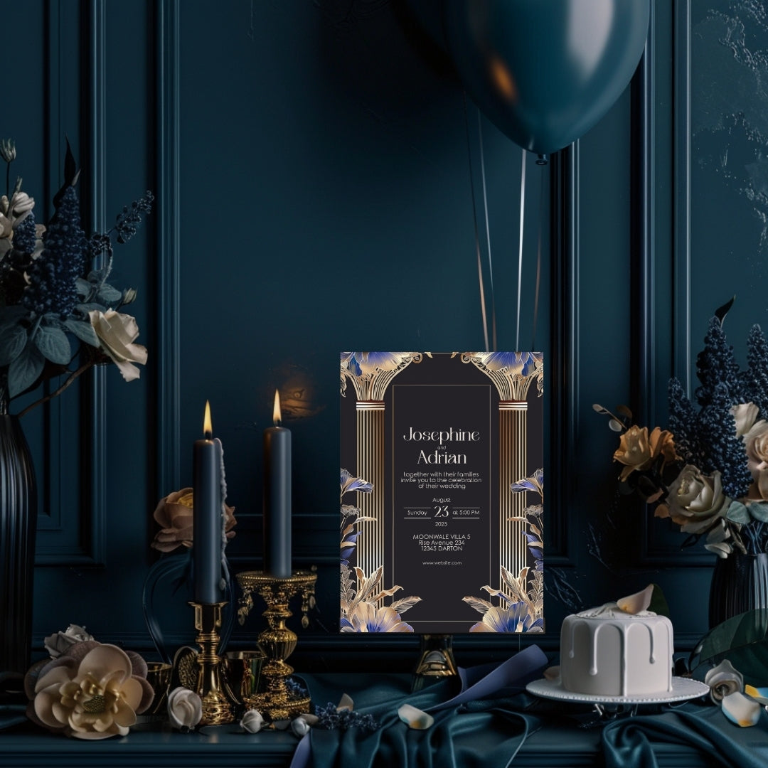 Immerse yourself in the timeless elegance of the Roaring 20s with our Blue Roman Pillar Art Deco Invitation. This digital template is a marriage of dark roman glamour and modern botanical, creating a stunning announcement for your wedding, anniversary, or any enchanted gathering. Editable with Corjl, this invitation lets you personalize your announcement with ease, ensuring it perfectly captures the essence of your celebration. Whether you choose to print it professionally, at home, or send it digitally, this invitation is sure to make a striking first impression.