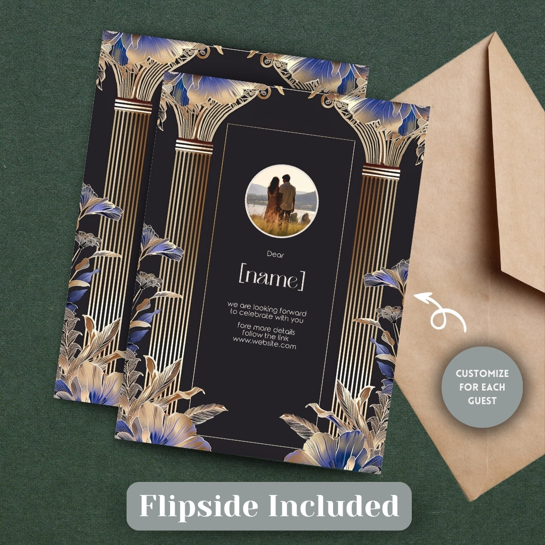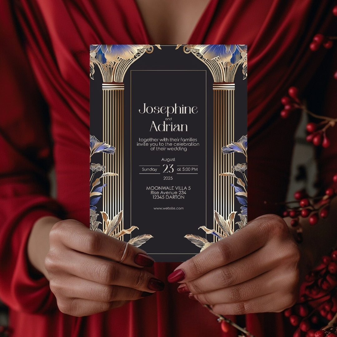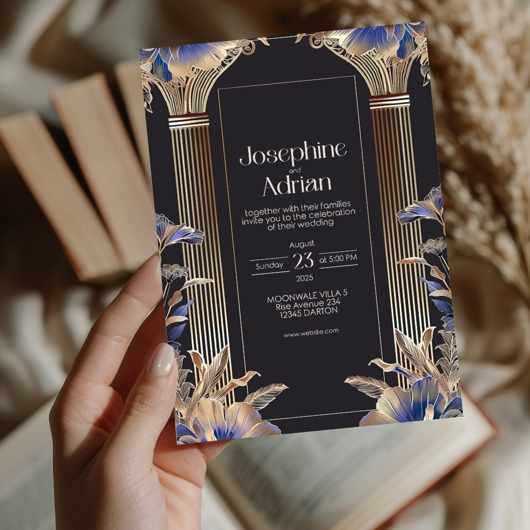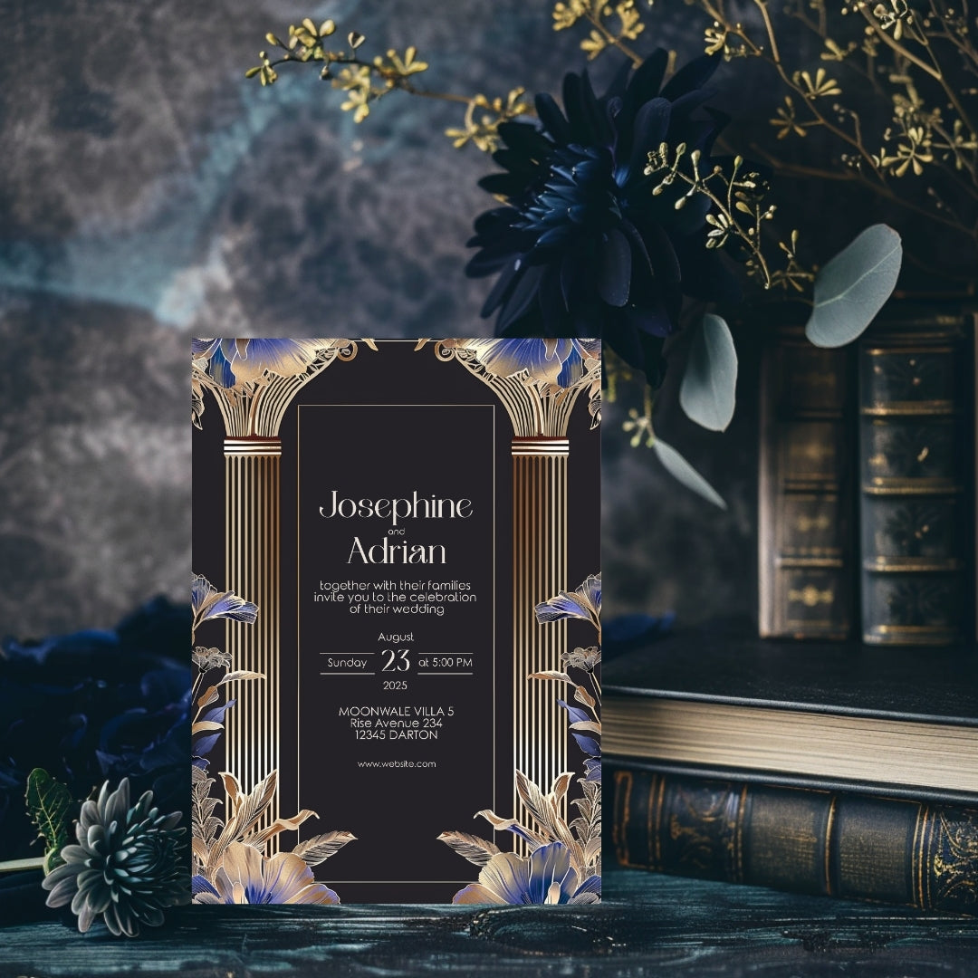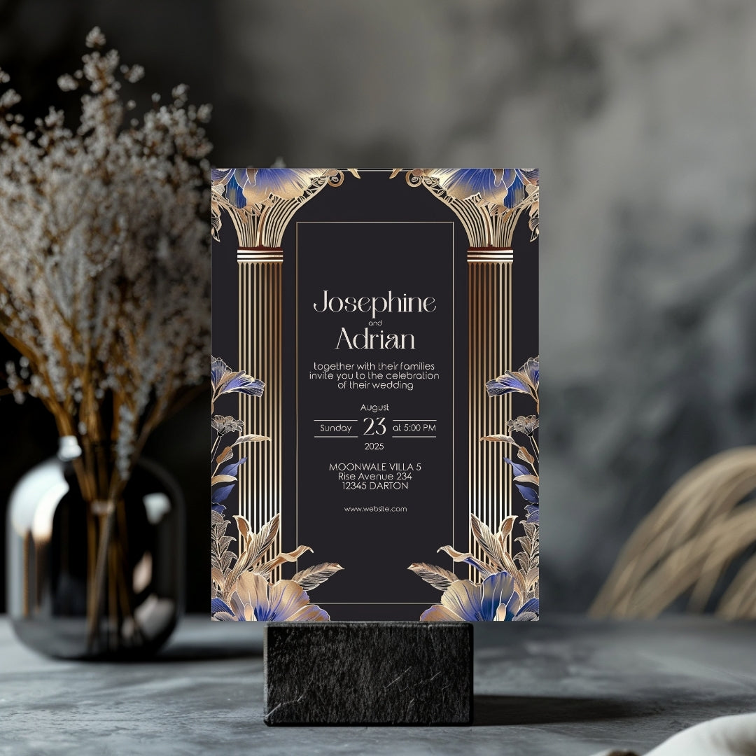Immerse yourself in the timeless elegance of the Roaring 20s with our Blue Roman Pillar Art Deco Invitation. This digital template is a marriage of dark roman glamour and modern botanical, creating a stunning announcement for your wedding, anniversary, or any enchanted gathering. Editable with Corjl, this invitation lets you personalize your announcement with ease, ensuring it perfectly captures the essence of your celebration. Whether you choose to print it professionally, at home, or send it digitally, this invitation is sure to make a striking first impression.