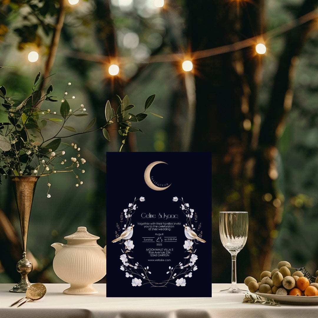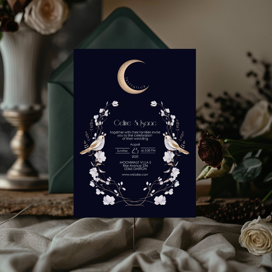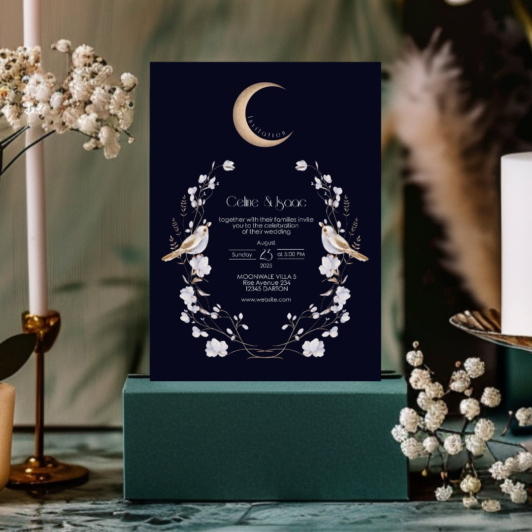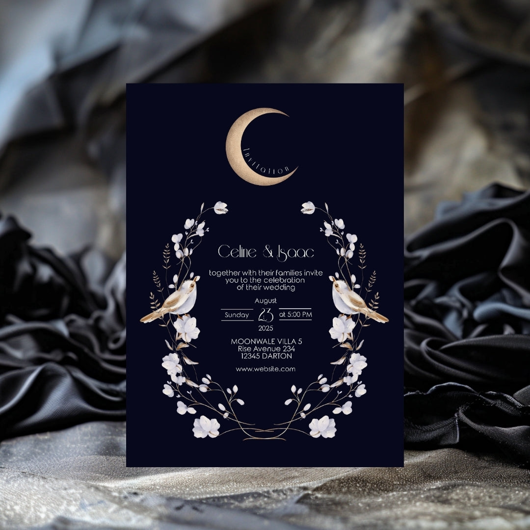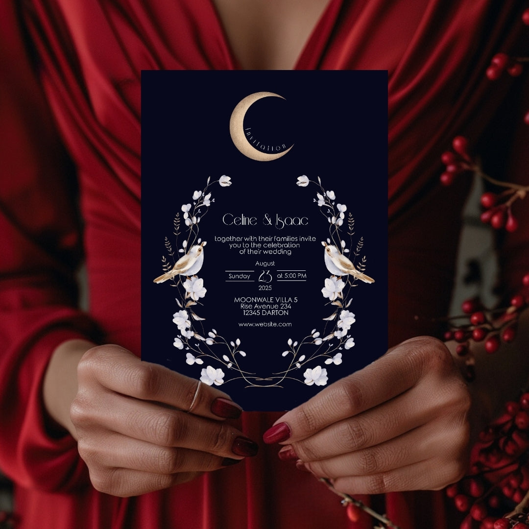 Present the details of your upcoming nuptials with this exquisite Celestial Floral Bird Invitation. The invitation marries the mystery of the night sky with the delicate allure of nature, featuring a beige golden crescent moon nestled among a wreath of white minimalist florals and charming birds. Perfect for a wedding under the stars, an elegant anniversary, or a sophisticated gala, this navy and gold digital template allows for seamless personalization on Corjl, ensuring your invitation is as unique as the event it heralds.