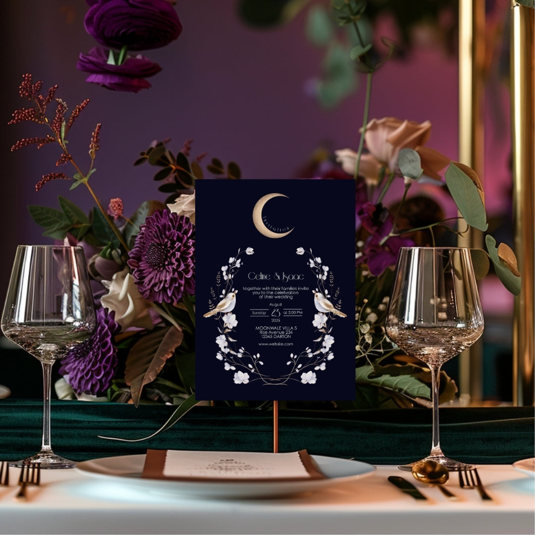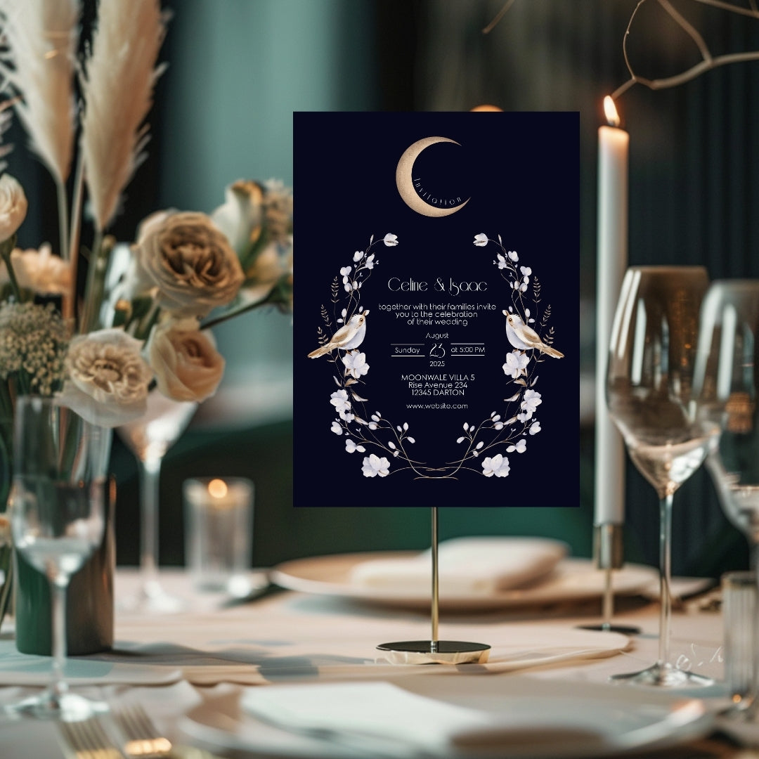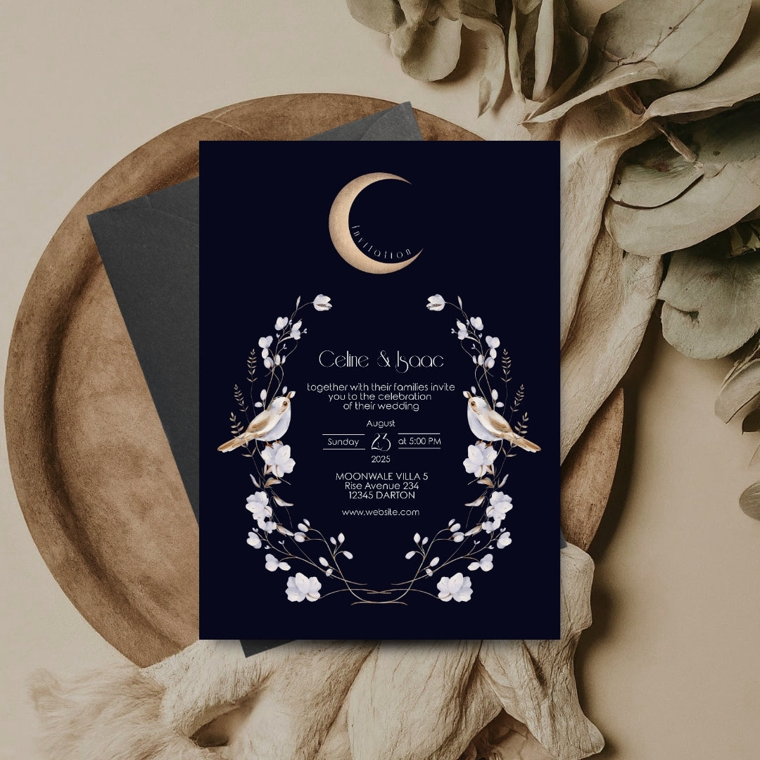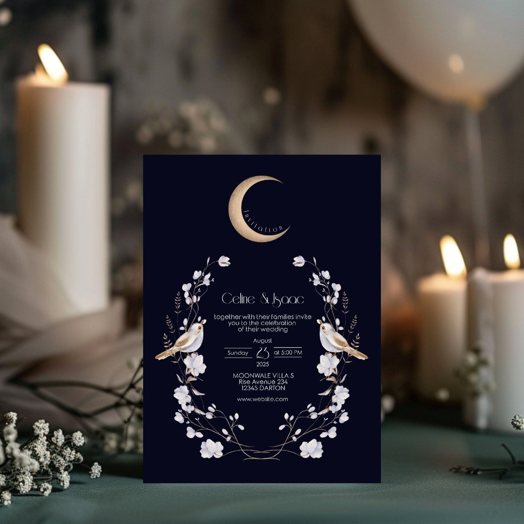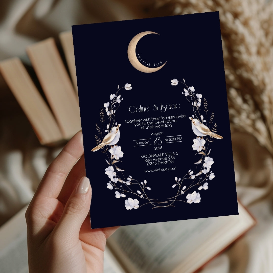 Present the details of your upcoming nuptials with this exquisite Celestial Floral Bird Invitation. The invitation marries the mystery of the night sky with the delicate allure of nature, featuring a beige golden crescent moon nestled among a wreath of white minimalist florals and charming birds. Perfect for a wedding under the stars, an elegant anniversary, or a sophisticated gala, this navy and gold digital template allows for seamless personalization on Corjl, ensuring your invitation is as unique as the event it heralds.
