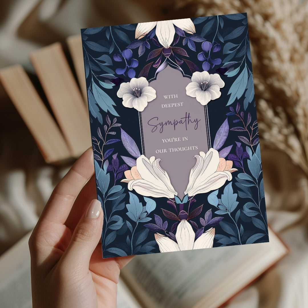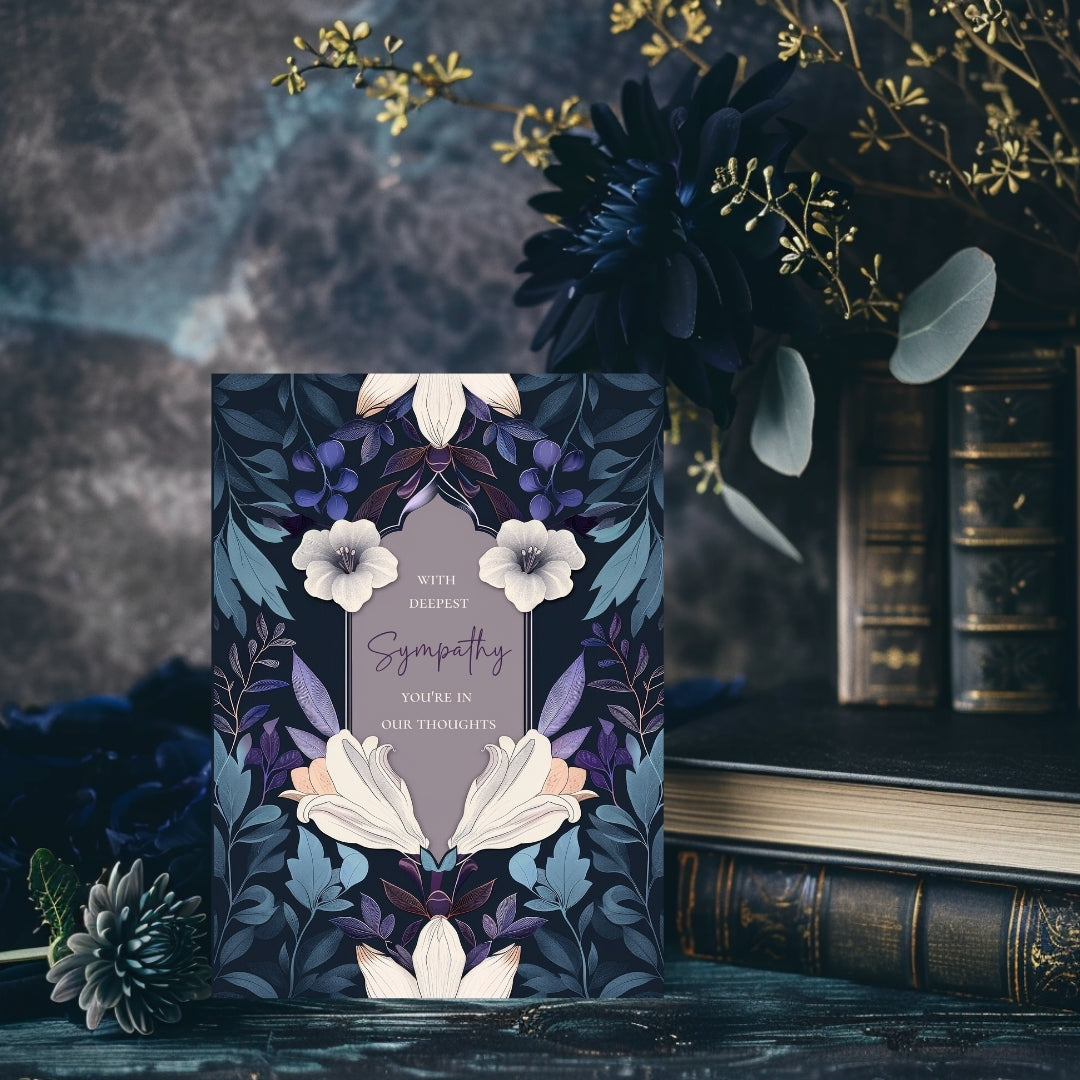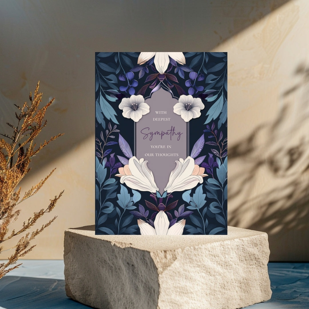 Our sympathy card features a dark navy background adorned with beautifully detailed floral elements in soft shades of cream, lavender, and blue. The centralized text is framed by a symmetrical arrangement of flowers and leaves, adding a touch of nature-inspired elegance.