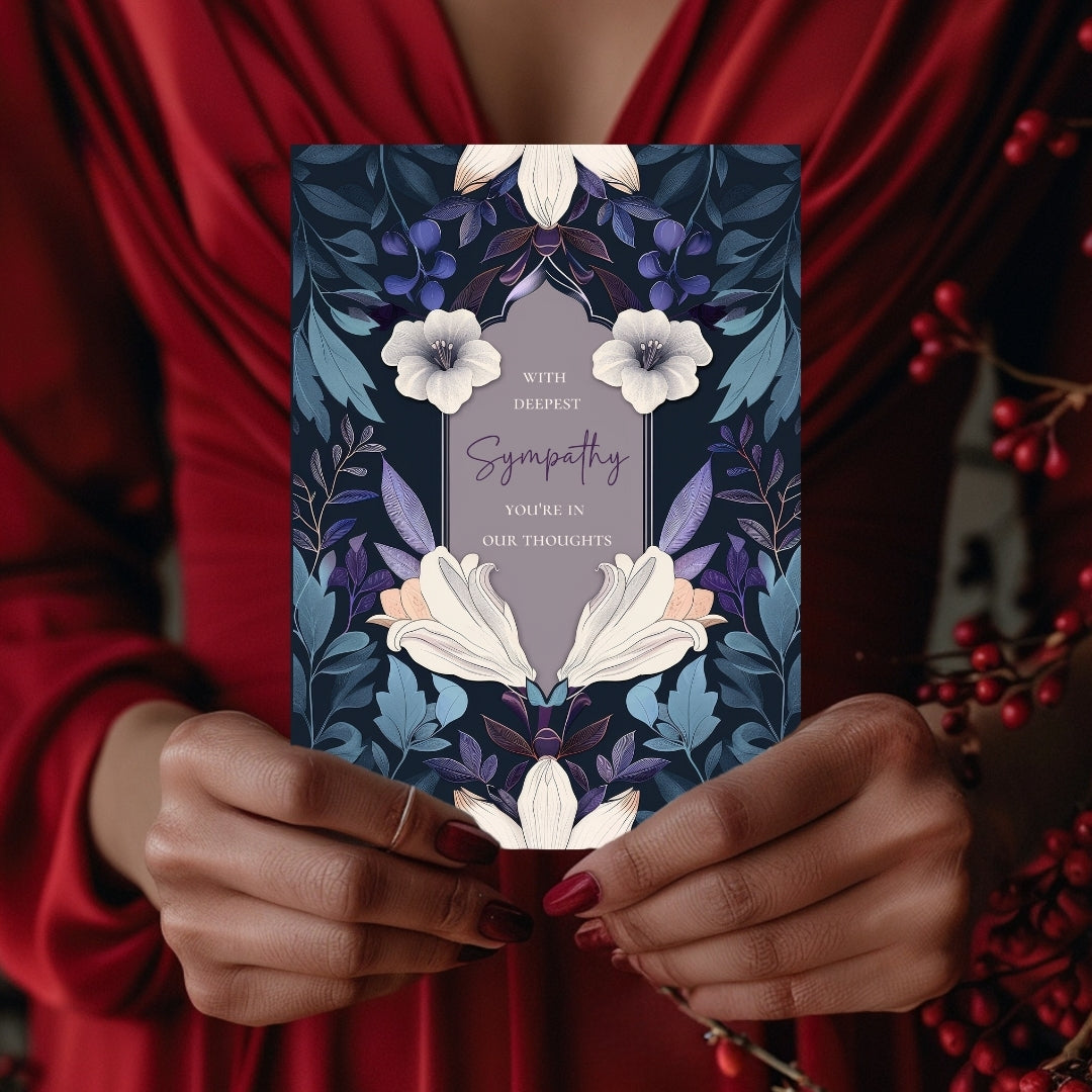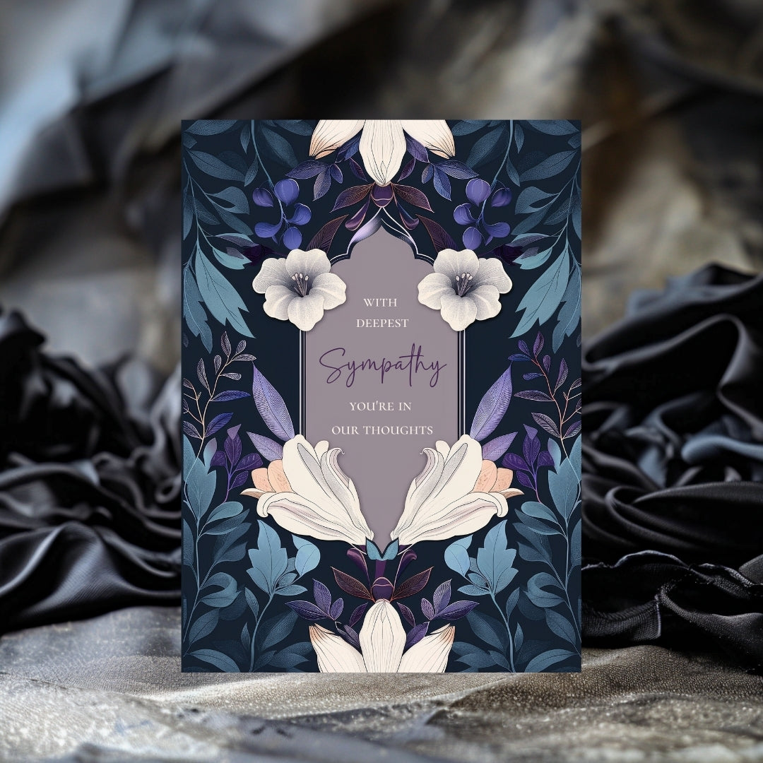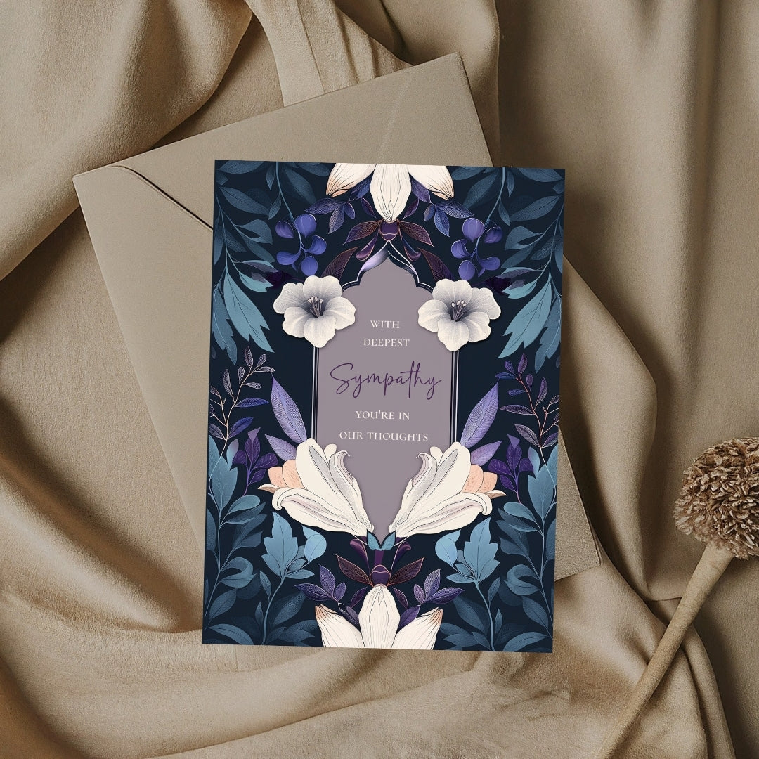 Our sympathy card features a dark navy background adorned with beautifully detailed floral elements in soft shades of cream, lavender, and blue. The centralized text is framed by a symmetrical arrangement of flowers and leaves, adding a touch of nature-inspired elegance.