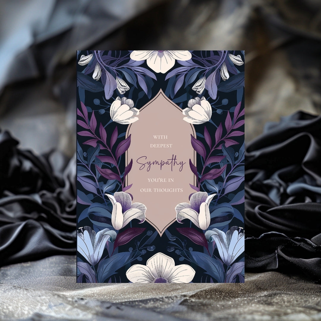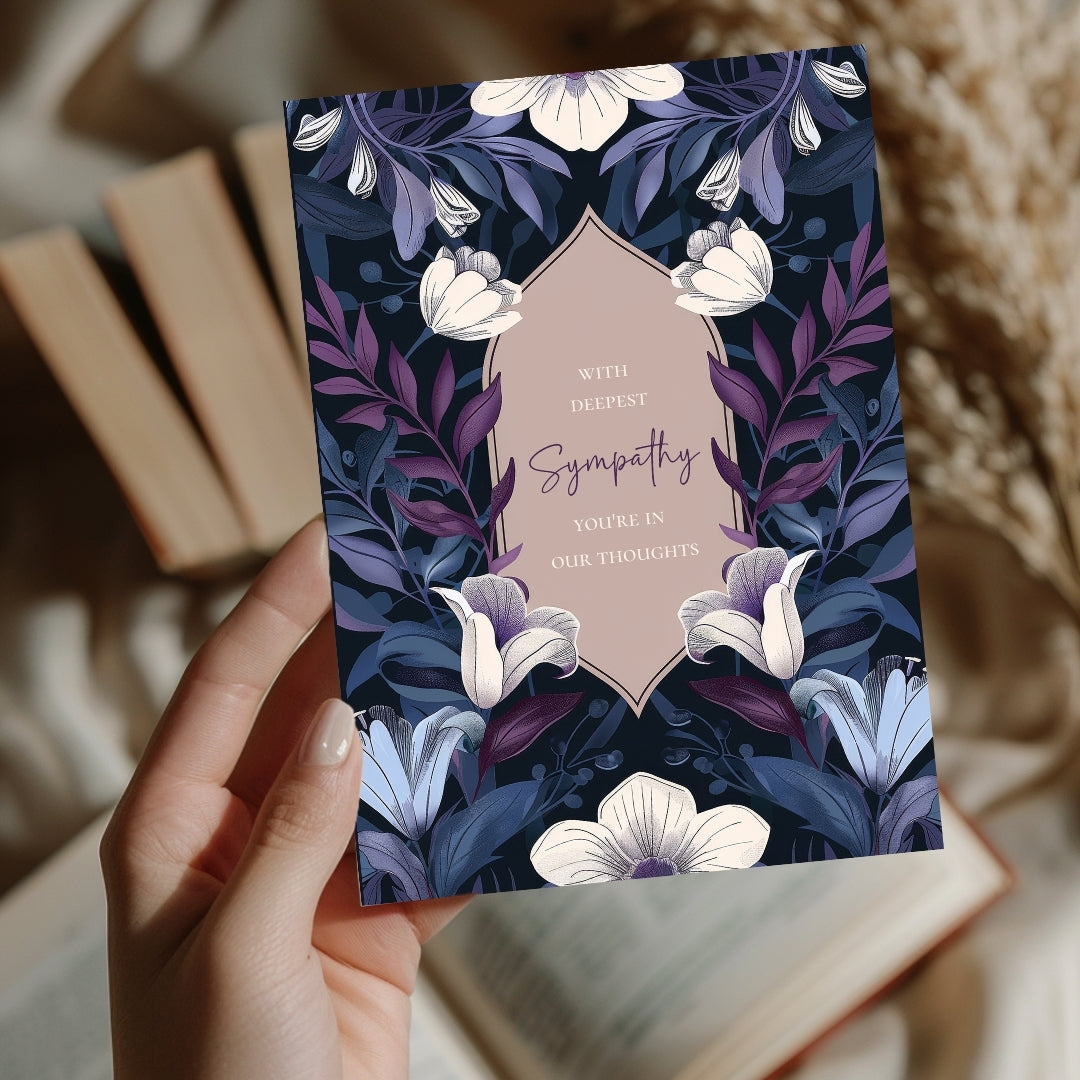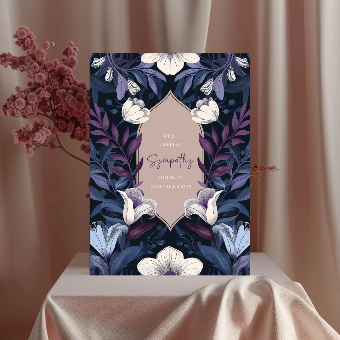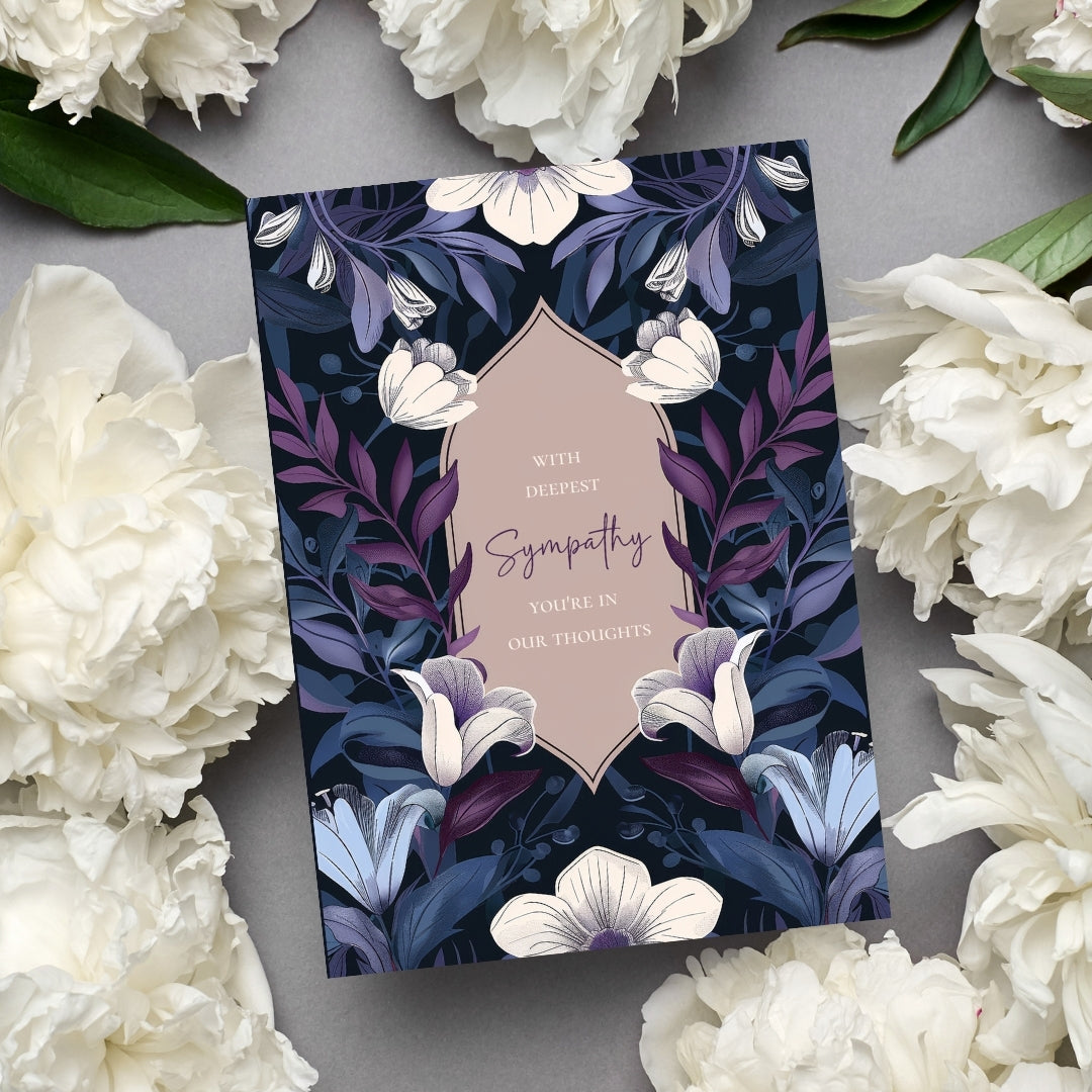 Our sympathy card features a dark navy background adorned with beautifully detailed floral elements in soothing shades of lavender, white, and cream. The centralized text is framed by a symmetrical arrangement of lilies and leaves, adding a touch of nature-inspired elegance.