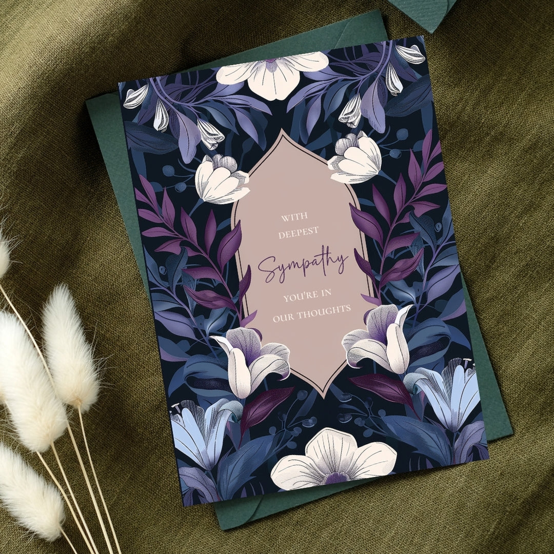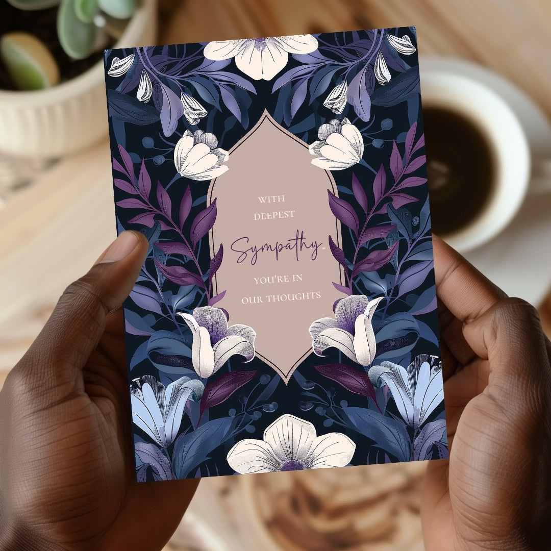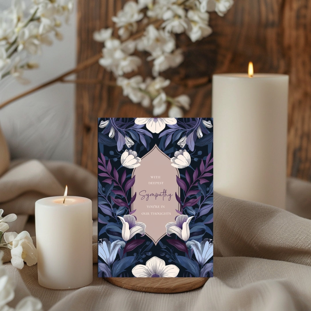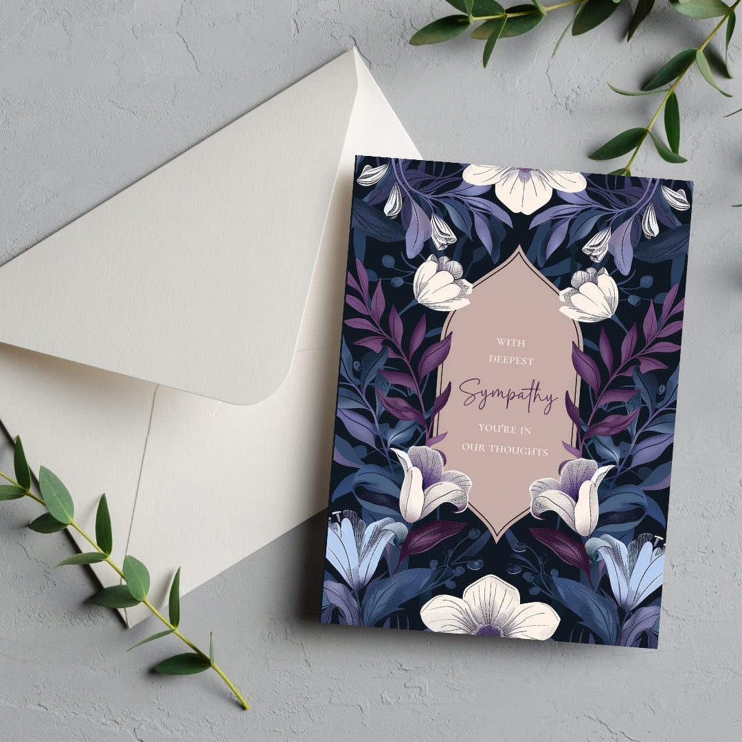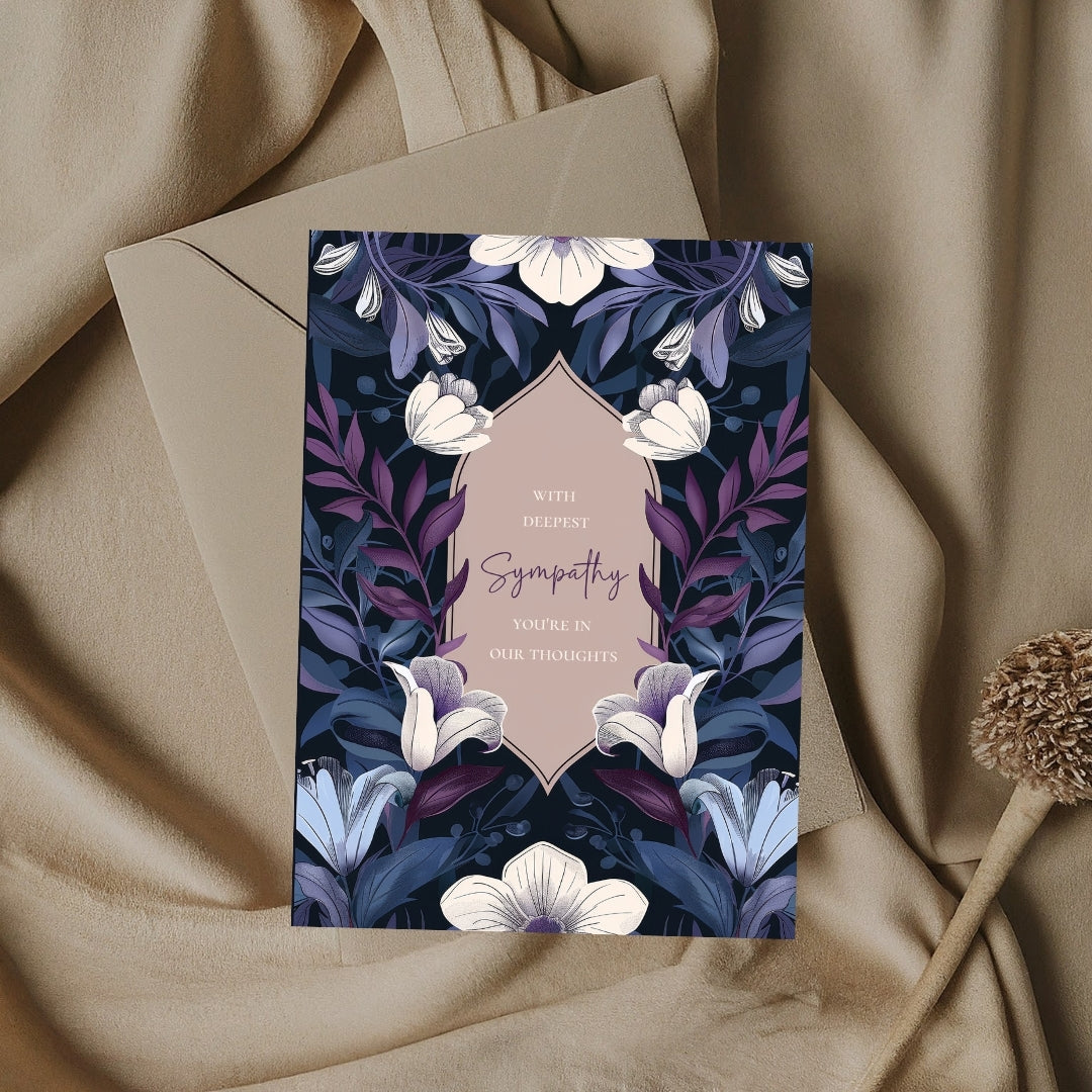 Our sympathy card features a dark navy background adorned with beautifully detailed floral elements in soothing shades of lavender, white, and cream. The centralized text is framed by a symmetrical arrangement of lilies and leaves, adding a touch of nature-inspired elegance.