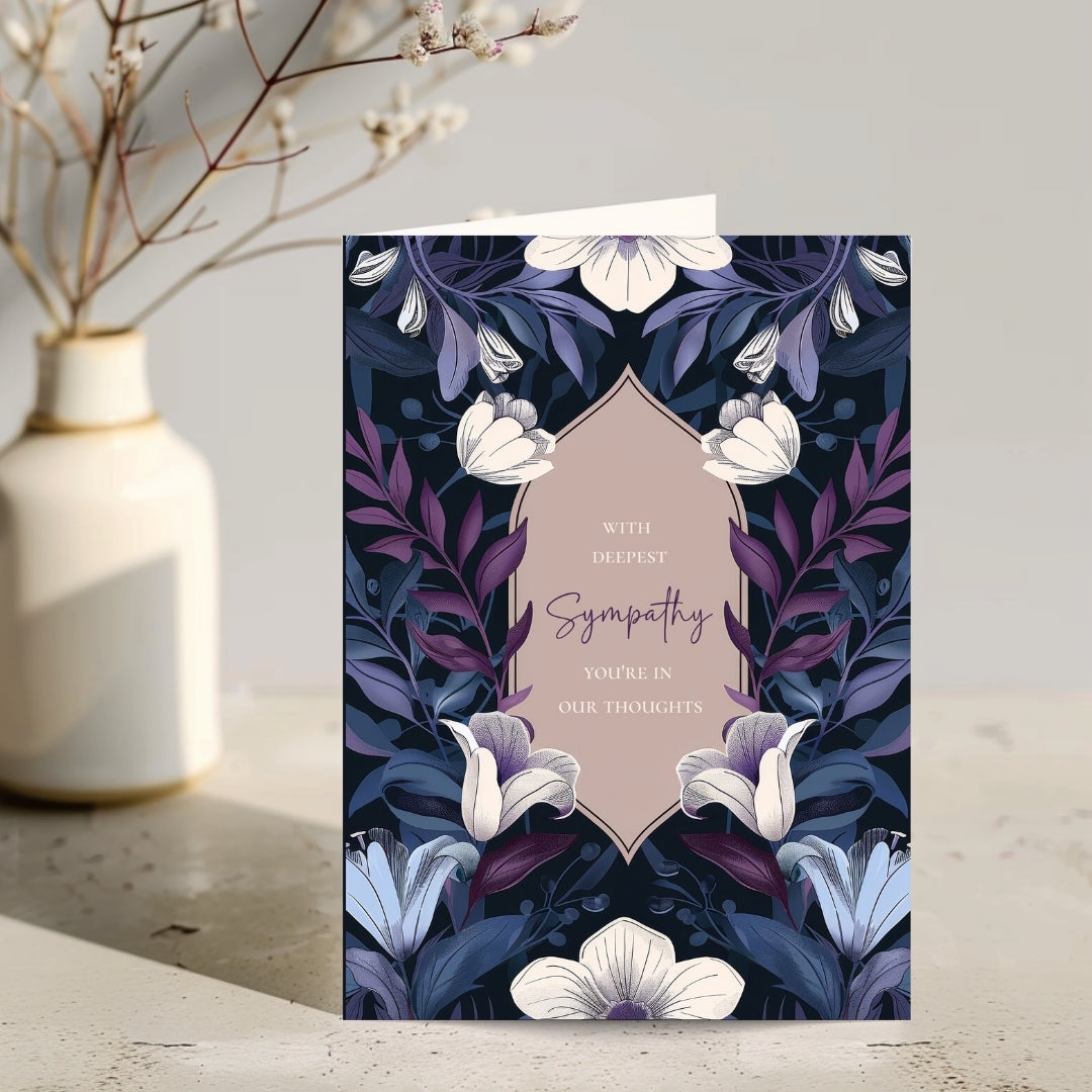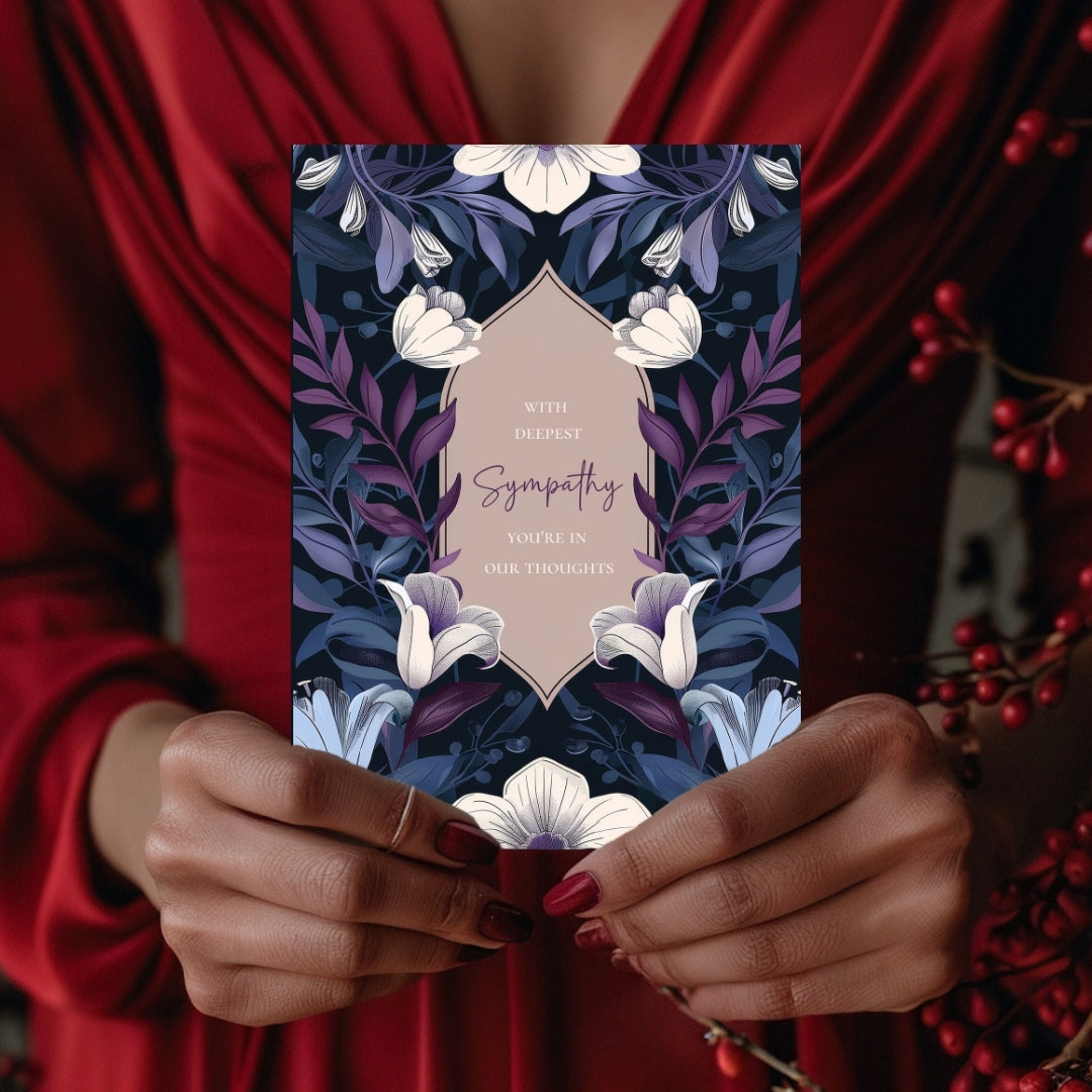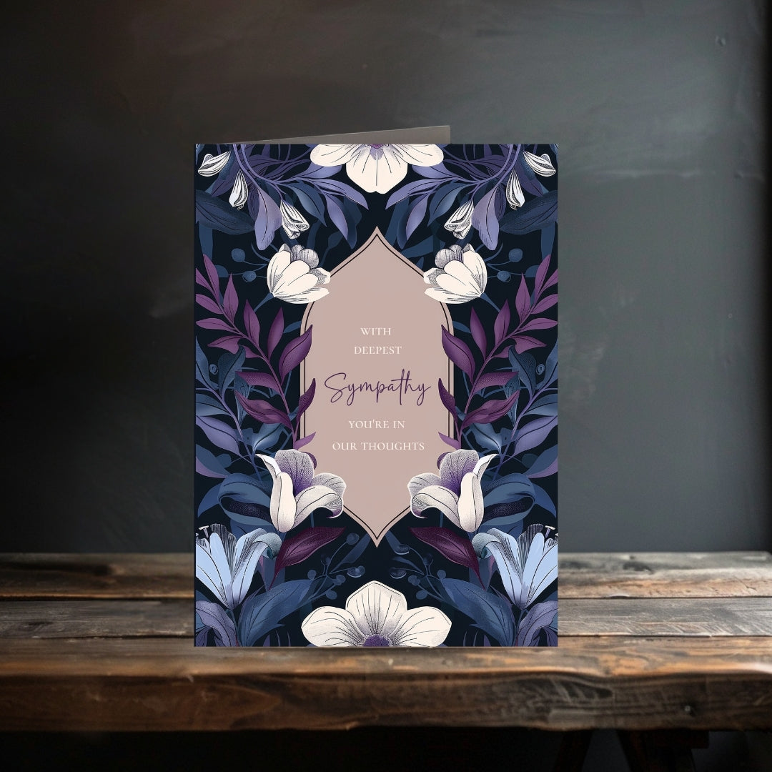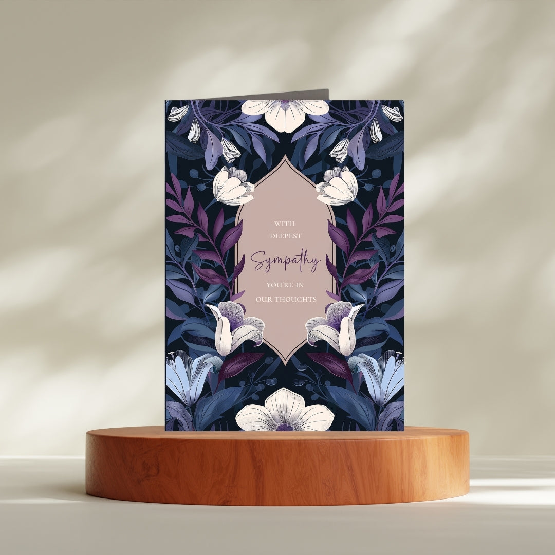 Our sympathy card features a dark navy background adorned with beautifully detailed floral elements in soothing shades of lavender, white, and cream. The centralized text is framed by a symmetrical arrangement of lilies and leaves, adding a touch of nature-inspired elegance.