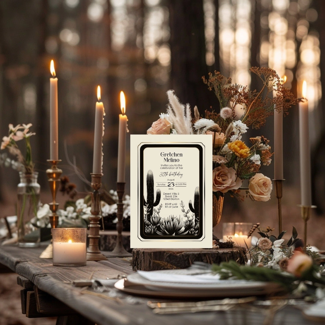 Elegant Desert Noir Birthday Invitation - Black and White Botanical Design