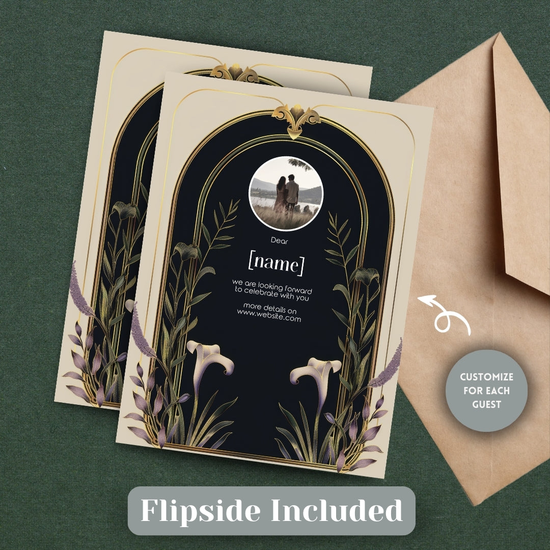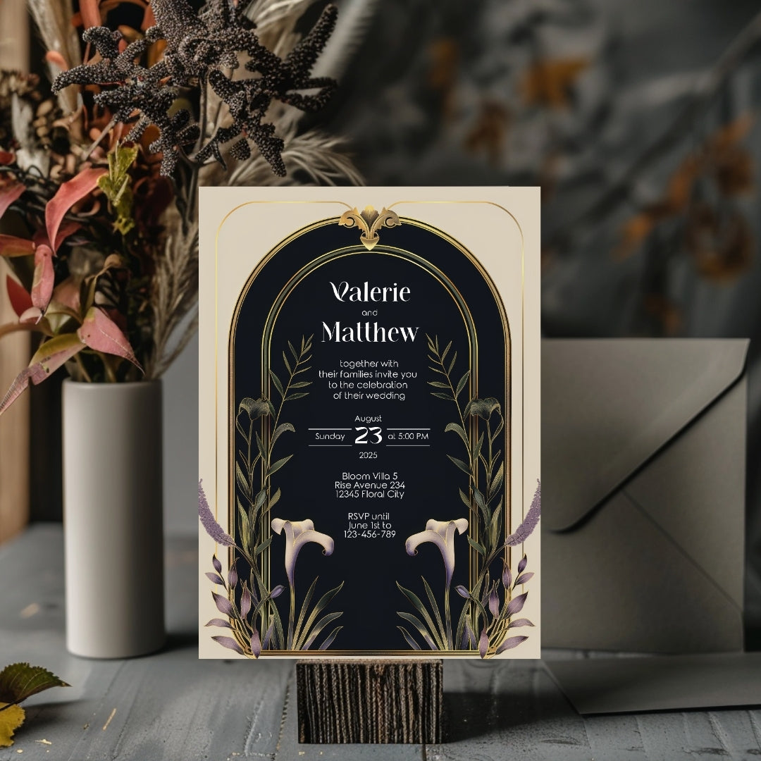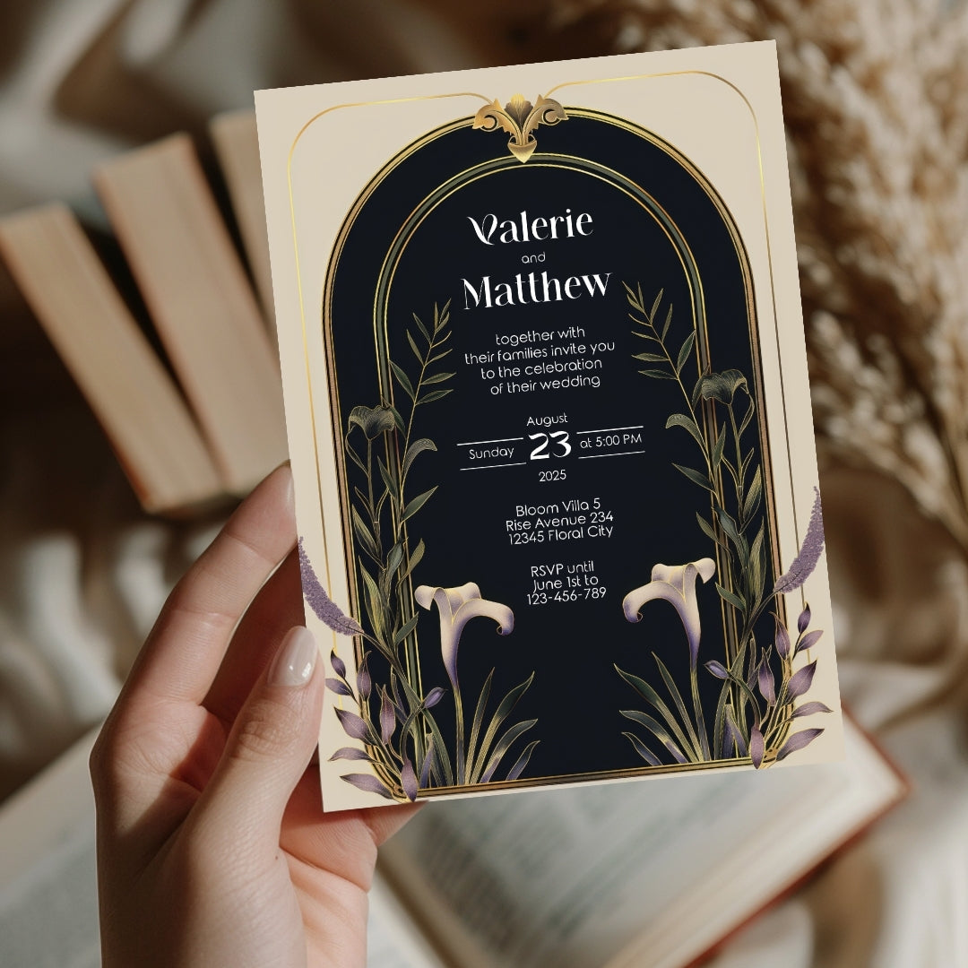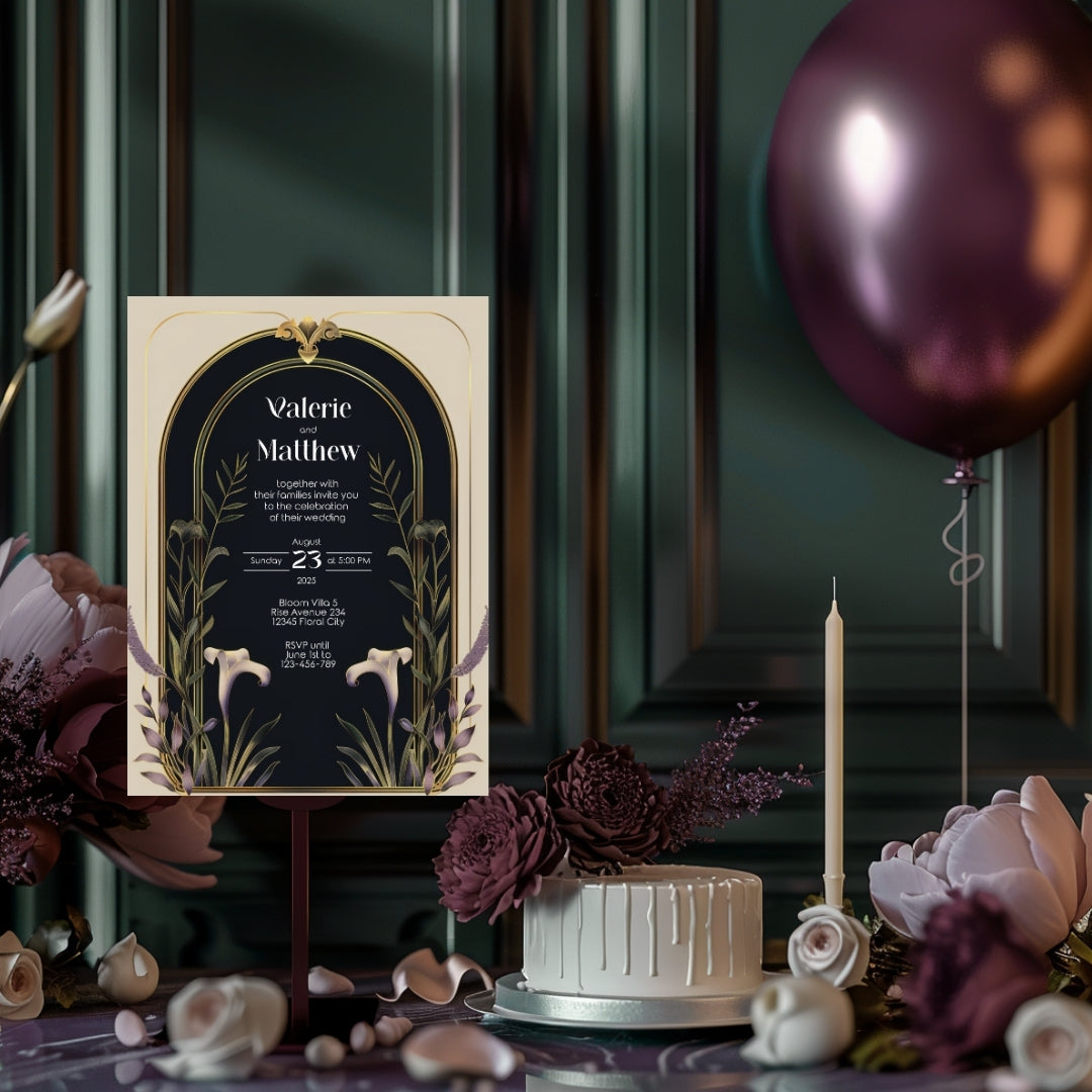 Step through the archway into a world of timeless romance with our Gilded Elegance Archway Wedding Invitation. This bespoke digital template is a masterpiece of design, marrying the architectural beauty of golden arches with the delicate whisper of lilac florals, all set against a classic black canvas. The contrasting colors come together to create an invitation that is both majestic and inviting, perfect for announcing your wedding, anniversary, or any grand soirée. Personalize your details with ease using Corjl, and choose to present your message in print or through elegant digital correspondence. This invitation is the beginning of your story, one that you and your guests will cherish for years to come.
