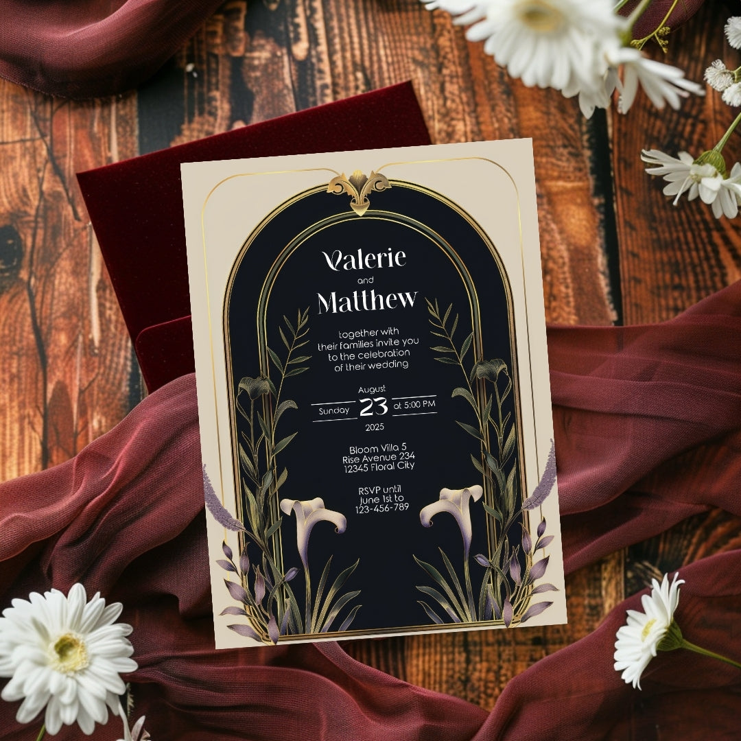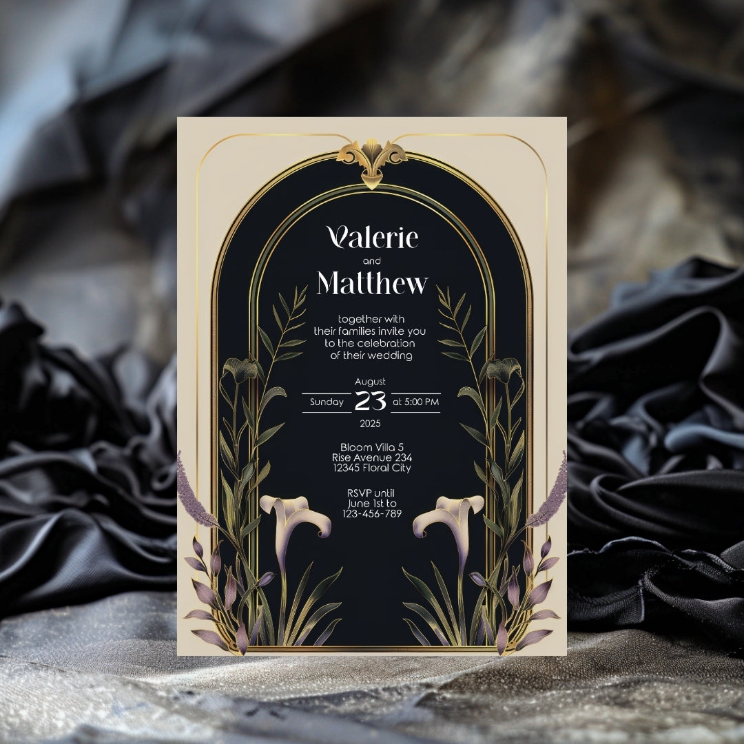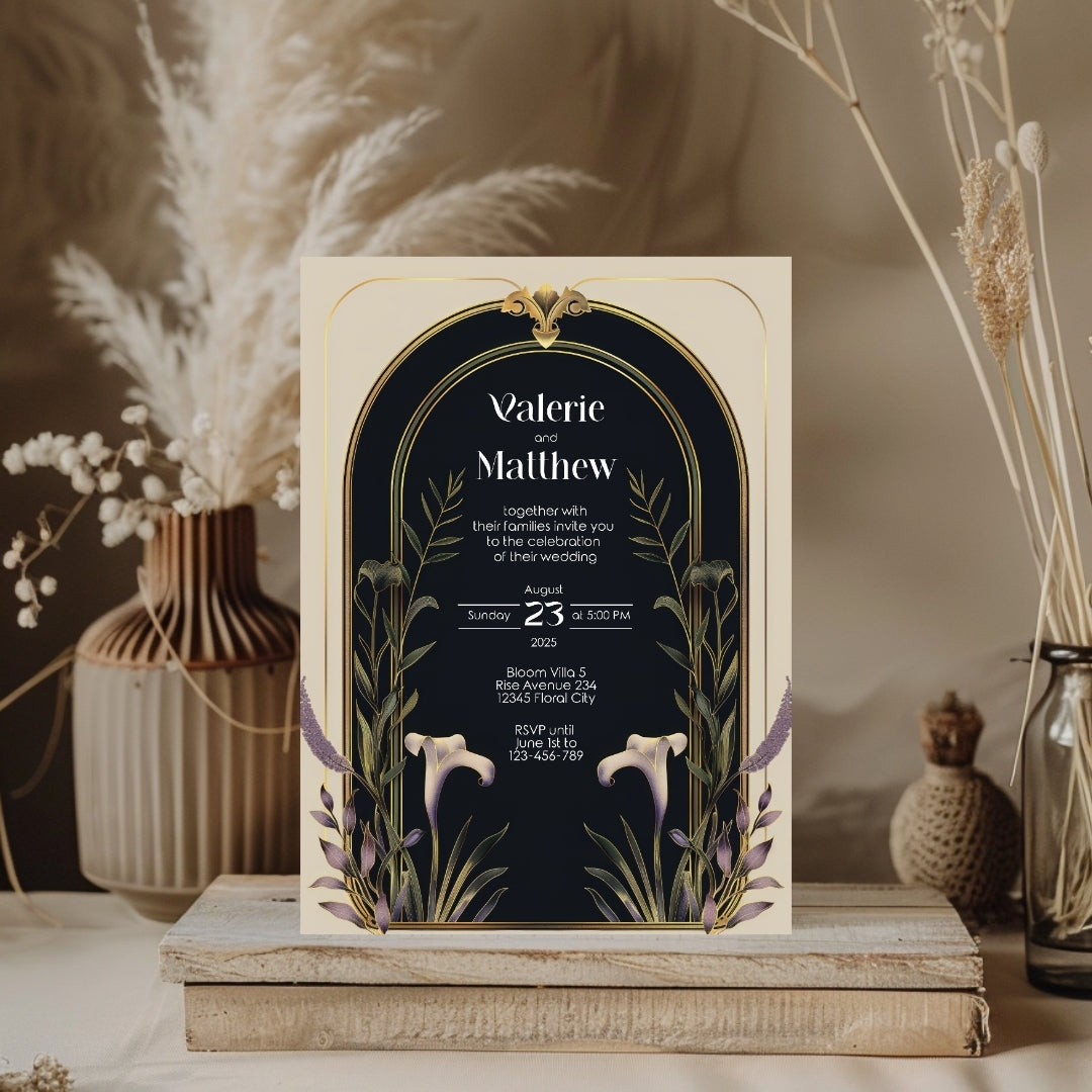 Step through the archway into a world of timeless romance with our Gilded Elegance Archway Wedding Invitation. This bespoke digital template is a masterpiece of design, marrying the architectural beauty of golden arches with the delicate whisper of lilac florals, all set against a classic black canvas. The contrasting colors come together to create an invitation that is both majestic and inviting, perfect for announcing your wedding, anniversary, or any grand soirée. Personalize your details with ease using Corjl, and choose to present your message in print or through elegant digital correspondence. This invitation is the beginning of your story, one that you and your guests will cherish for years to come.