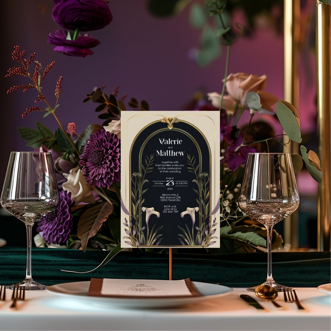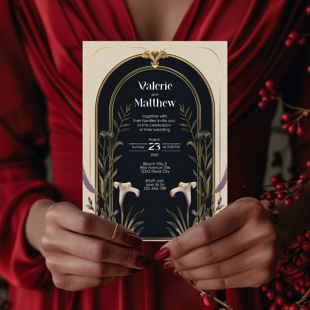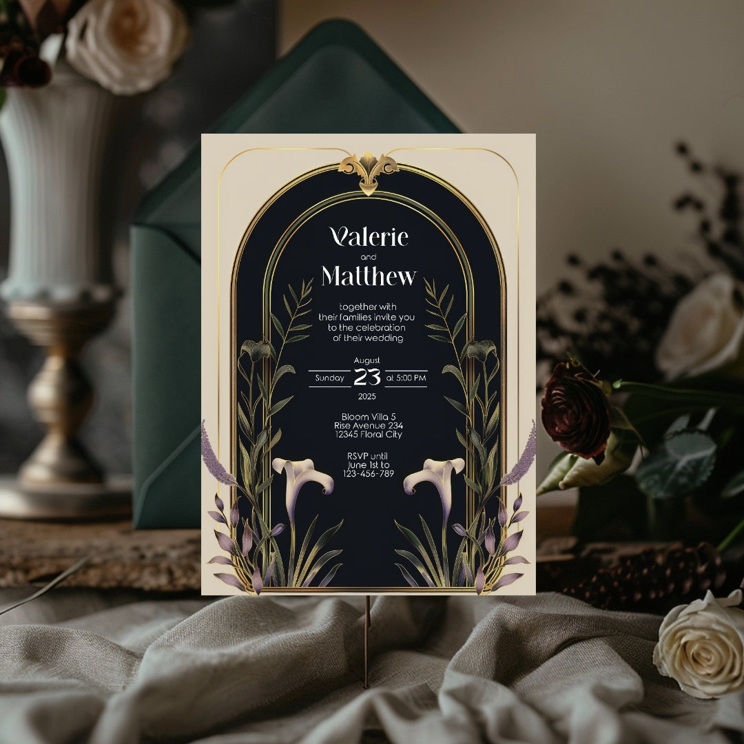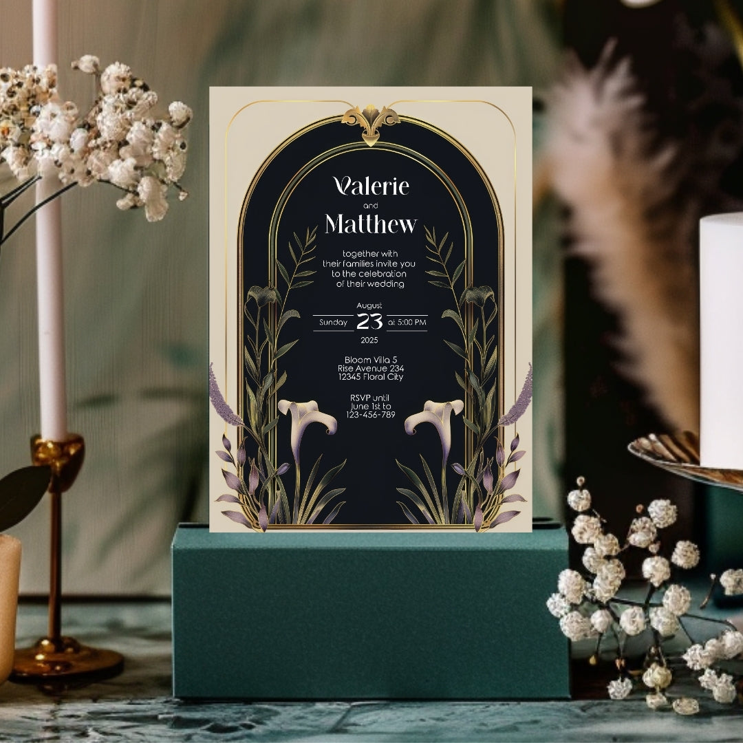 Step through the archway into a world of timeless romance with our Gilded Elegance Archway Wedding Invitation. This bespoke digital template is a masterpiece of design, marrying the architectural beauty of golden arches with the delicate whisper of lilac florals, all set against a classic black canvas. The contrasting colors come together to create an invitation that is both majestic and inviting, perfect for announcing your wedding, anniversary, or any grand soirée. Personalize your details with ease using Corjl, and choose to present your message in print or through elegant digital correspondence. This invitation is the beginning of your story, one that you and your guests will cherish for years to come.