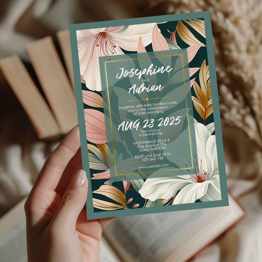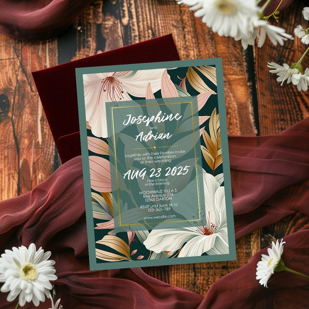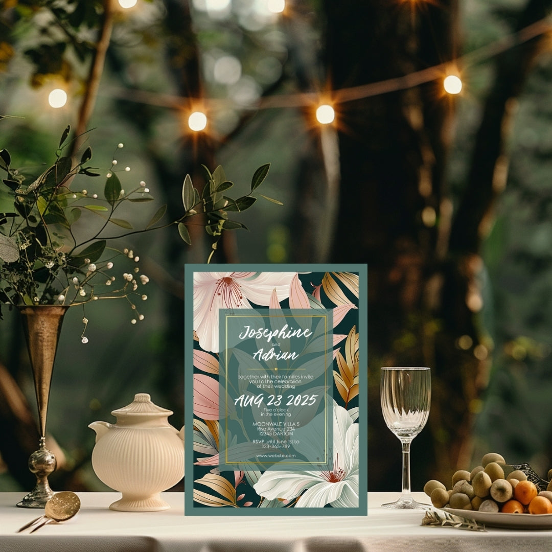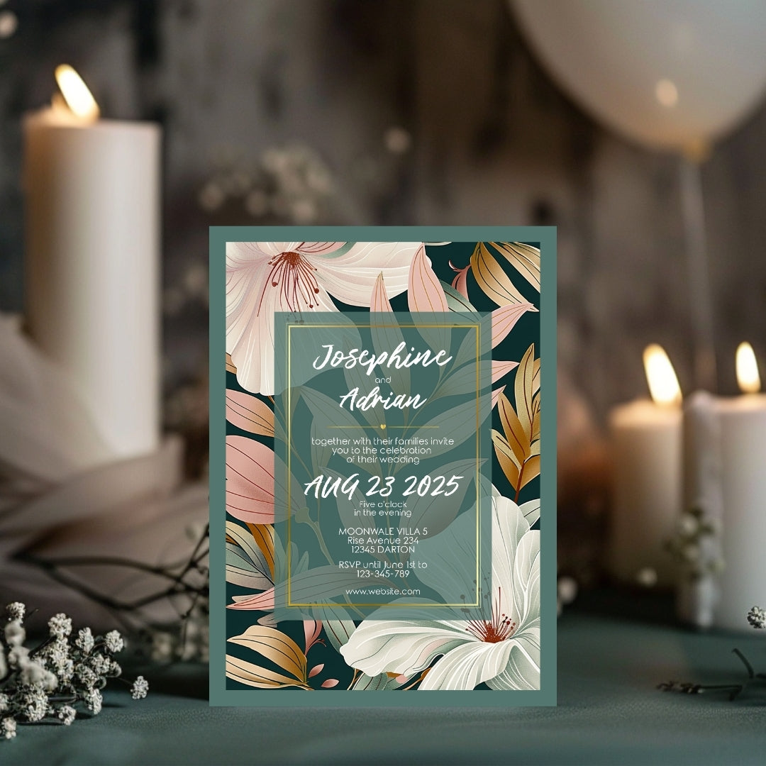 Wrap your event in the warmth of our Botanical Elegance Invitation, a digital template that offers a modern yet timeless appeal for your celebratory gathering. Whether for a wedding, a significant anniversary, or a momentous birthday, these invitations are adorned with stylized lily illustrations in soft pastel tones, poised against a dark green backdrop for dramatic effect. The golden geometric lines add a touch of luxury, framing the blooms in a dance of elegance and style. Customizable via Corjl, this design grants you the flexibility to personalize each element, ensuring your invitation resonates with the unique spirit of your occasion.