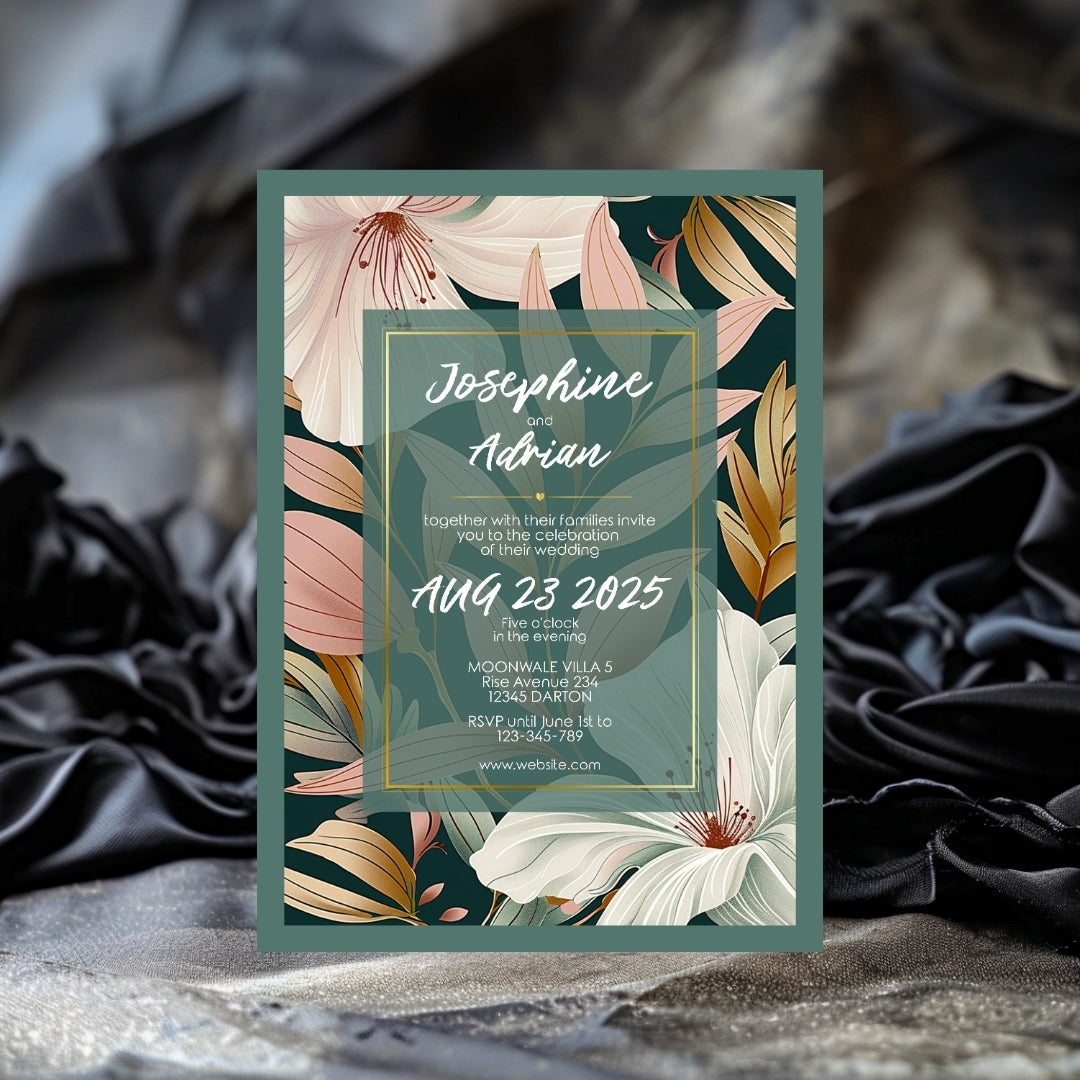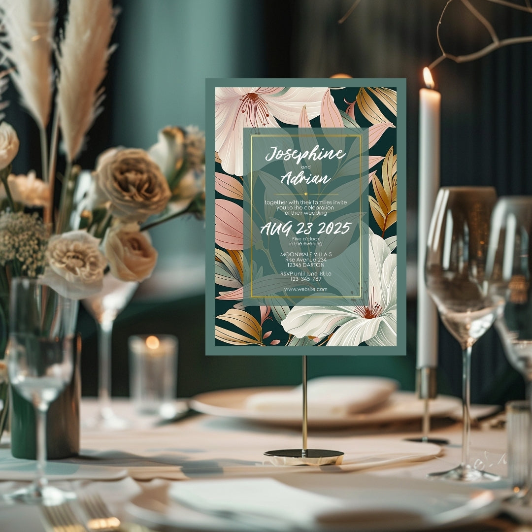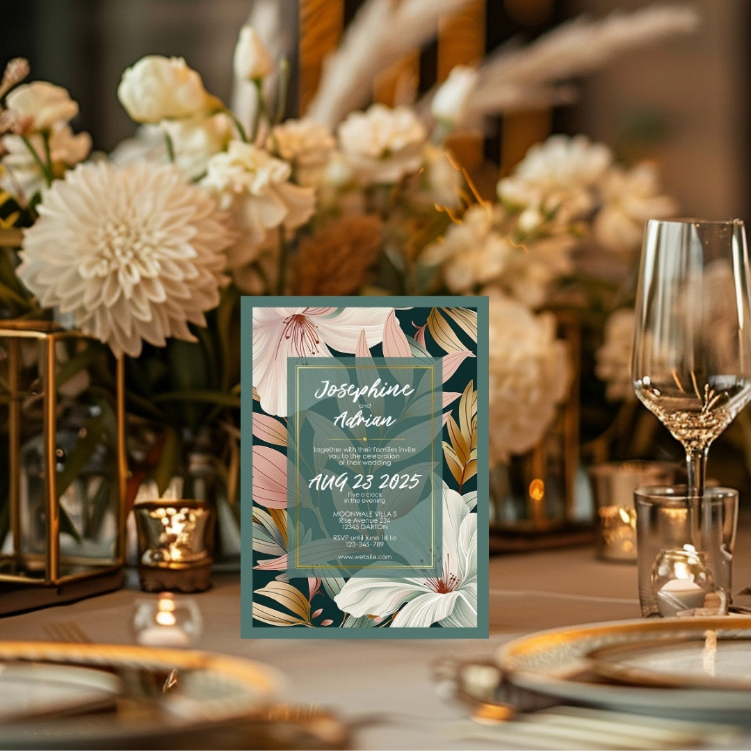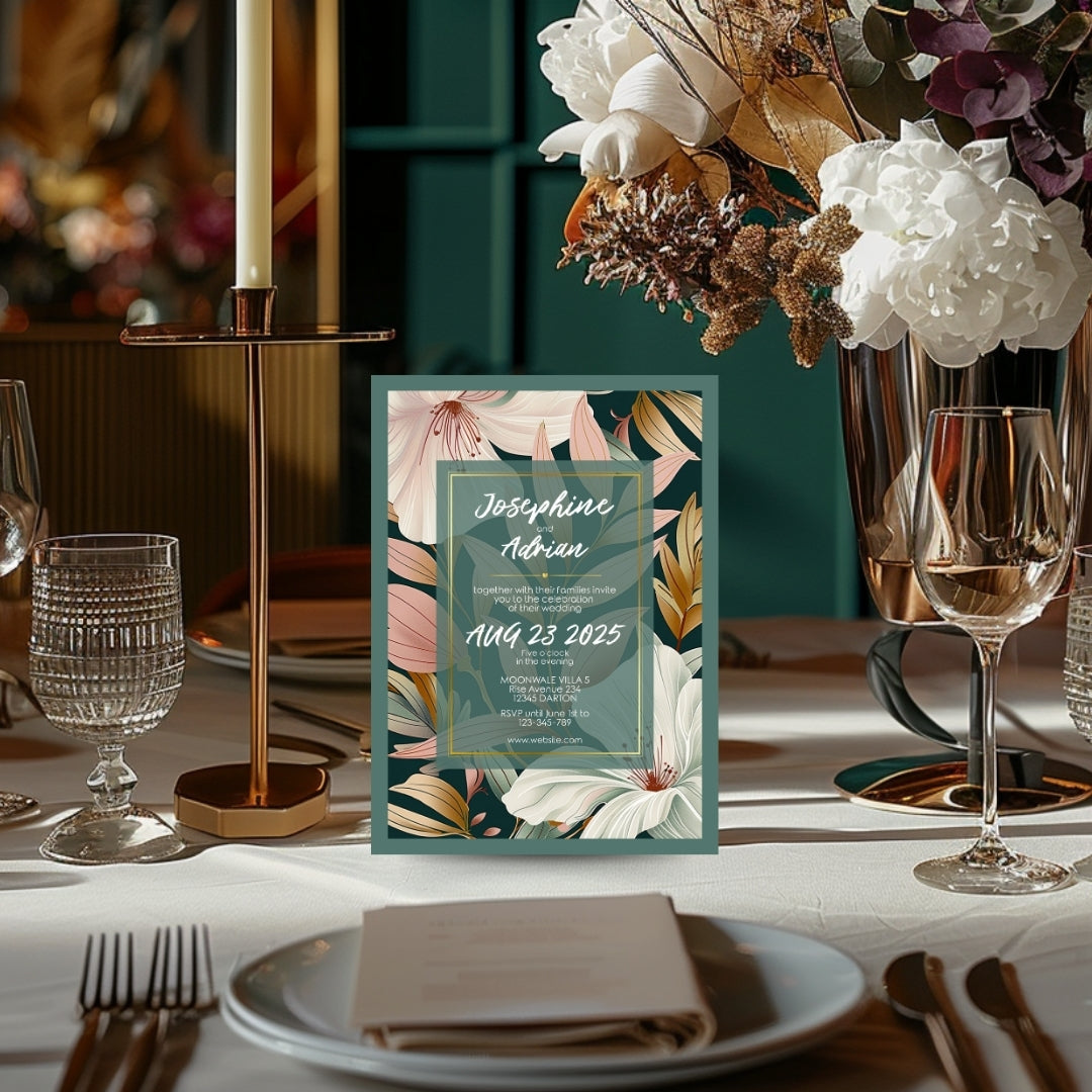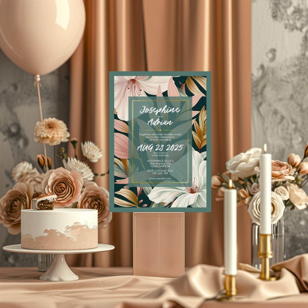 Wrap your event in the warmth of our Botanical Elegance Invitation, a digital template that offers a modern yet timeless appeal for your celebratory gathering. Whether for a wedding, a significant anniversary, or a momentous birthday, these invitations are adorned with stylized lily illustrations in soft pastel tones, poised against a dark green backdrop for dramatic effect. The golden geometric lines add a touch of luxury, framing the blooms in a dance of elegance and style. Customizable via Corjl, this design grants you the flexibility to personalize each element, ensuring your invitation resonates with the unique spirit of your occasion.