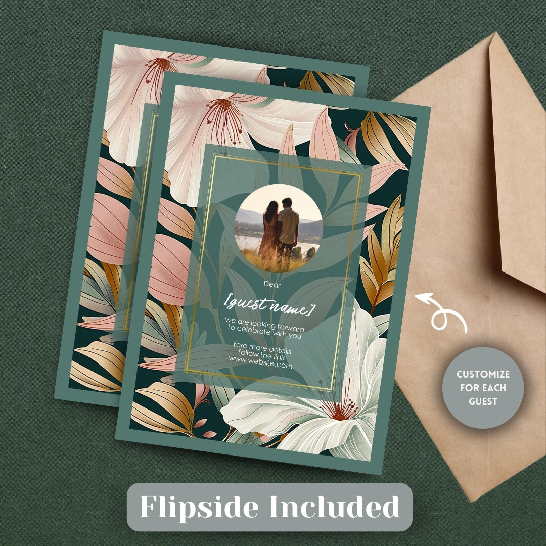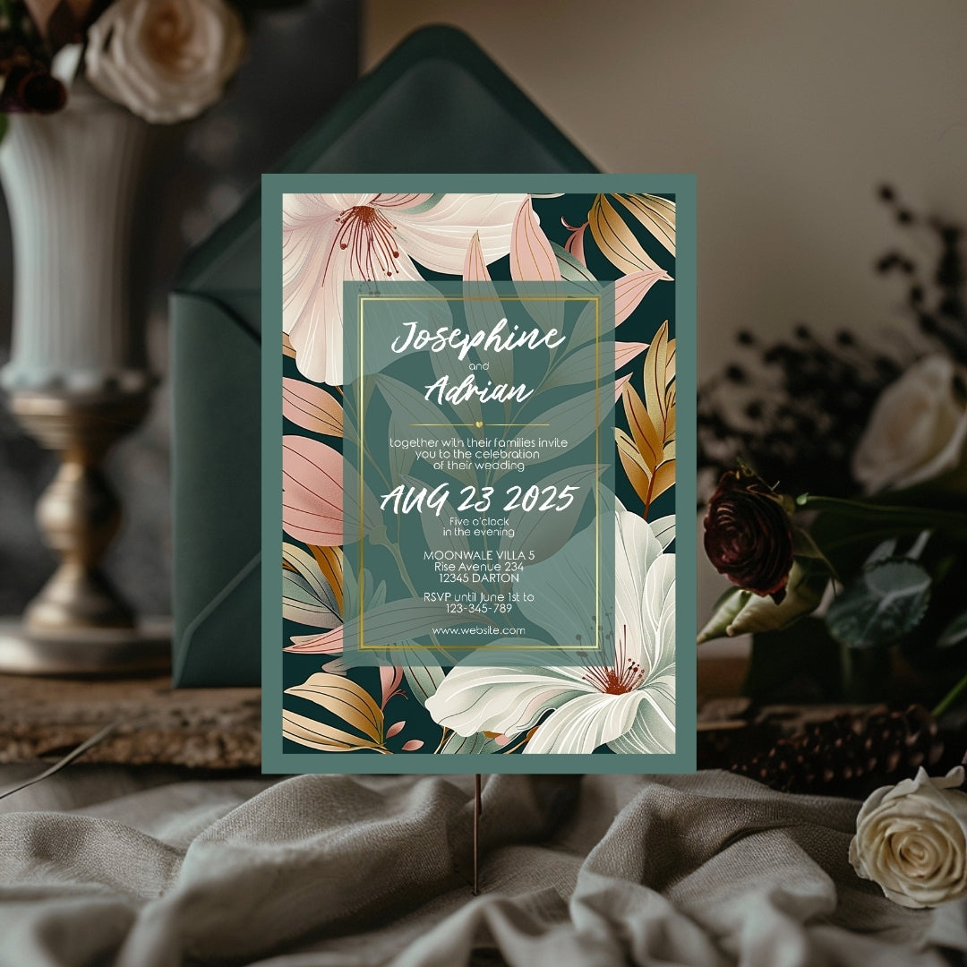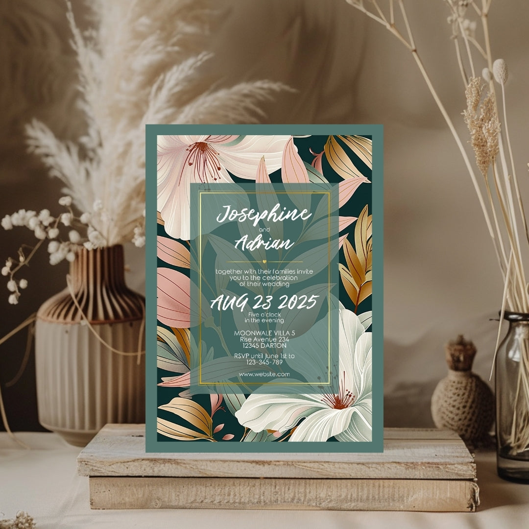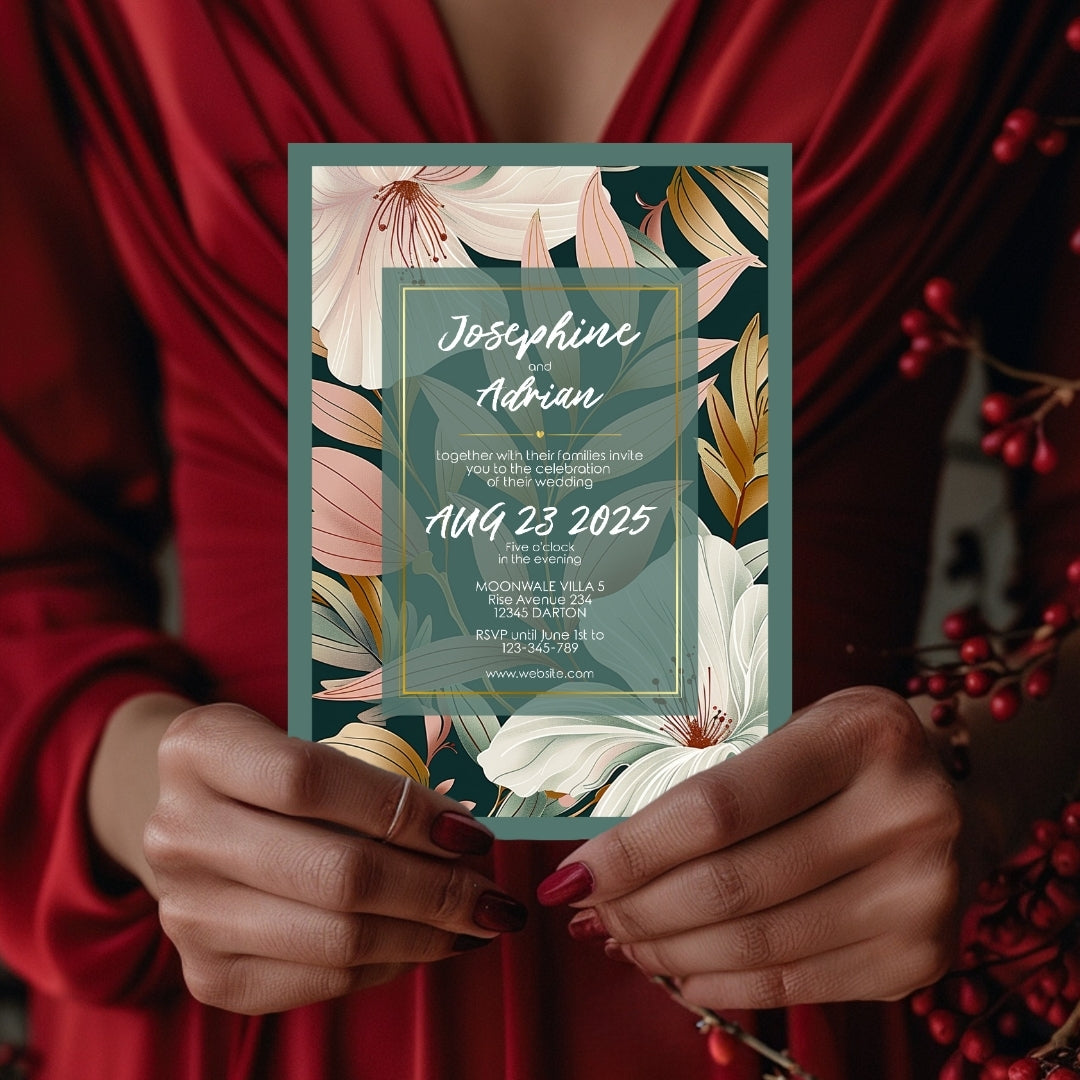 Wrap your event in the warmth of our Botanical Elegance Invitation, a digital template that offers a modern yet timeless appeal for your celebratory gathering. Whether for a wedding, a significant anniversary, or a momentous birthday, these invitations are adorned with stylized lily illustrations in soft pastel tones, poised against a dark green backdrop for dramatic effect. The golden geometric lines add a touch of luxury, framing the blooms in a dance of elegance and style. Customizable via Corjl, this design grants you the flexibility to personalize each element, ensuring your invitation resonates with the unique spirit of your occasion.