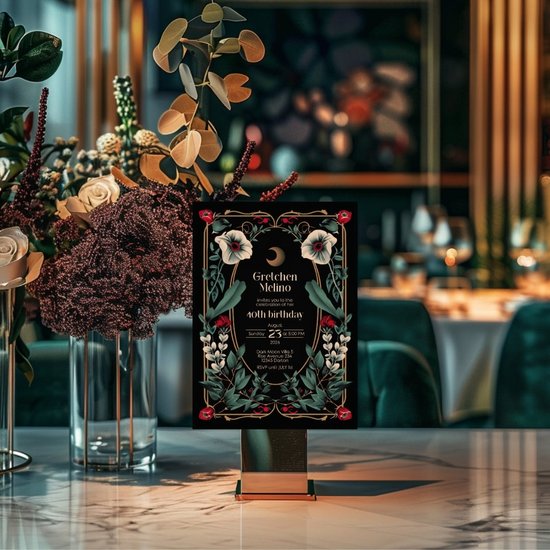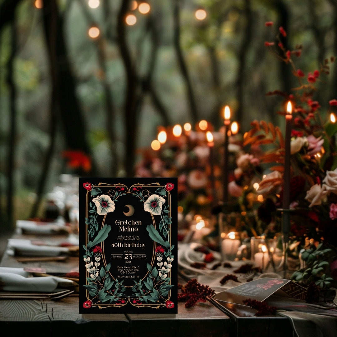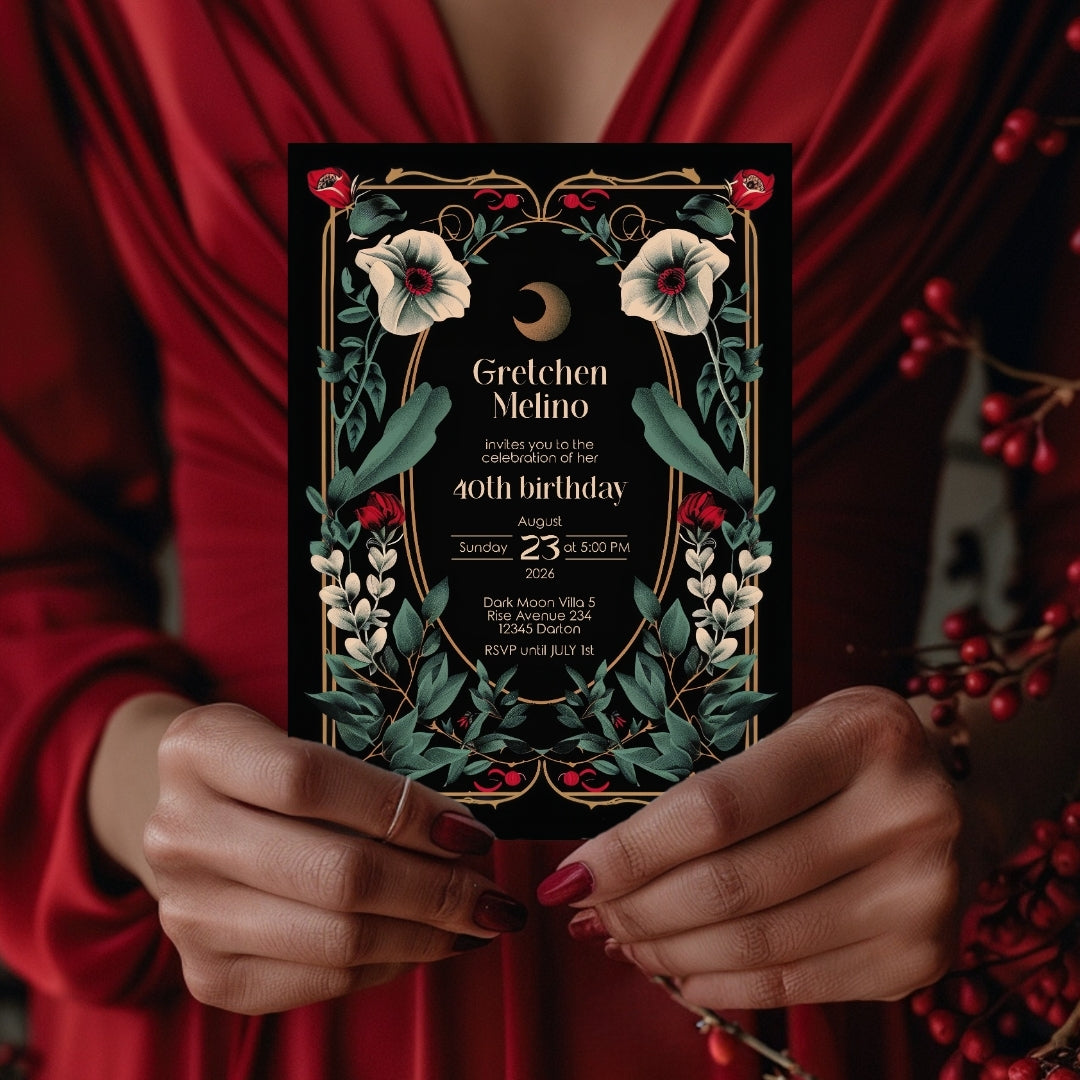 Step into an enchanting world with our Elegant Gothic Botanical Birthday Invitation. This captivating design features a deep black background adorned with intricate gold borders, lush botanical elements, and a crescent moon. The vibrant red and white flowers add a touch of elegance and vintage charm, perfect for celebrating a milestone 40th birthday. Ideal for those who appreciate the unique blend of gothic and botanical aesthetics, this invitation sets the tone for an unforgettable event.