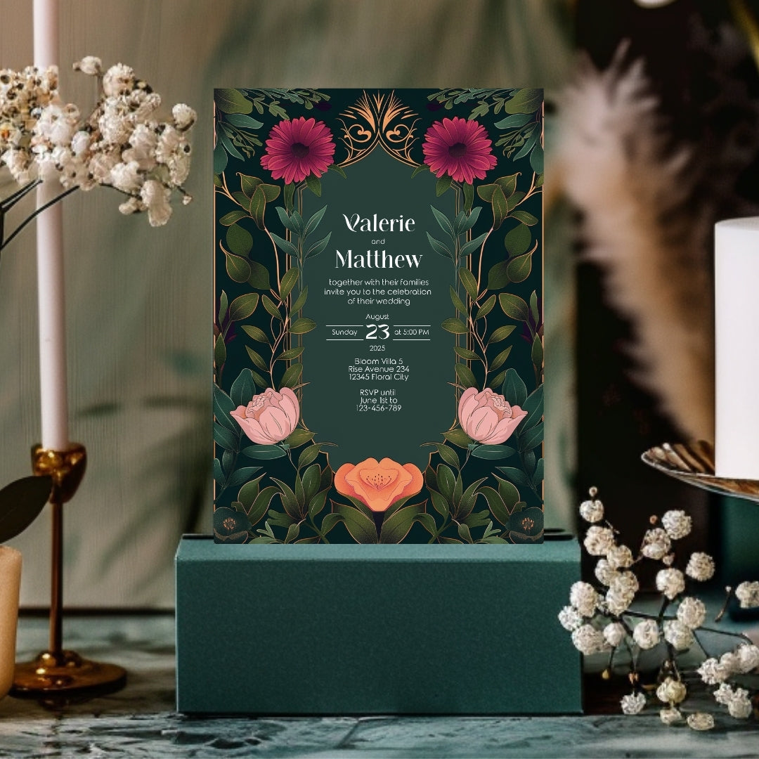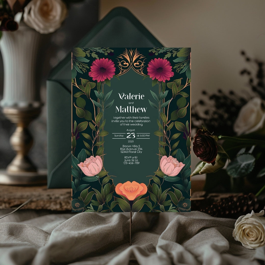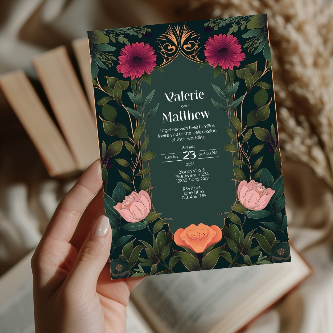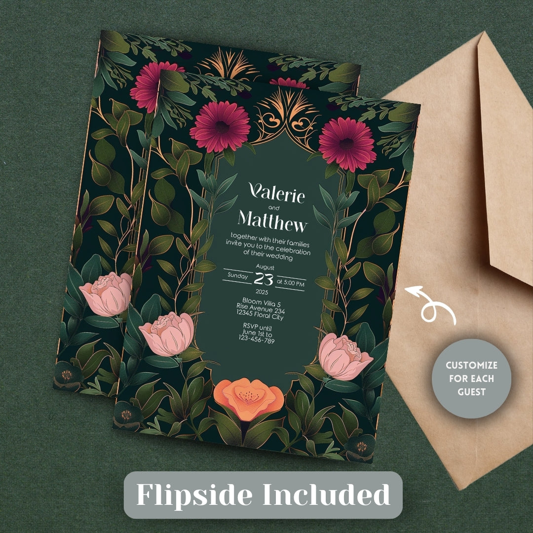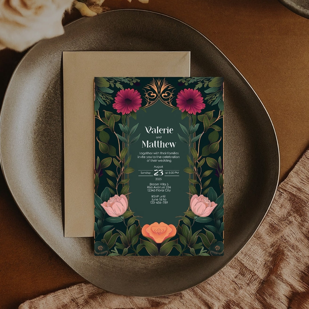 Showcase the splendor of your special day with our Floral Decadence Wedding Invitation. This digital template captures a magnificent dance between color and elegance, featuring vibrant gerbera blooms and delicate roses set against a dark, leafy backdrop. The ornate golden flourishes lend a touch of royal opulence, framing your celebration details with a flourish. Tailor-made for your wedding, this invitation is equally suited for enchanting anniversaries or lavish celebrations. With easy editing through Corjl, you can add a personal signature to your invite, ensuring it's a perfect prelude to the magic that awaits. Bring your guests into a world where love blooms as beautifully as the flowers on this exquisite invitation.