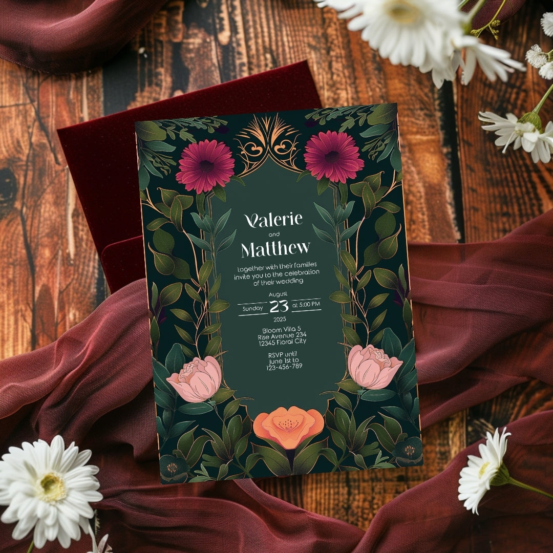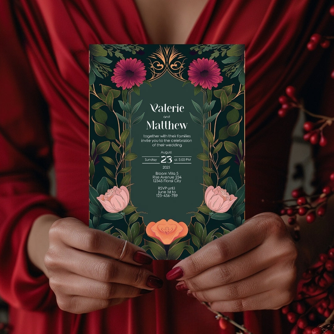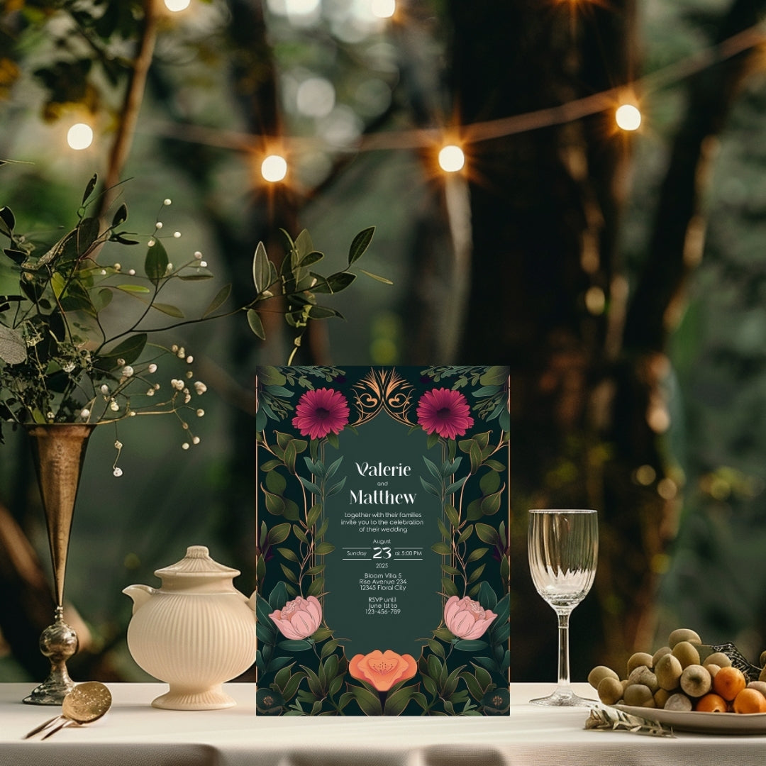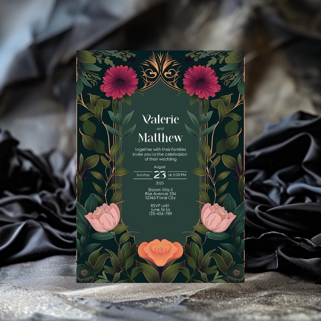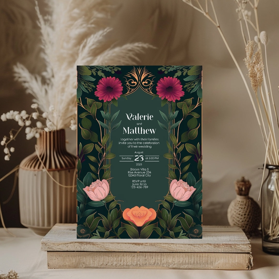Showcase the splendor of your special day with our Floral Decadence Wedding Invitation. This digital template captures a magnificent dance between color and elegance, featuring vibrant gerbera blooms and delicate roses set against a dark, leafy backdrop. The ornate golden flourishes lend a touch of royal opulence, framing your celebration details with a flourish. Tailor-made for your wedding, this invitation is equally suited for enchanting anniversaries or lavish celebrations. With easy editing through Corjl, you can add a personal signature to your invite, ensuring it's a perfect prelude to the magic that awaits. Bring your guests into a world where love blooms as beautifully as the flowers on this exquisite invitation.