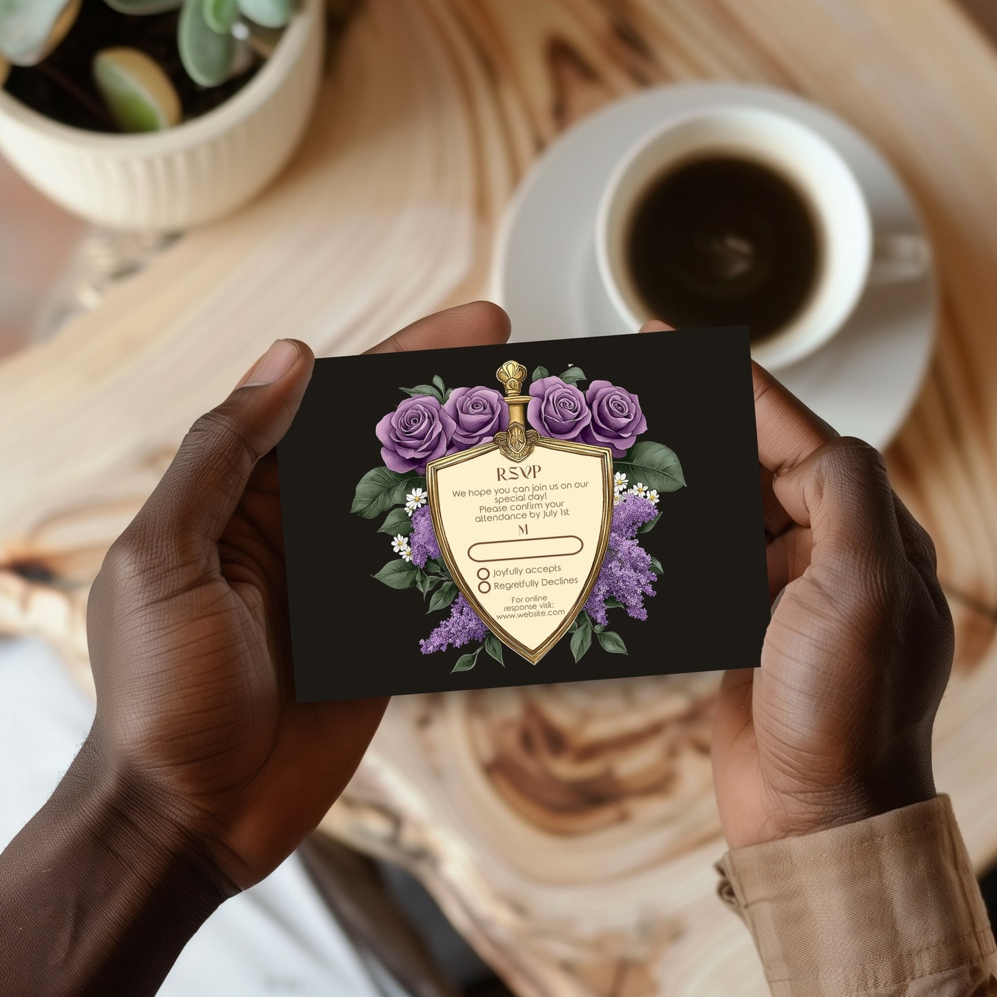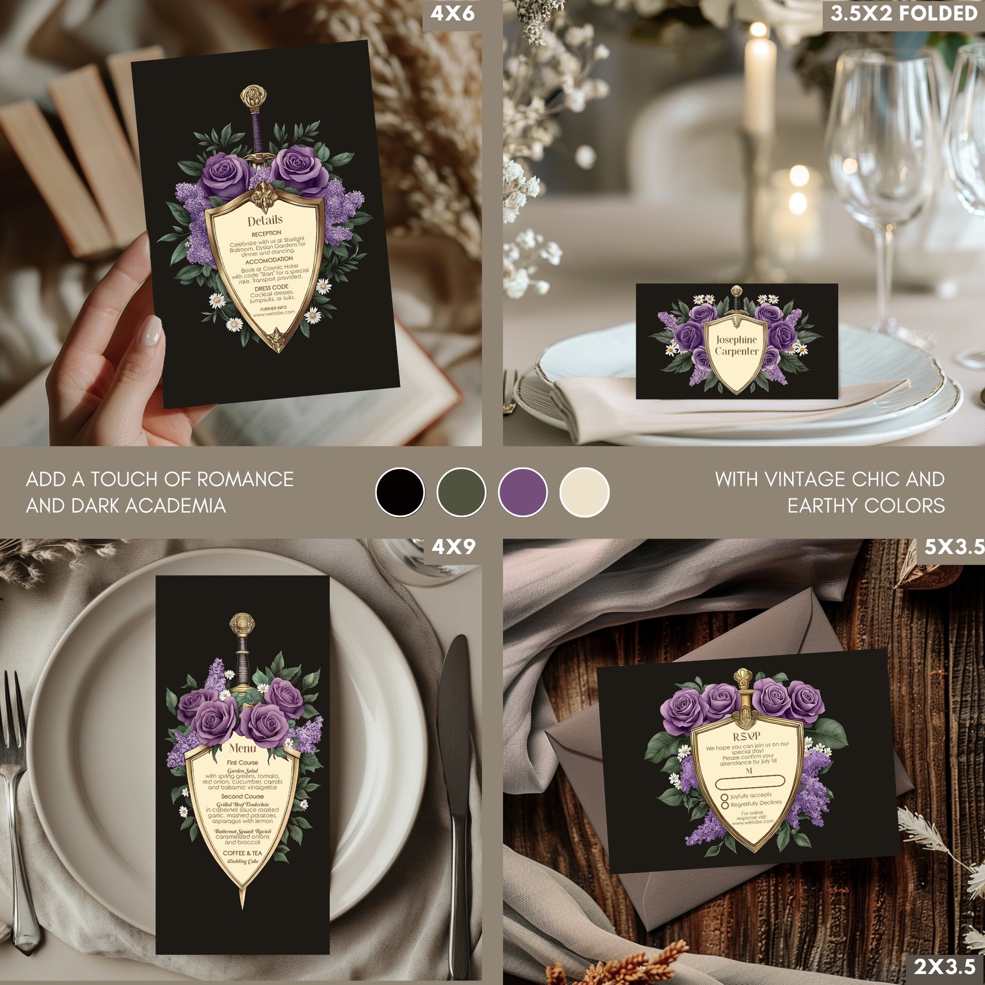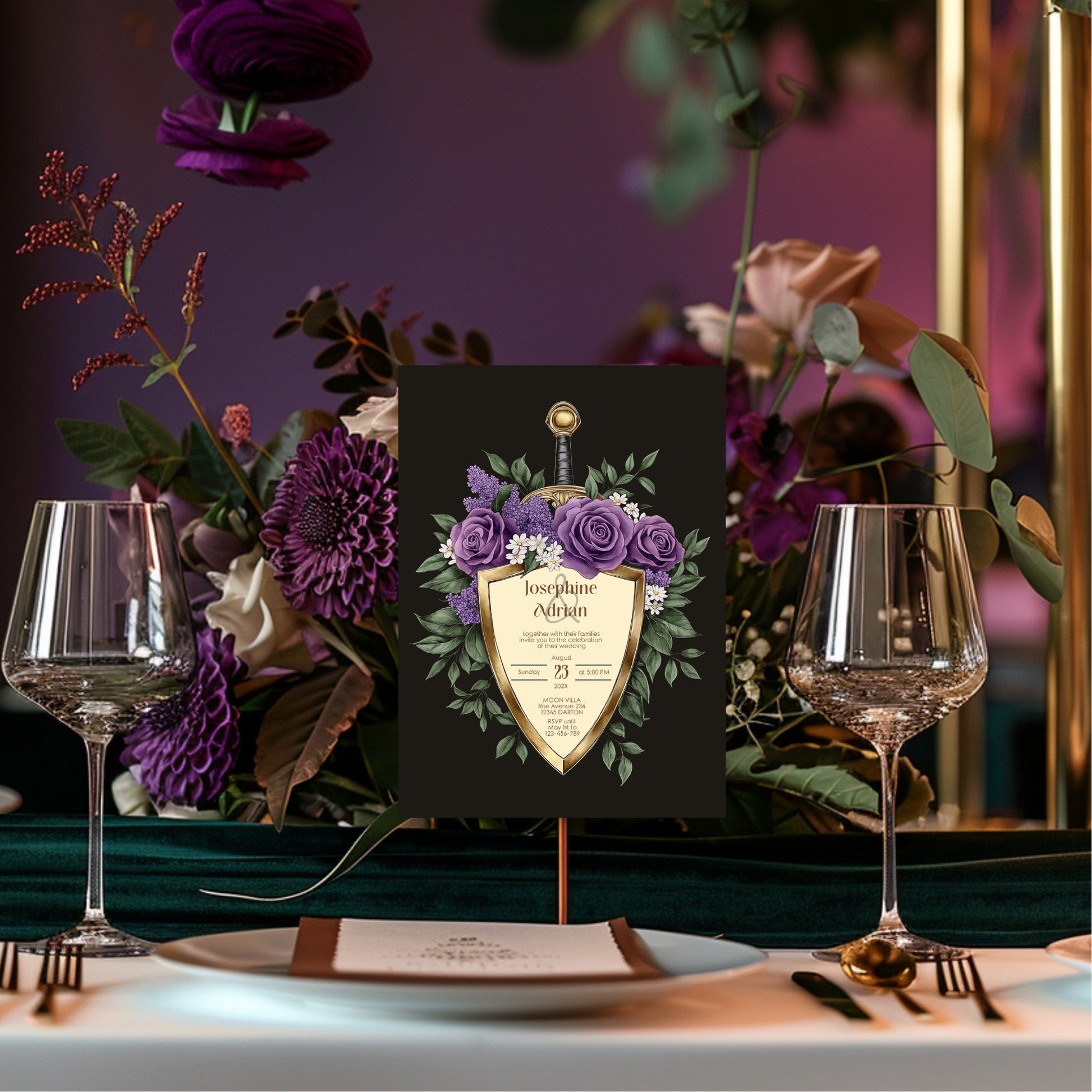 Elegant Shield Wedding Invitation Set – Purple Roses and Green Botanicals, Medieval Sword and Shield