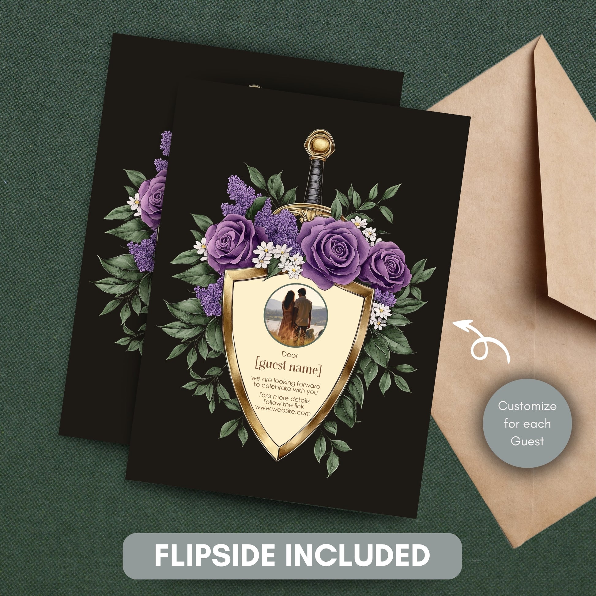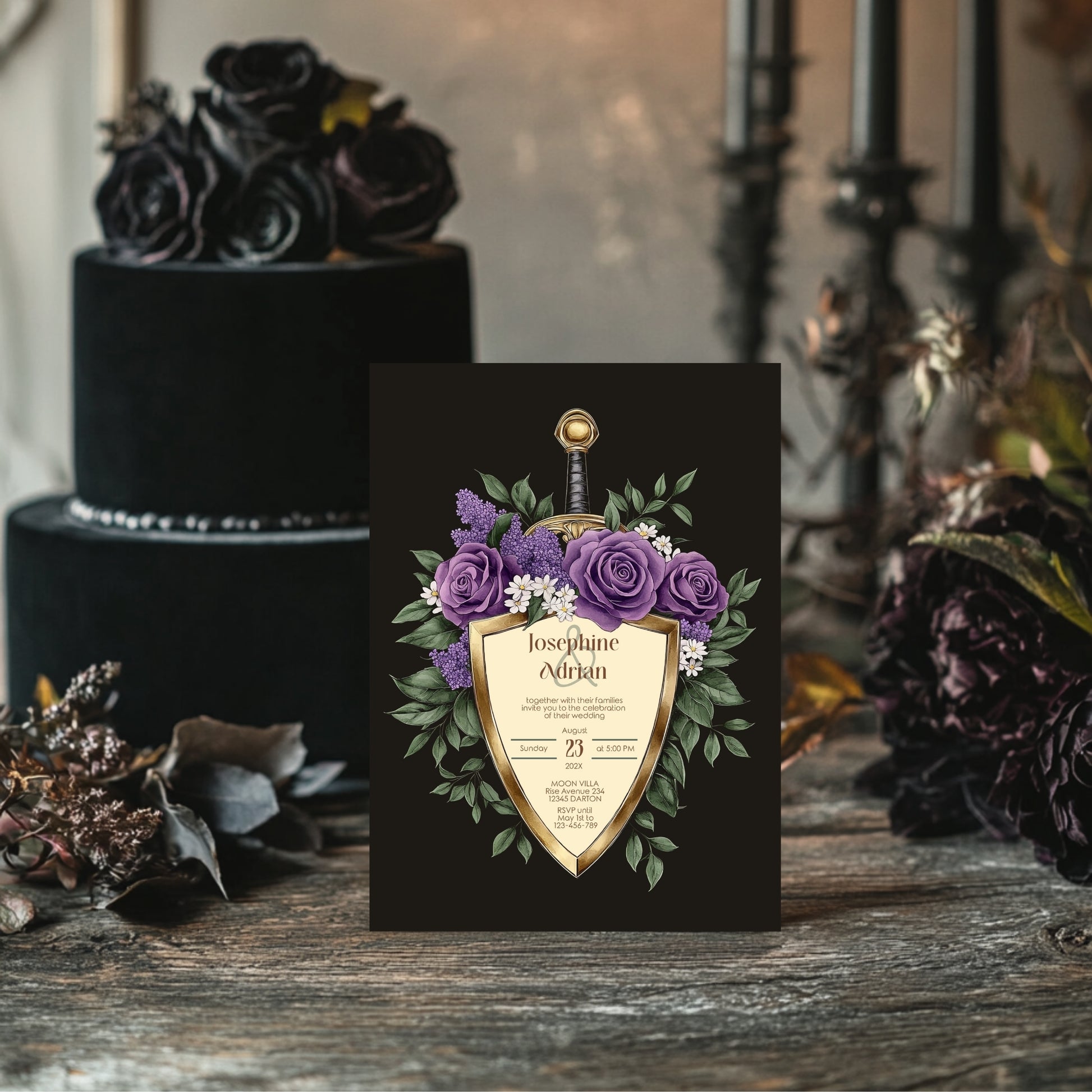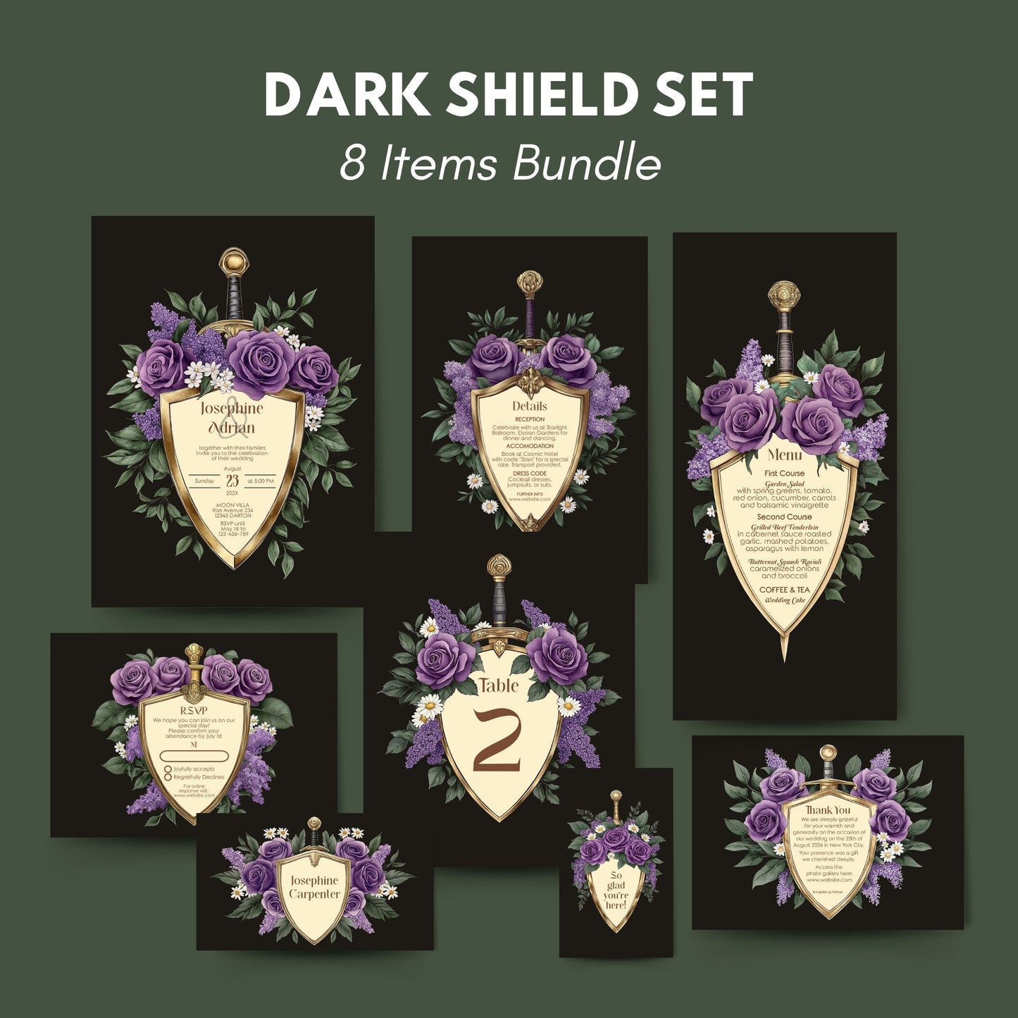 Make a bold and unforgettable statement with this Elegant Shield Wedding Invitation Set. This 8-piece dark floral bundle blends romance and fantasy, featuring gold shield motifs topped with swords and wrapped in deep purple and lilac blooms. Perfect for couples who love dark elegance and timeless flair, this set delivers both drama and refinement.