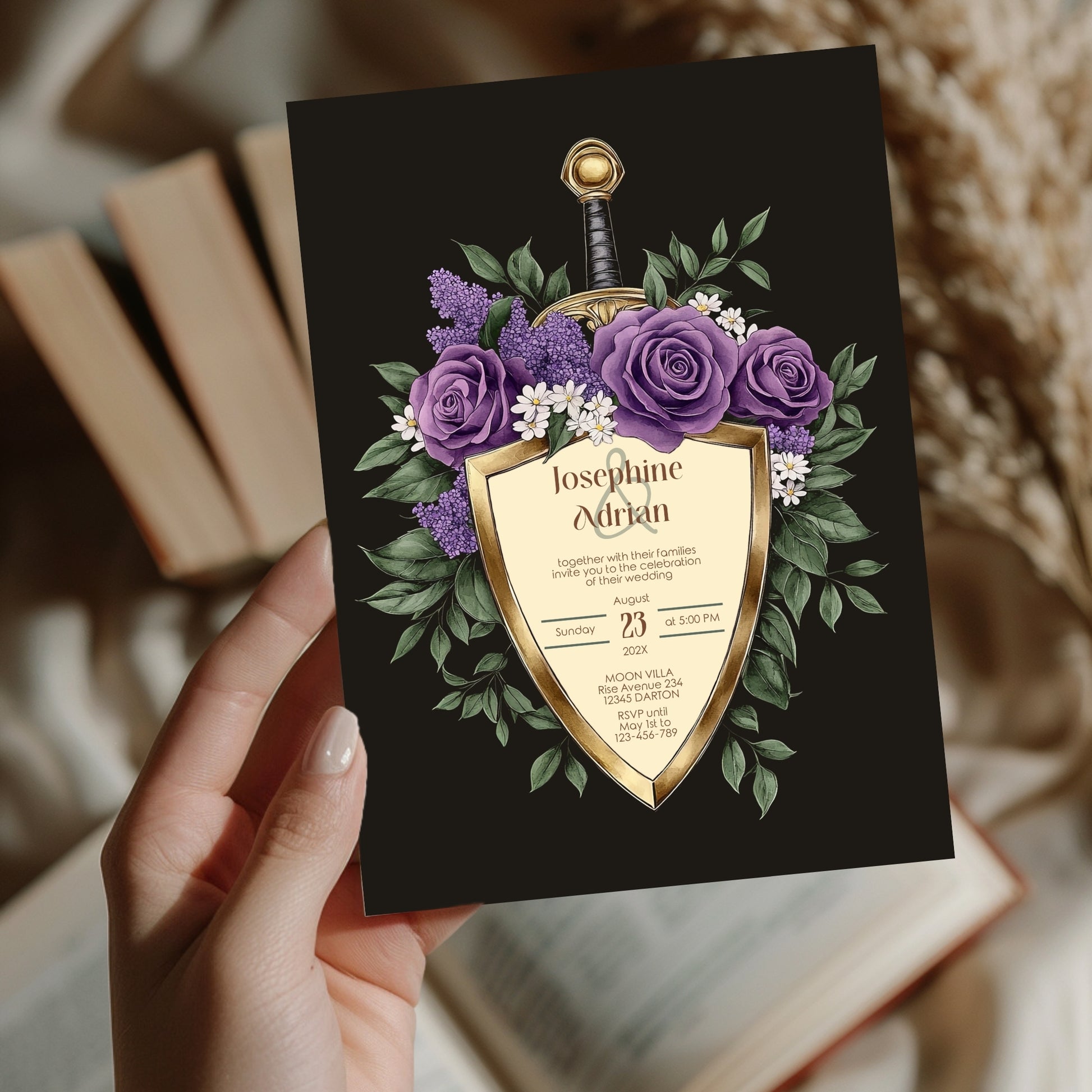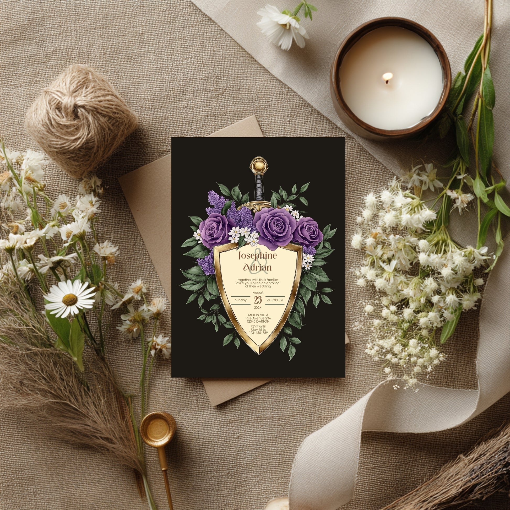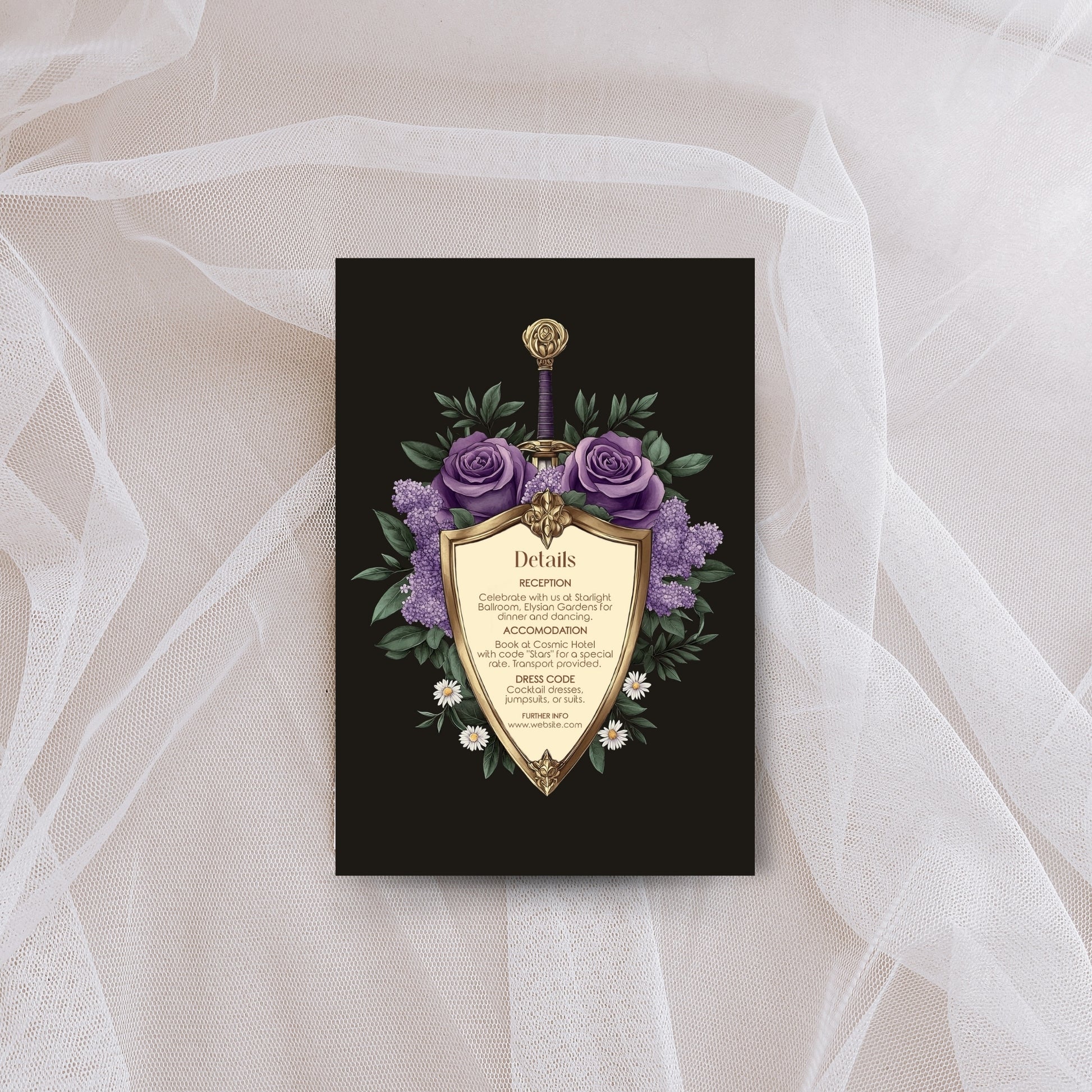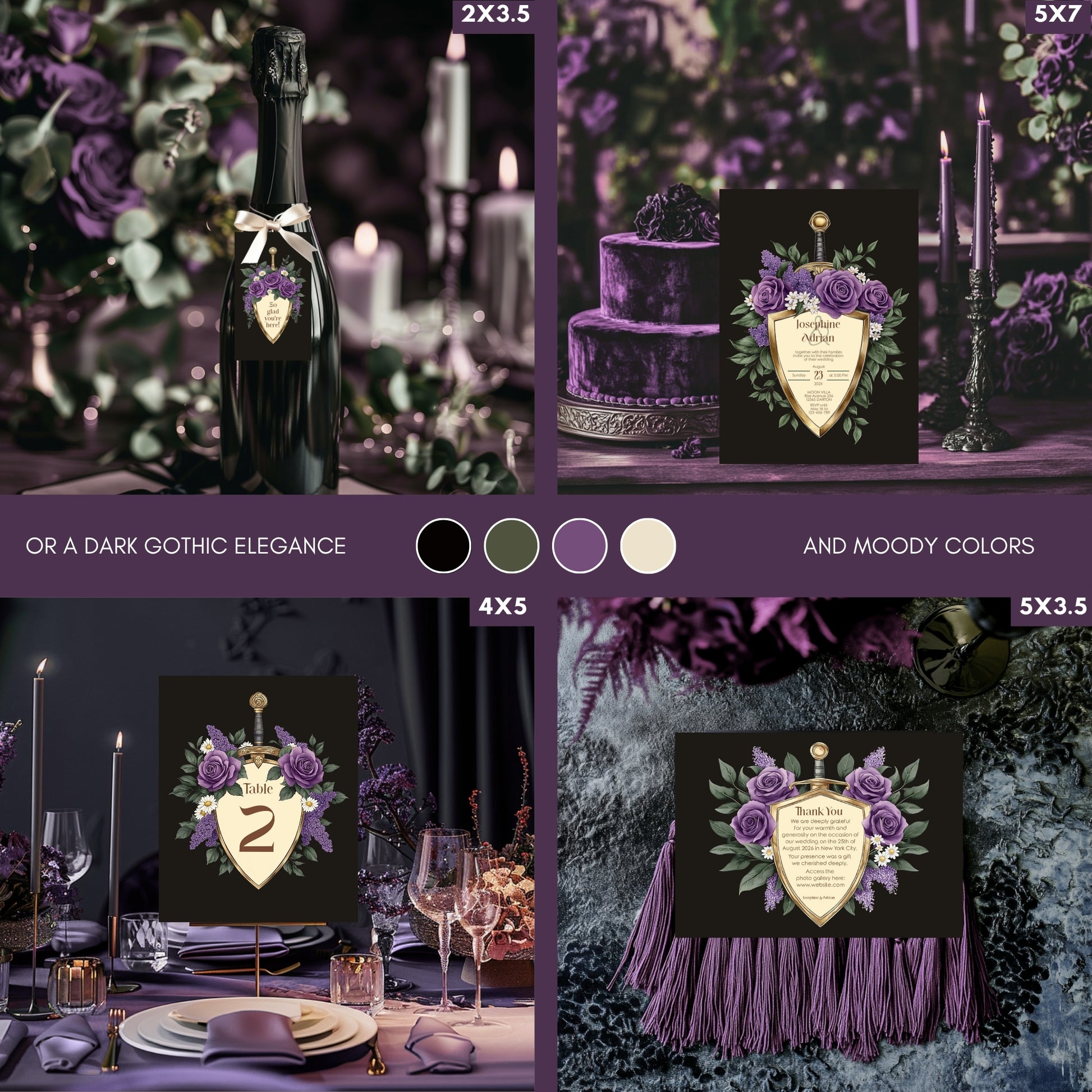 Make a bold and unforgettable statement with this Elegant Shield Wedding Invitation Set. This 8-piece dark floral bundle blends romance and fantasy, featuring gold shield motifs topped with swords and wrapped in deep purple and lilac blooms. Perfect for couples who love dark elegance and timeless flair, this set delivers both drama and refinement.