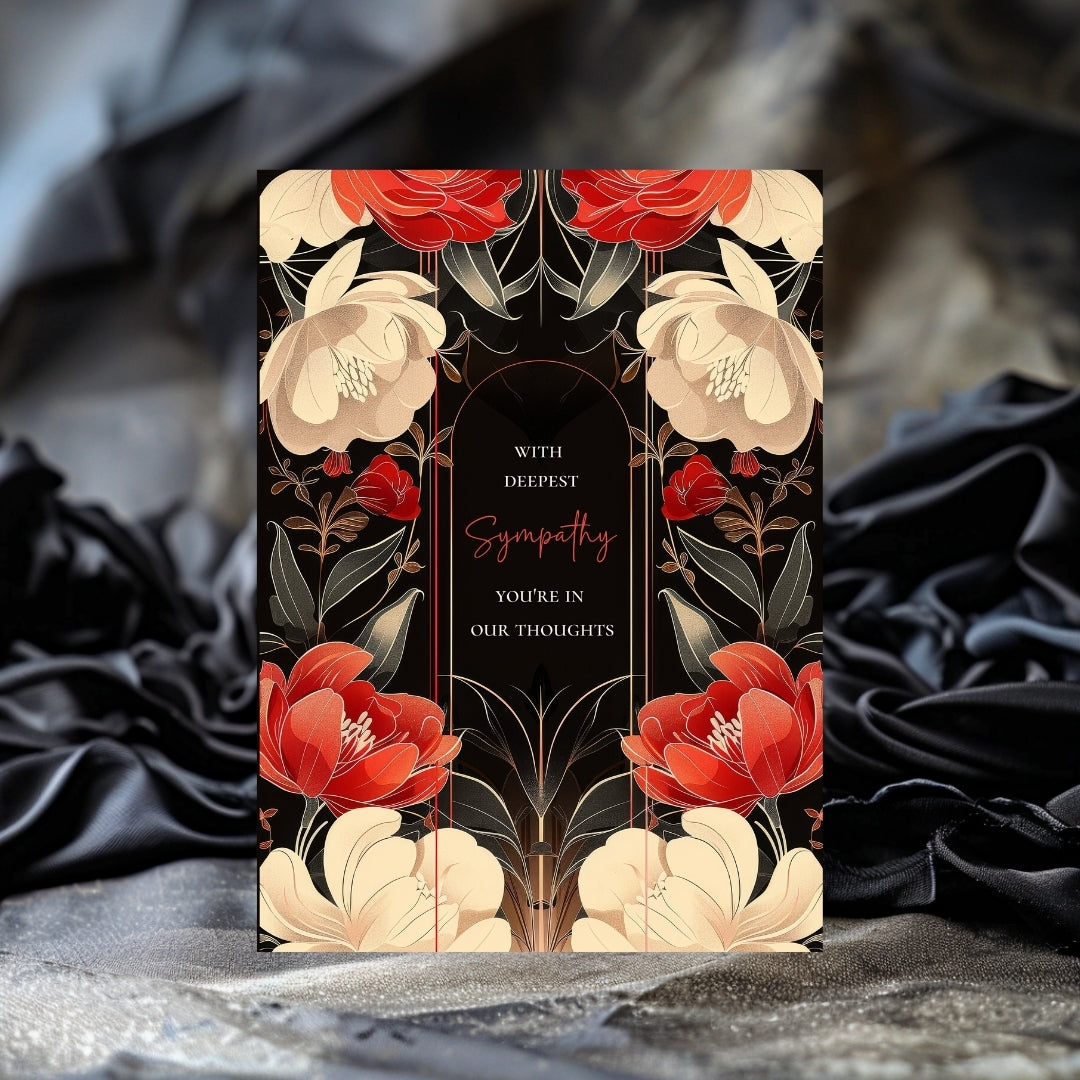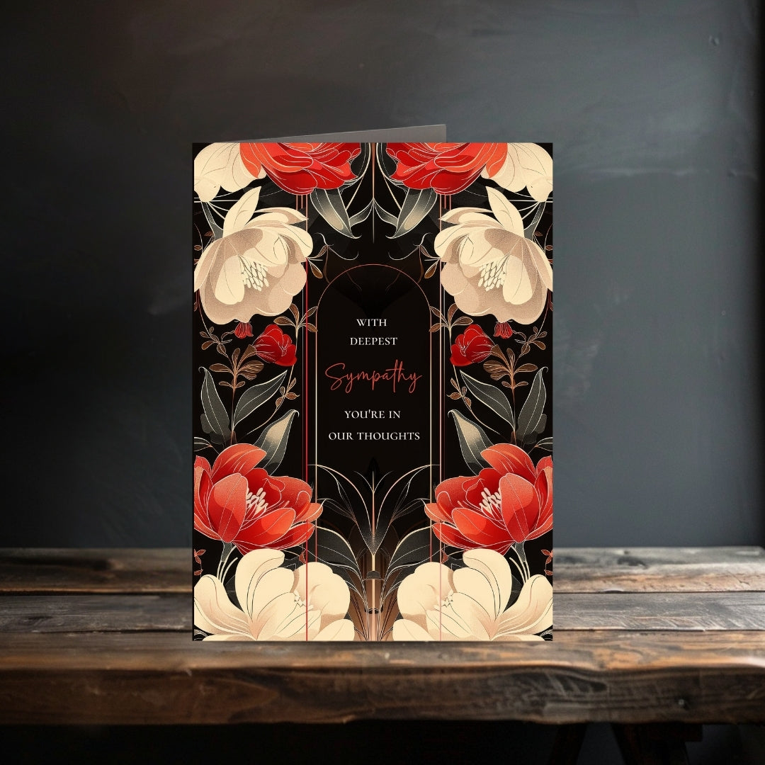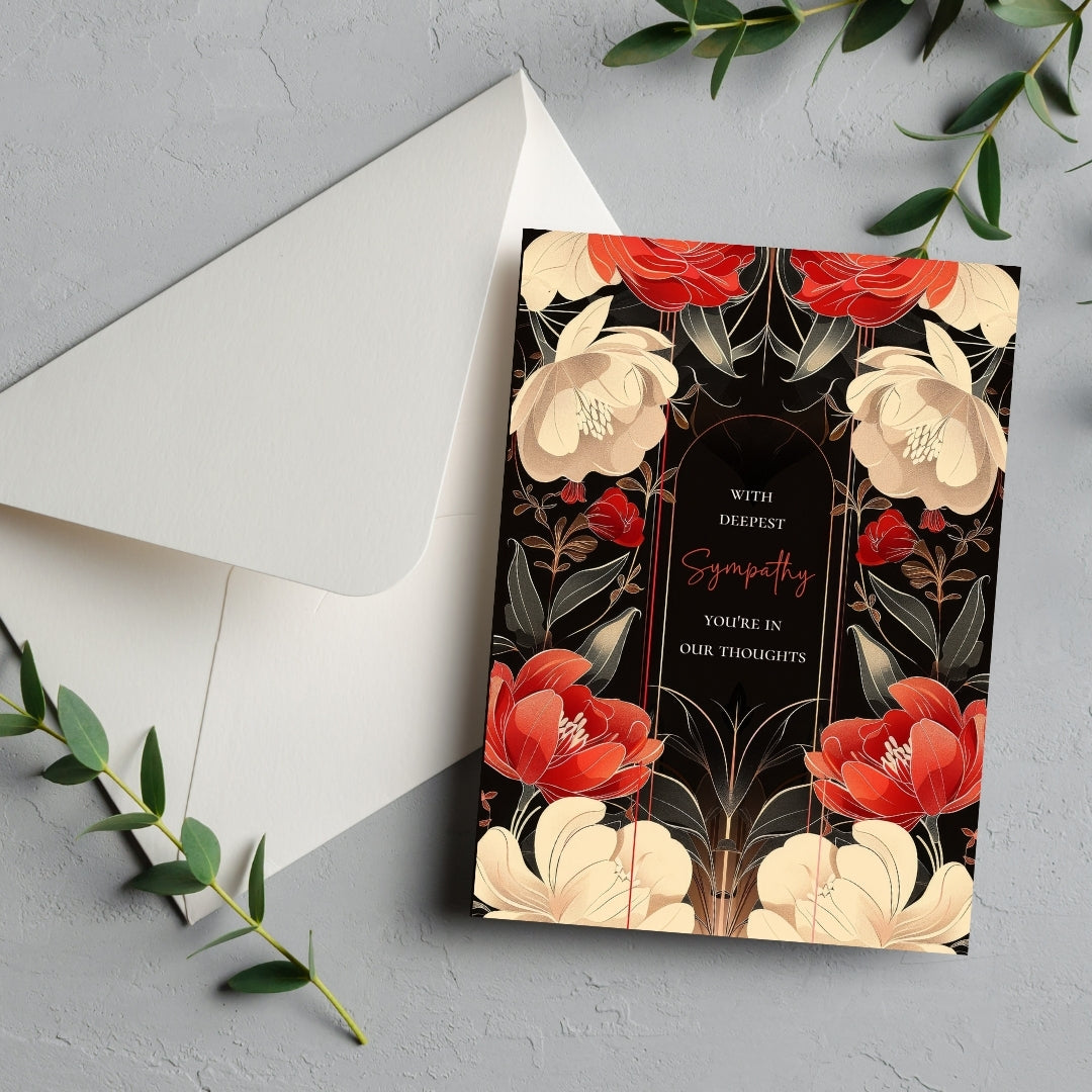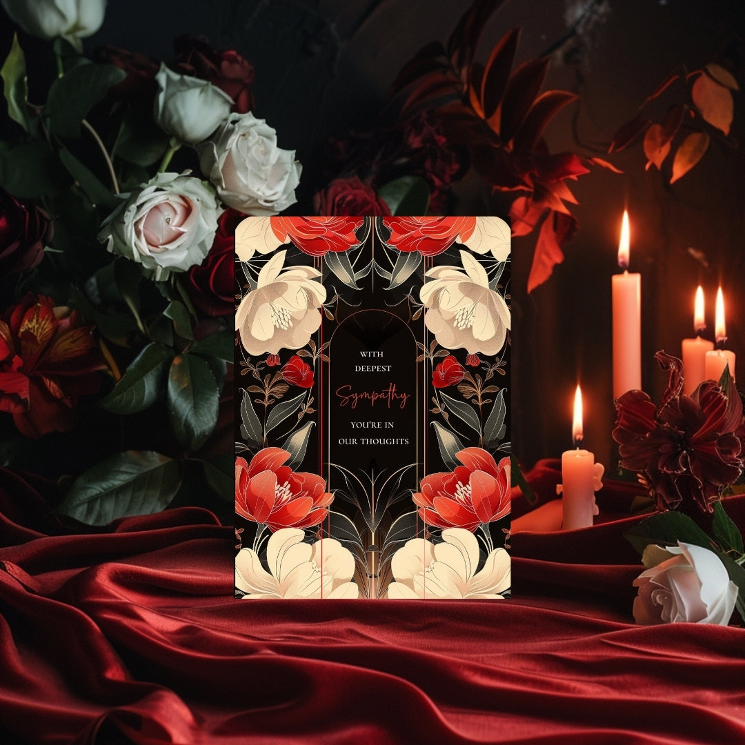 Our sympathy card features a dark black background adorned with beautifully detailed floral elements in vibrant shades of red and cream. The centralized text is framed by a symmetrical arrangement of flowers and leaves, adding a touch of nature-inspired elegance.
