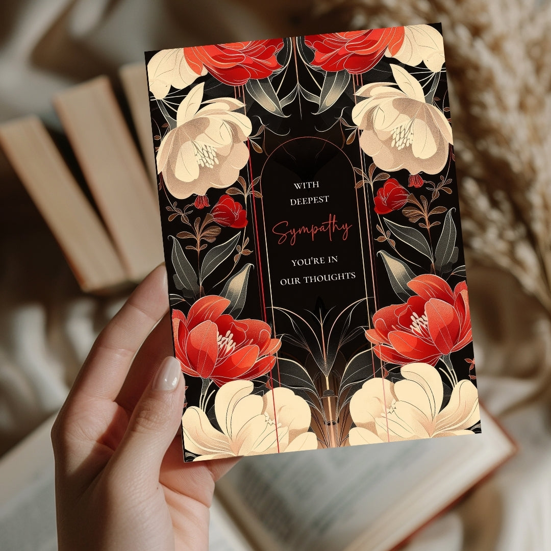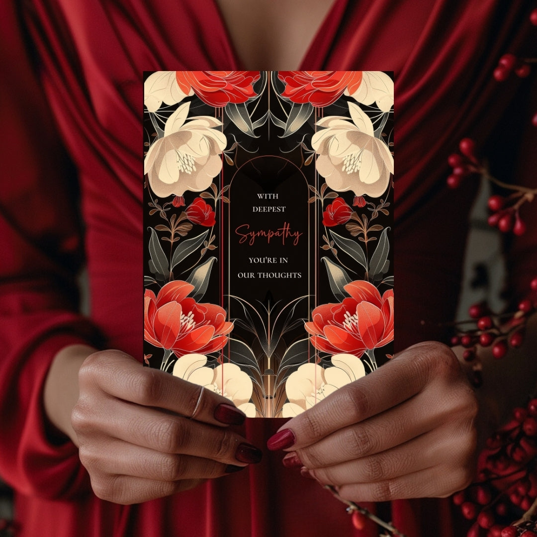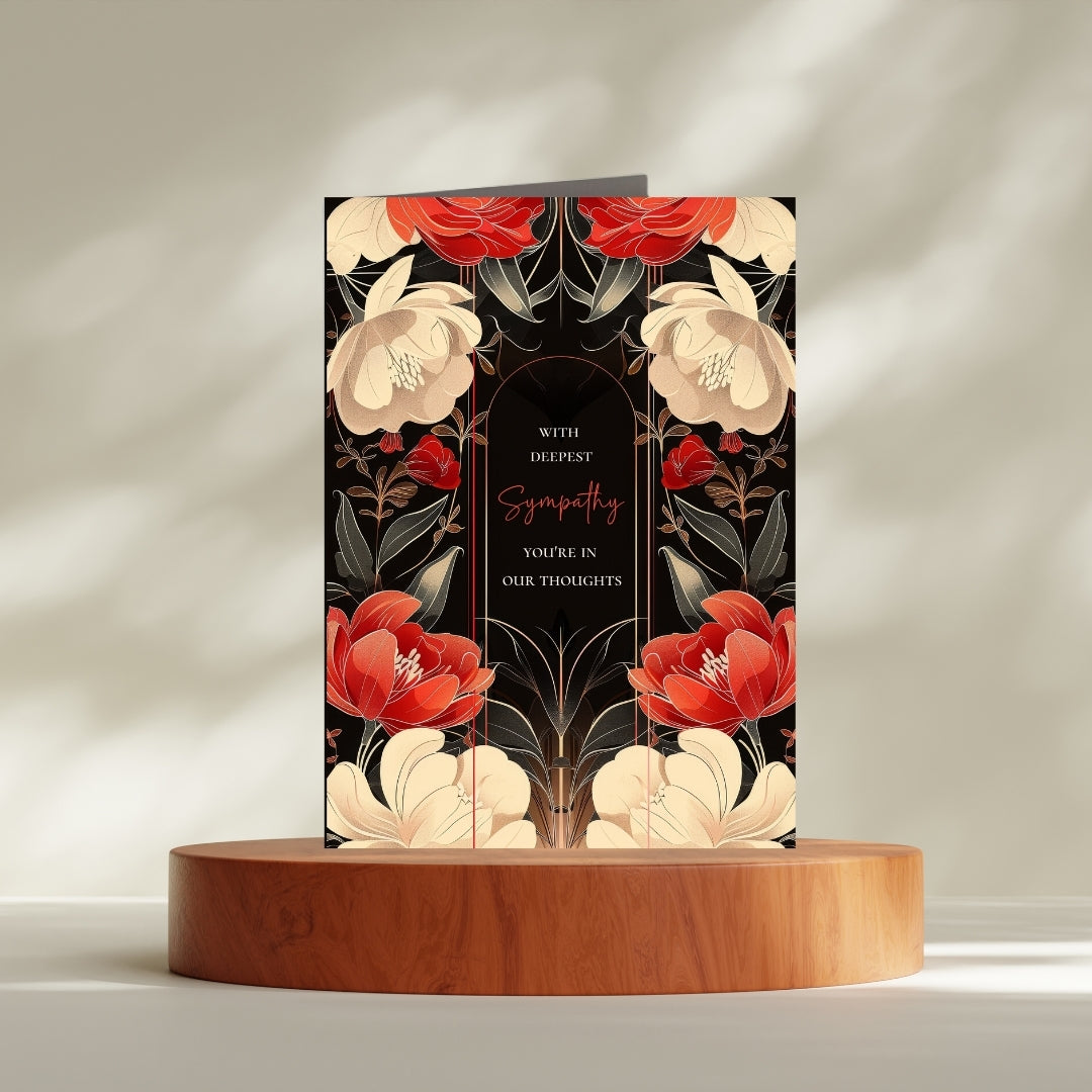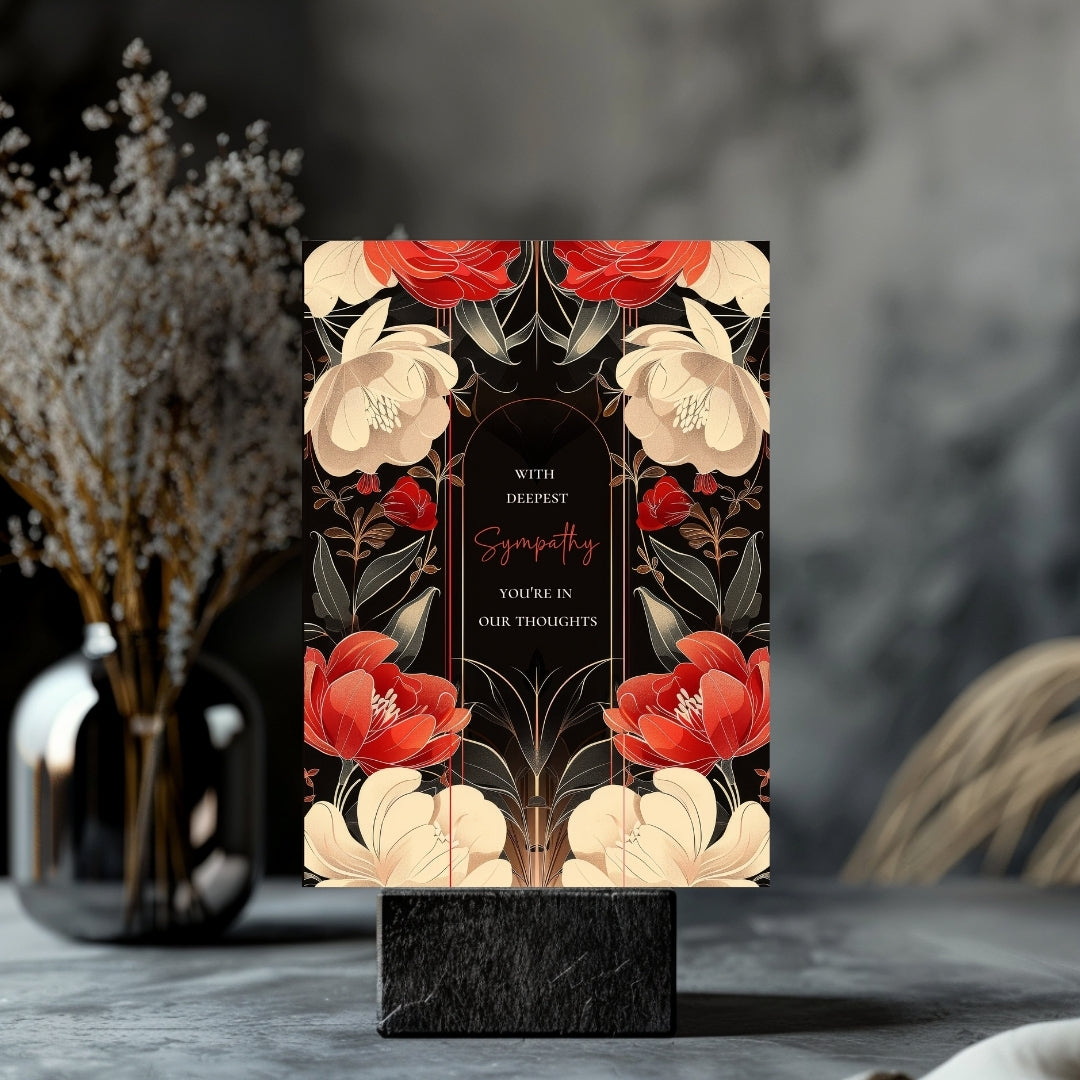 Our sympathy card features a dark black background adorned with beautifully detailed floral elements in vibrant shades of red and cream. The centralized text is framed by a symmetrical arrangement of flowers and leaves, adding a touch of nature-inspired elegance.