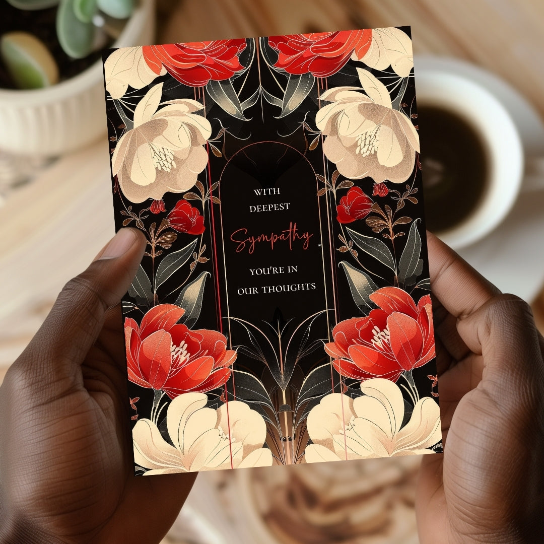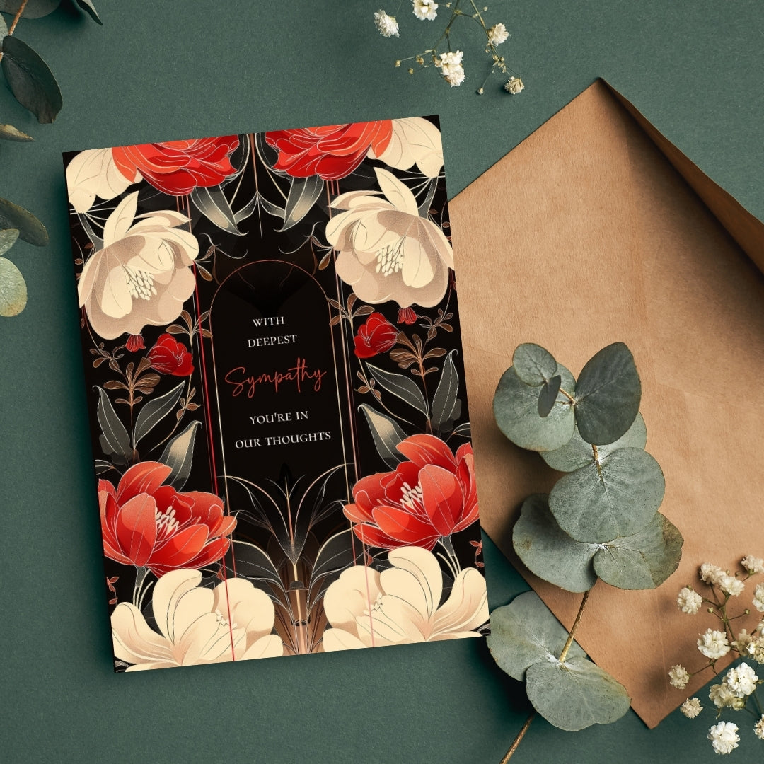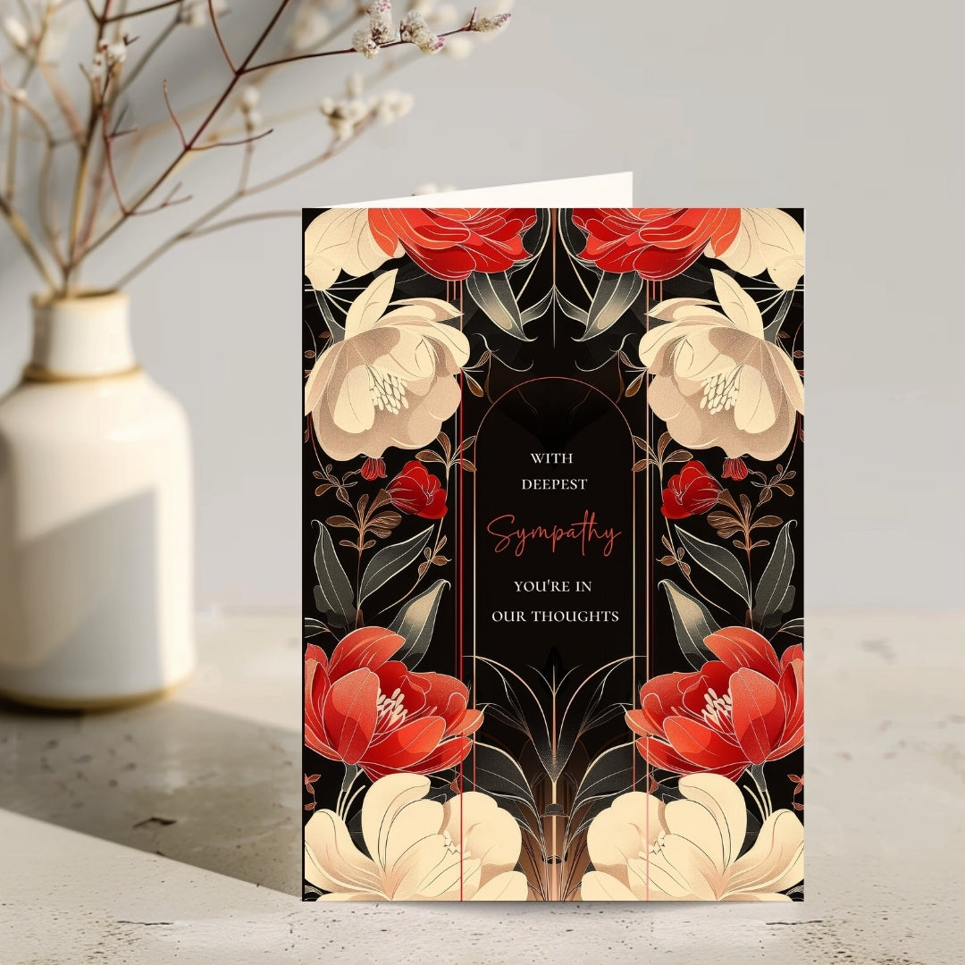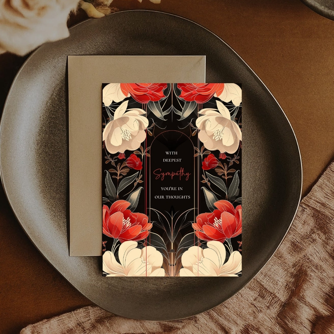 Our sympathy card features a dark black background adorned with beautifully detailed floral elements in vibrant shades of red and cream. The centralized text is framed by a symmetrical arrangement of flowers and leaves, adding a touch of nature-inspired elegance.