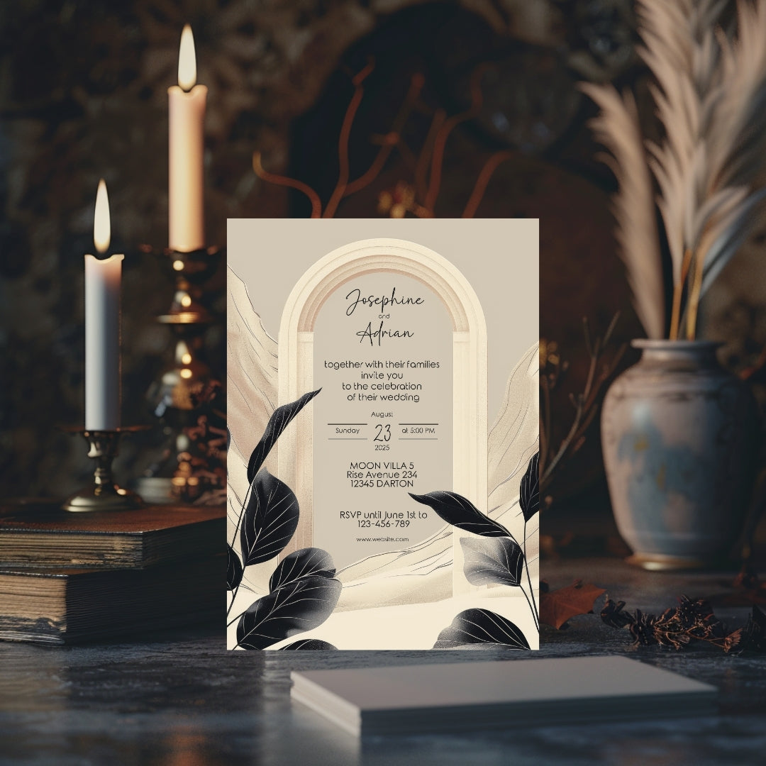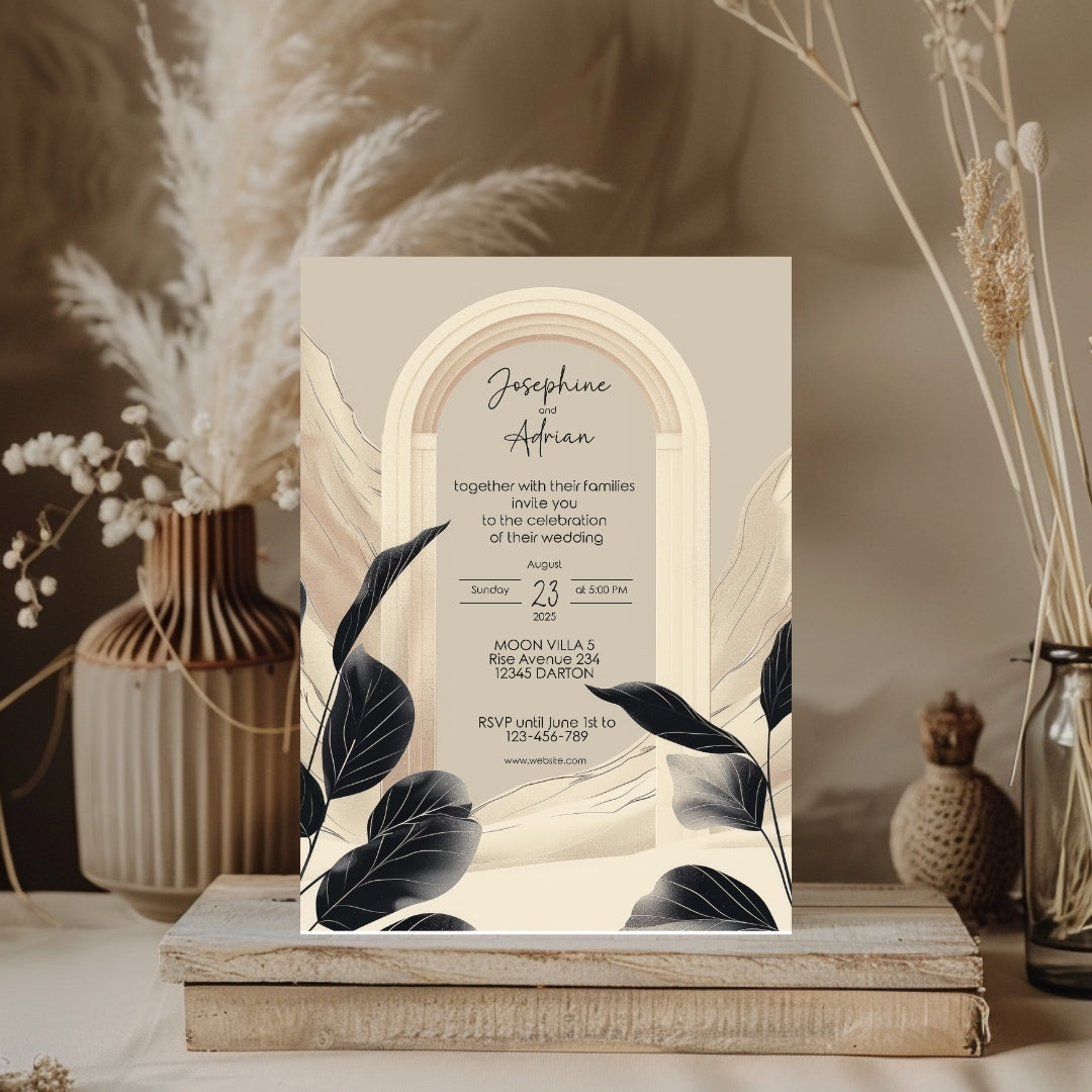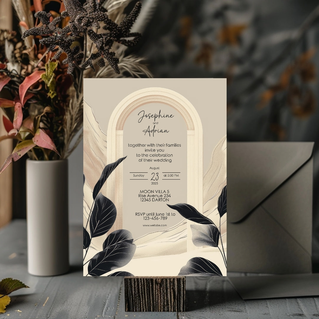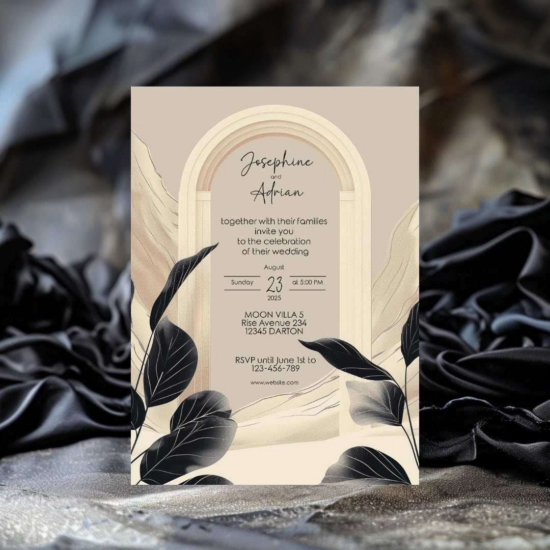 Indulge in the understated sophistication of our "Creamy Serenity Art Deco Wedding Invitation". This digital template is infused with the poise and polish of the 1920s, brought to life with contemporary flair. Soft cream hues and bold black botanicals dance across a canvas of simplicity, providing a tranquil yet striking invitation perfect for your wedding, elegant birthday, or any refined celebration. The arching details and harmonious design offer a personalized digital canvas, ready to be tailored with your event details for either print or electronic distribution. Set the tone for your special day with an invitation that speaks volumes in its serene elegance.