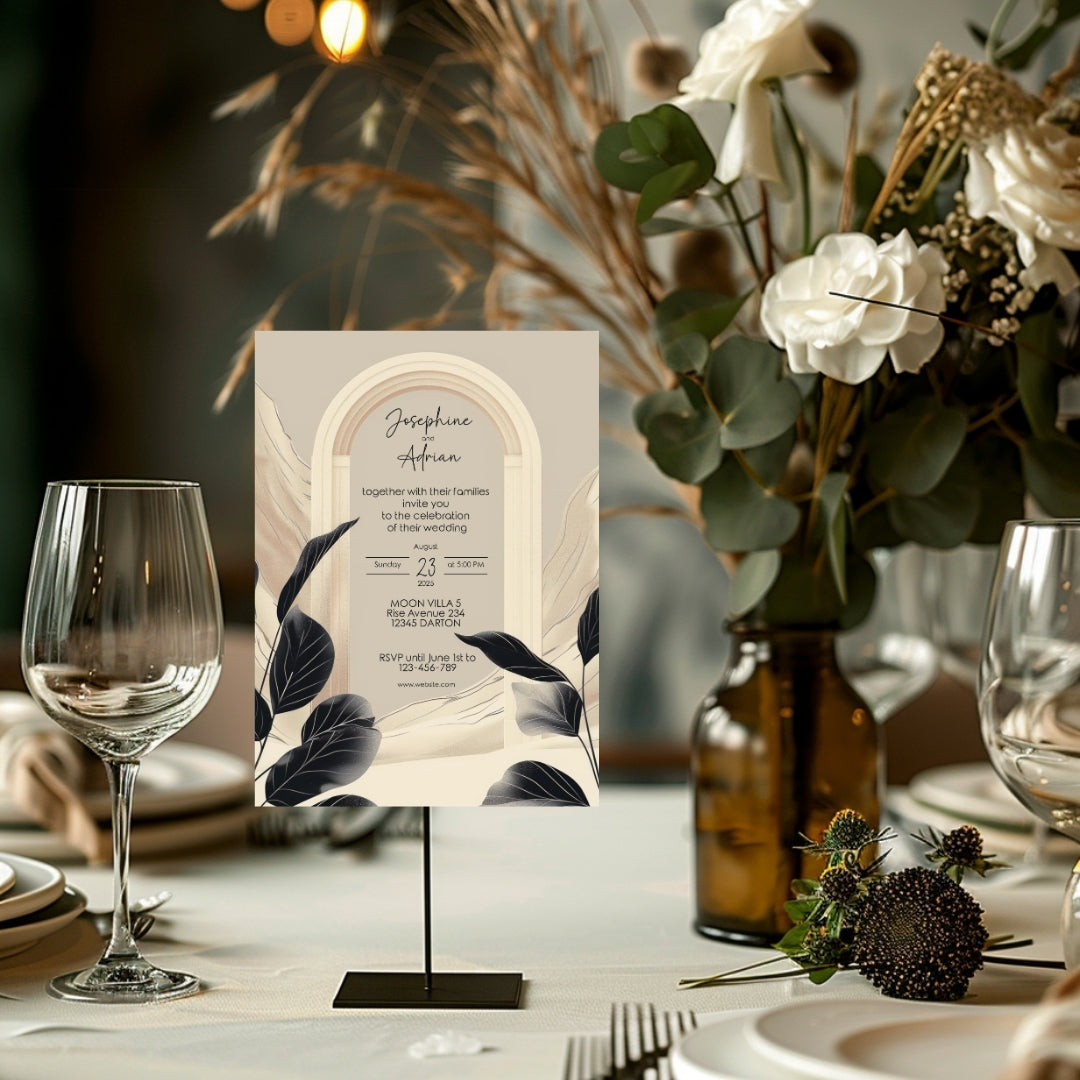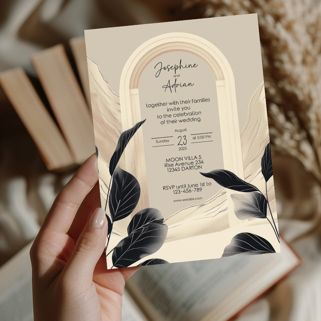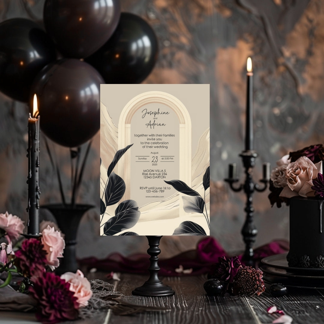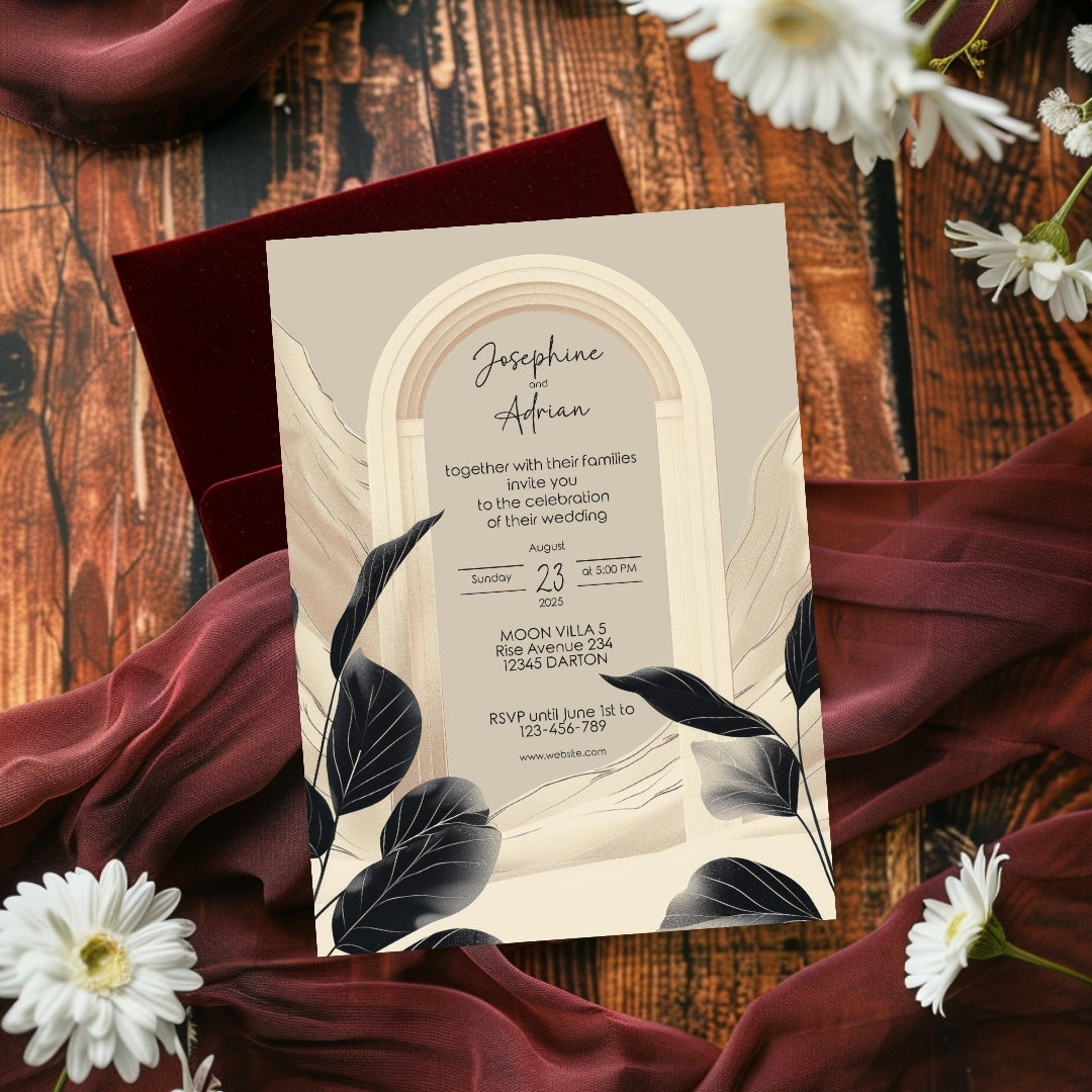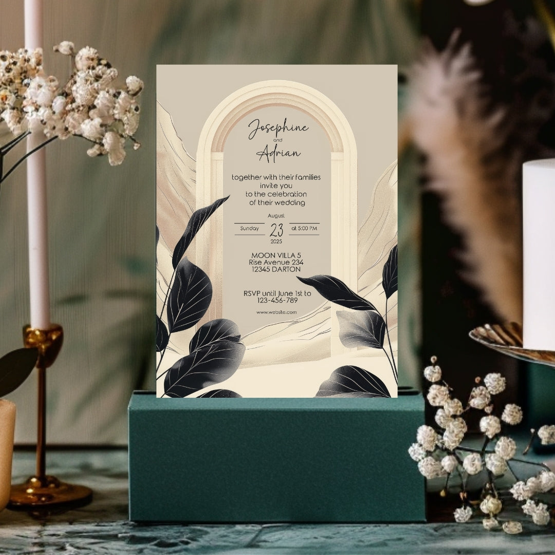 Indulge in the understated sophistication of our "Creamy Serenity Art Deco Wedding Invitation". This digital template is infused with the poise and polish of the 1920s, brought to life with contemporary flair. Soft cream hues and bold black botanicals dance across a canvas of simplicity, providing a tranquil yet striking invitation perfect for your wedding, elegant birthday, or any refined celebration. The arching details and harmonious design offer a personalized digital canvas, ready to be tailored with your event details for either print or electronic distribution. Set the tone for your special day with an invitation that speaks volumes in its serene elegance.
