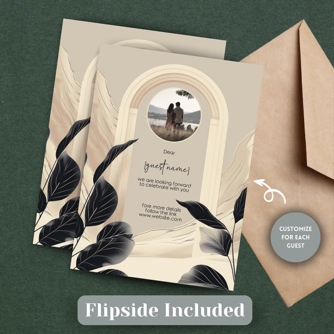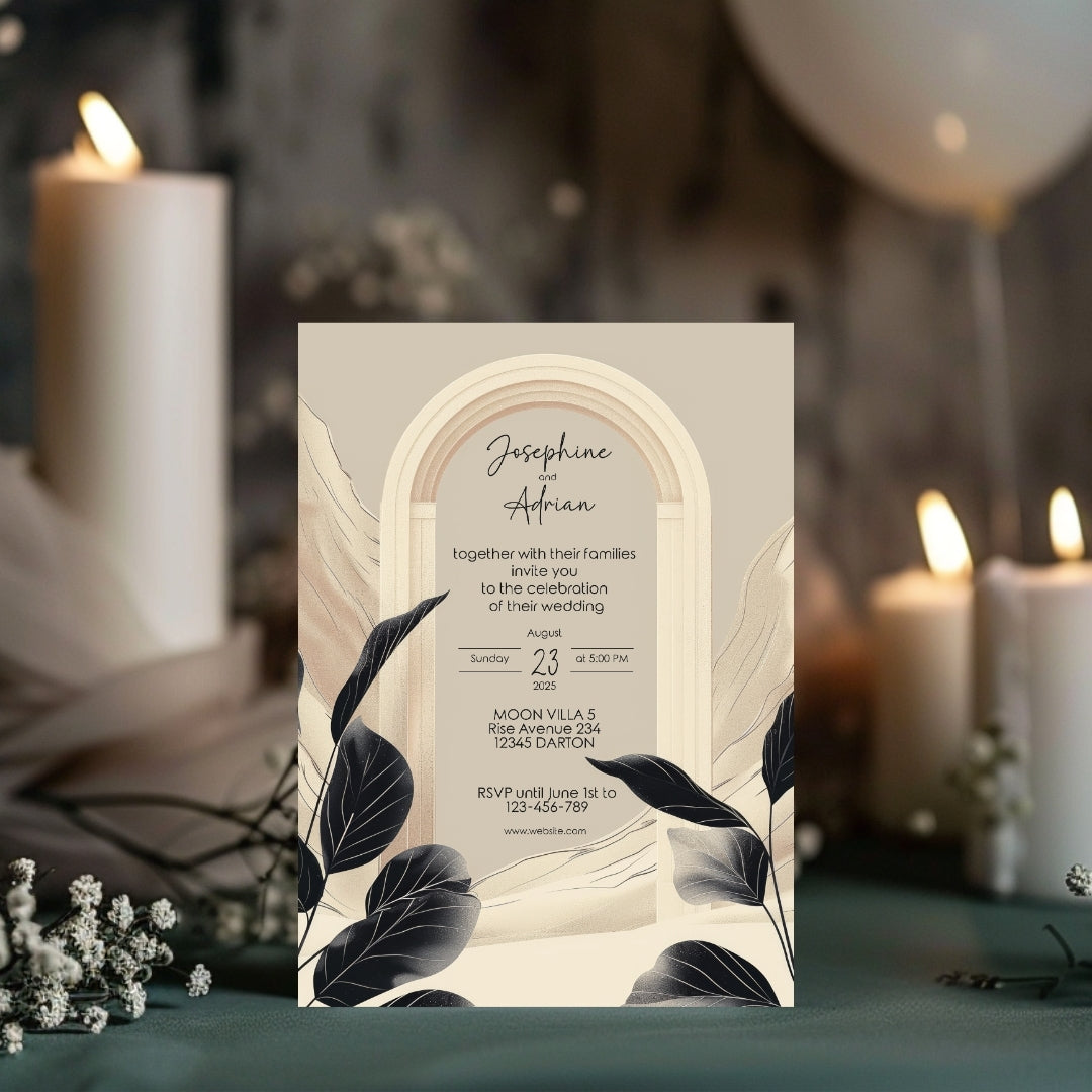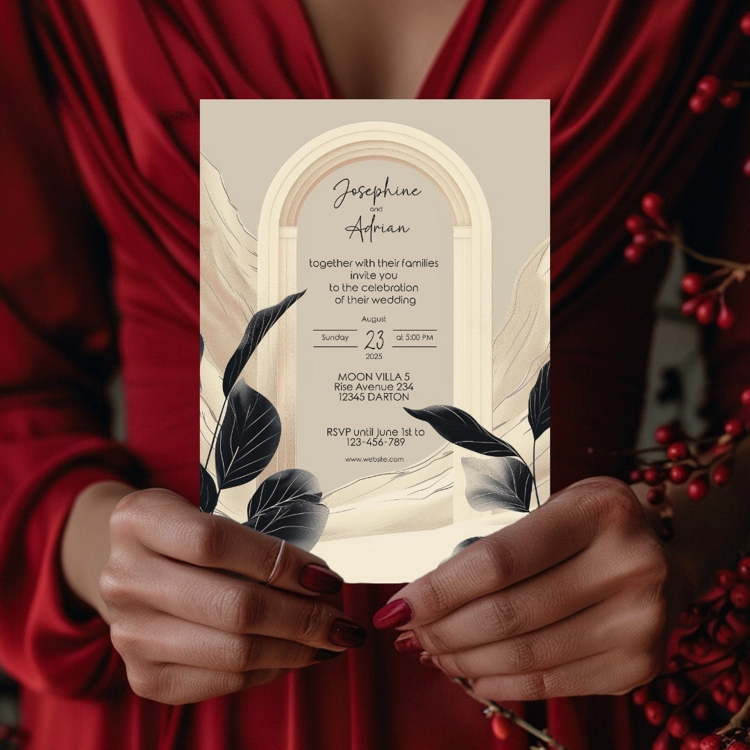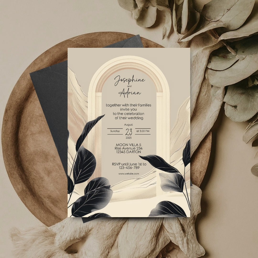 Indulge in the understated sophistication of our "Creamy Serenity Art Deco Wedding Invitation". This digital template is infused with the poise and polish of the 1920s, brought to life with contemporary flair. Soft cream hues and bold black botanicals dance across a canvas of simplicity, providing a tranquil yet striking invitation perfect for your wedding, elegant birthday, or any refined celebration. The arching details and harmonious design offer a personalized digital canvas, ready to be tailored with your event details for either print or electronic distribution. Set the tone for your special day with an invitation that speaks volumes in its serene elegance.