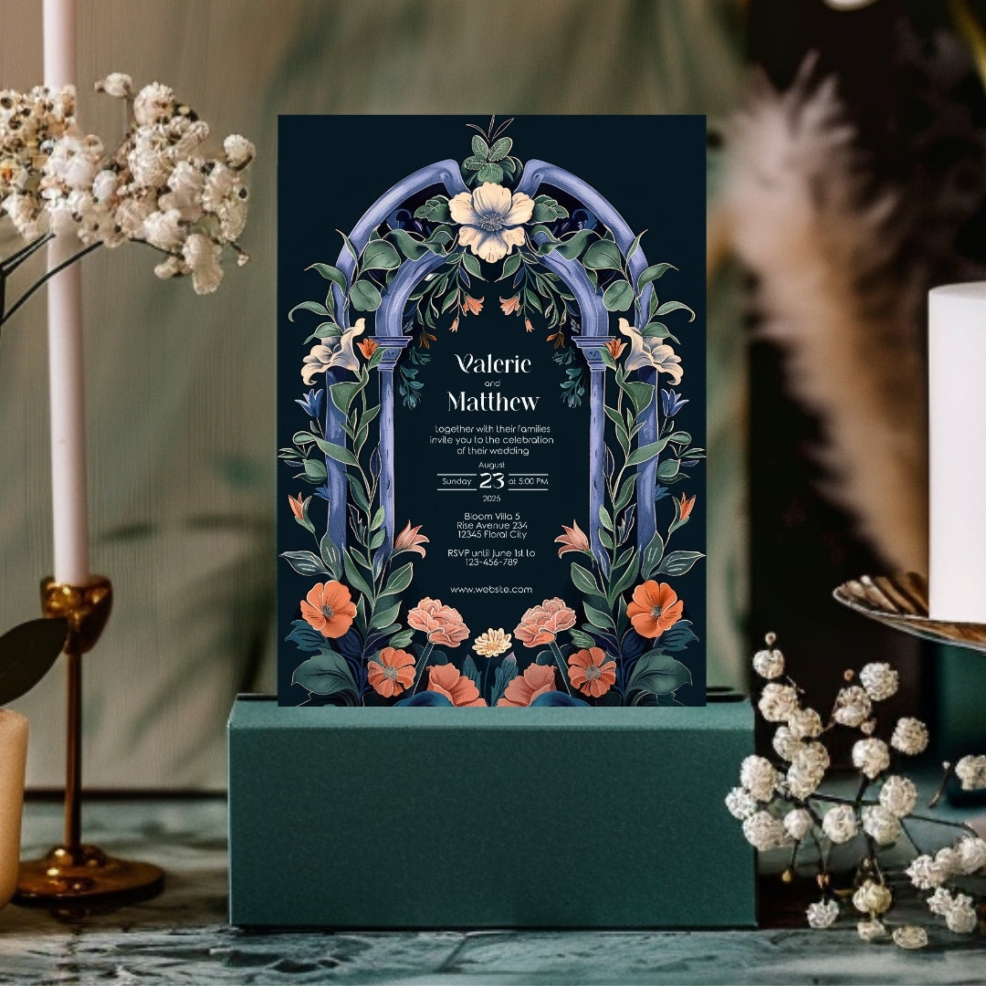 Step into a world of botanical wonder with our Enchanted Garden Arch Invitation, where elegance and enchantment pave the way to your momentous celebration. This digital template captivates with its lush floral arrangements twining around a classic garden arch, all set against a deep, midnight blue backdrop. Perfect for an array of festivities such as weddings, elegant birthday soirées, and memorable anniversaries, it offers a personalized touch that can be easily edited with Corjl. Whether you opt for at-home printing, professional production, or a digital format to share on your devices, this invitation stands as a sophisticated herald to an event that promises to be as magical as the invitation itself.