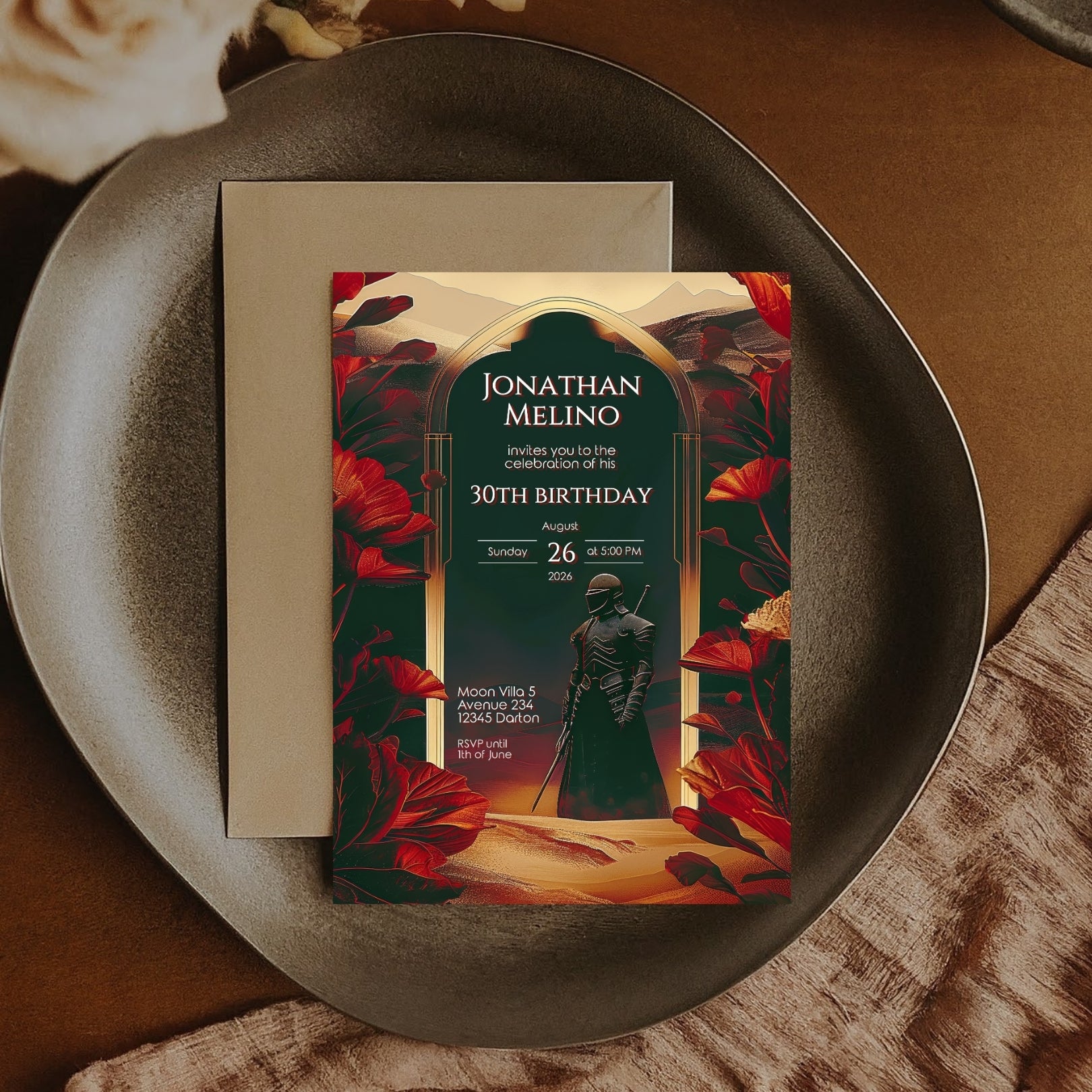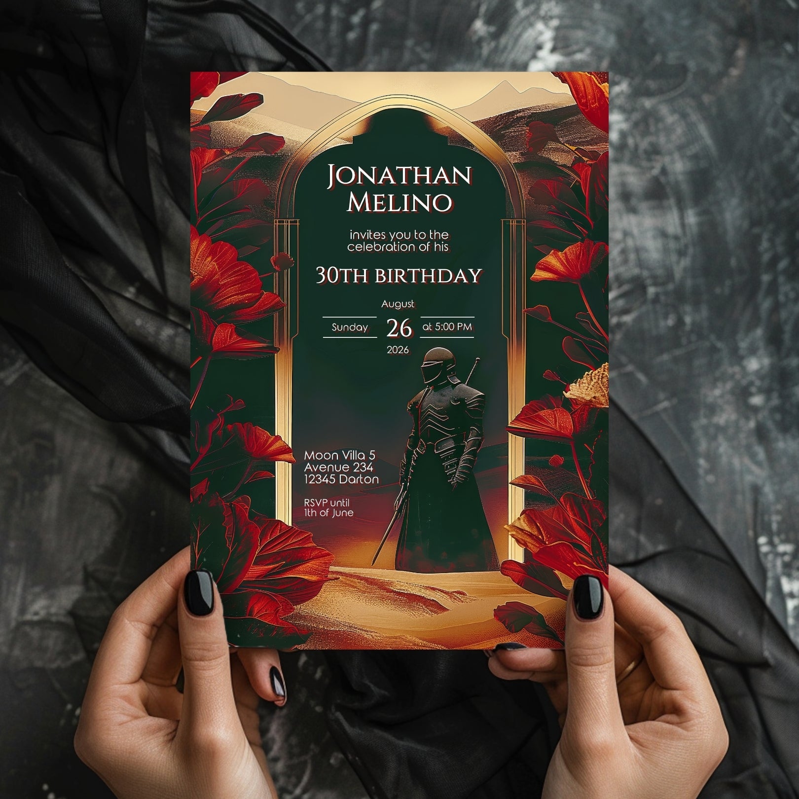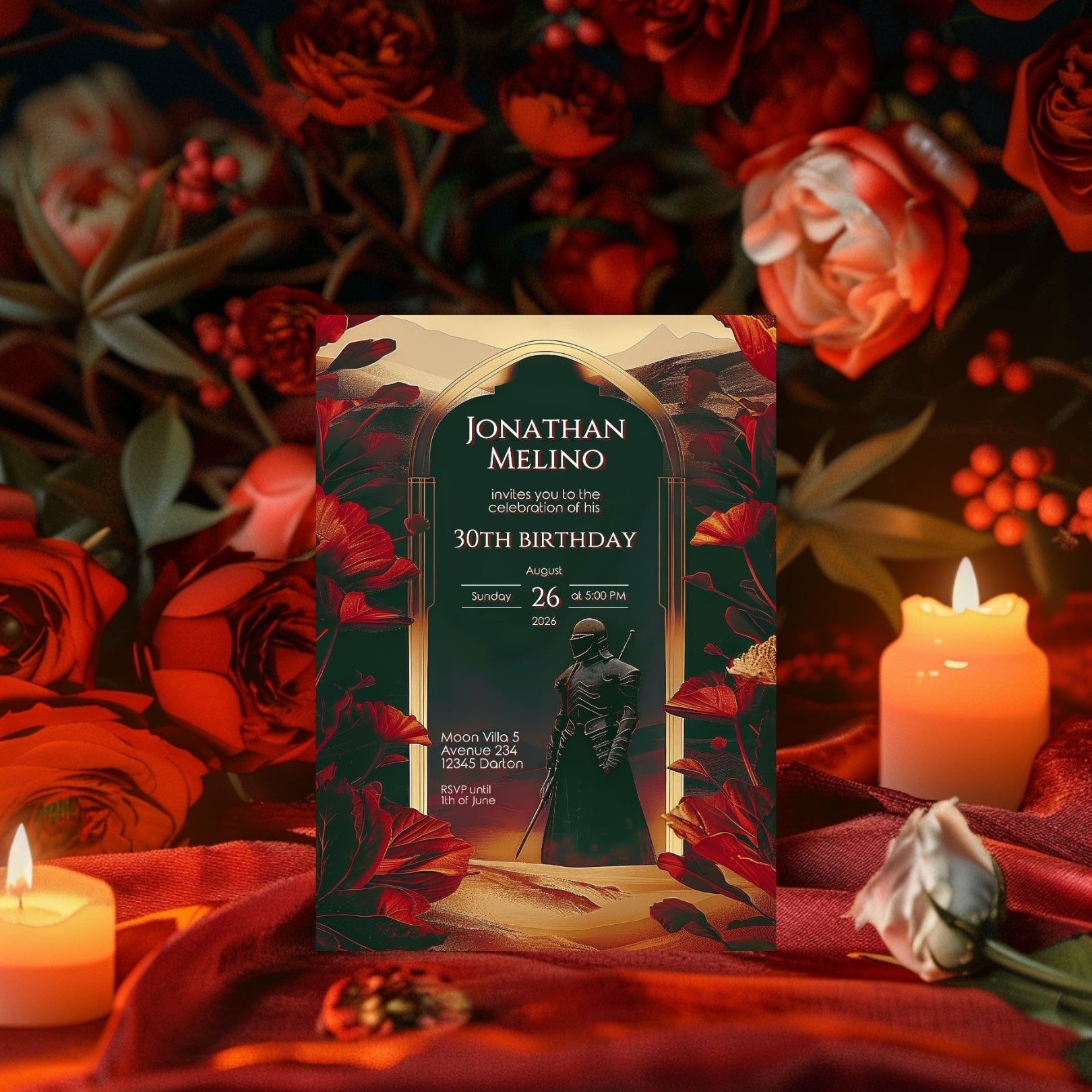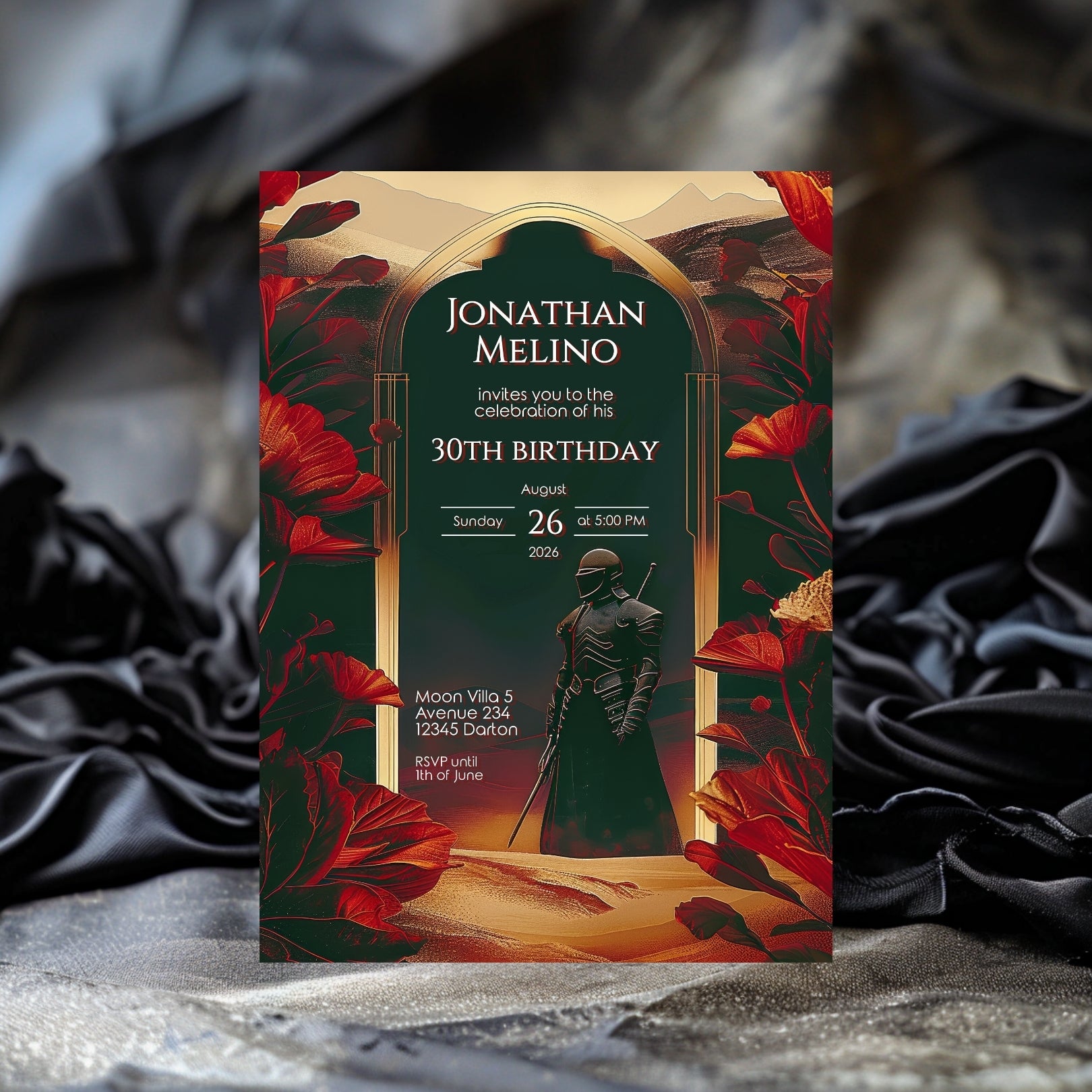 ✔️𝙎𝙩𝙪𝙣𝙣𝙞𝙣𝙜 𝘿𝙚𝙨𝙞𝙜𝙣: Featuring a bold knight in armor standing before a gothic arch, surrounded by vibrant red leaves, this invitation brings a touch of medieval fantasy to your celebration. The deep reds, gold accents, and dark background create a dramatic and luxurious atmosphere.