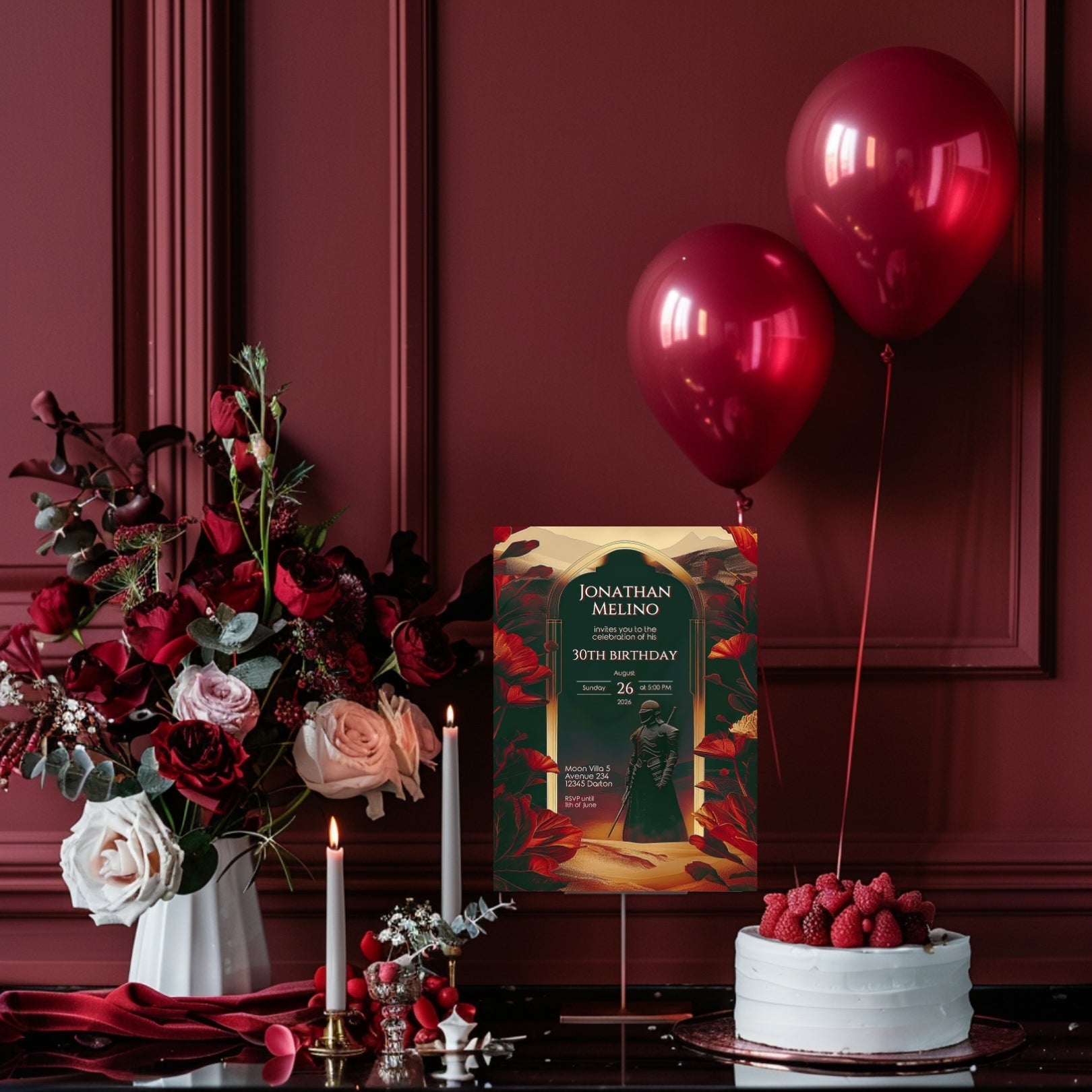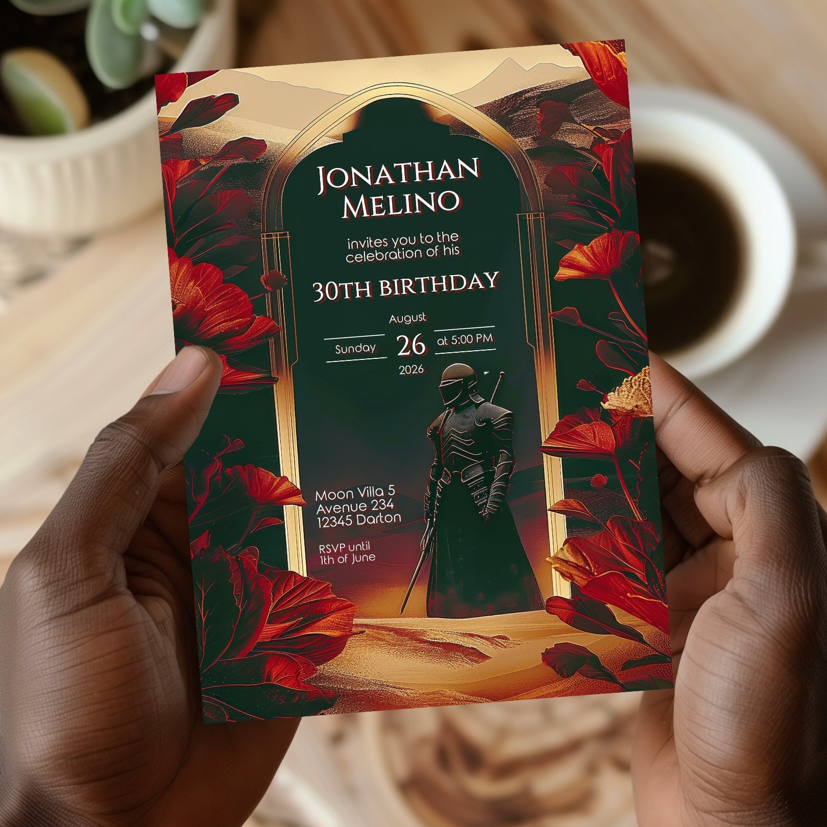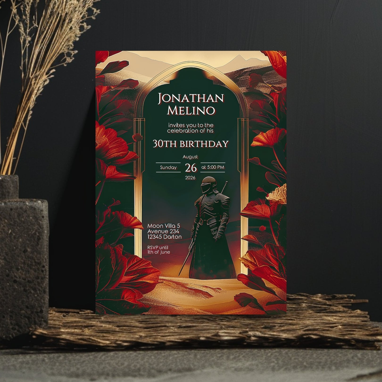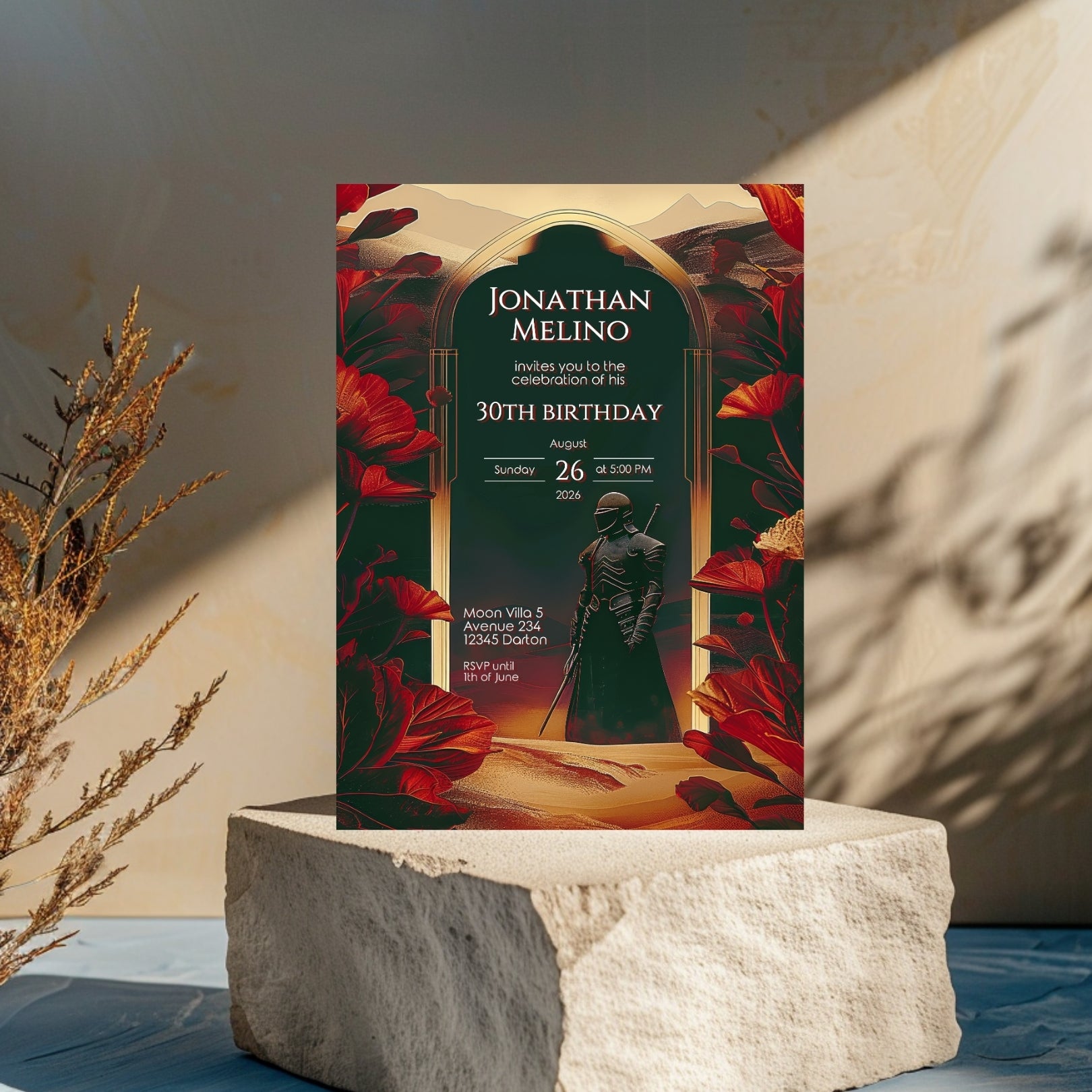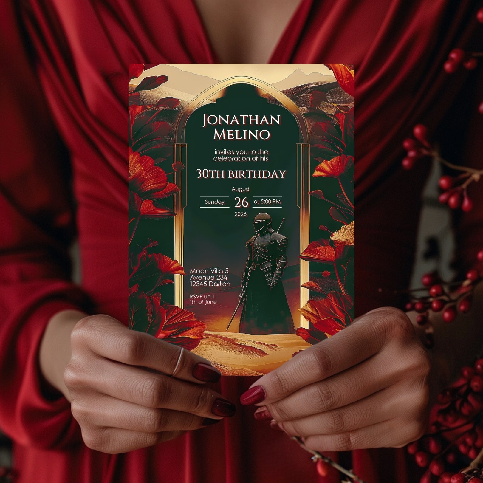 ✔️𝙎𝙩𝙪𝙣𝙣𝙞𝙣𝙜 𝘿𝙚𝙨𝙞𝙜𝙣: Featuring a bold knight in armor standing before a gothic arch, surrounded by vibrant red leaves, this invitation brings a touch of medieval fantasy to your celebration. The deep reds, gold accents, and dark background create a dramatic and luxurious atmosphere.