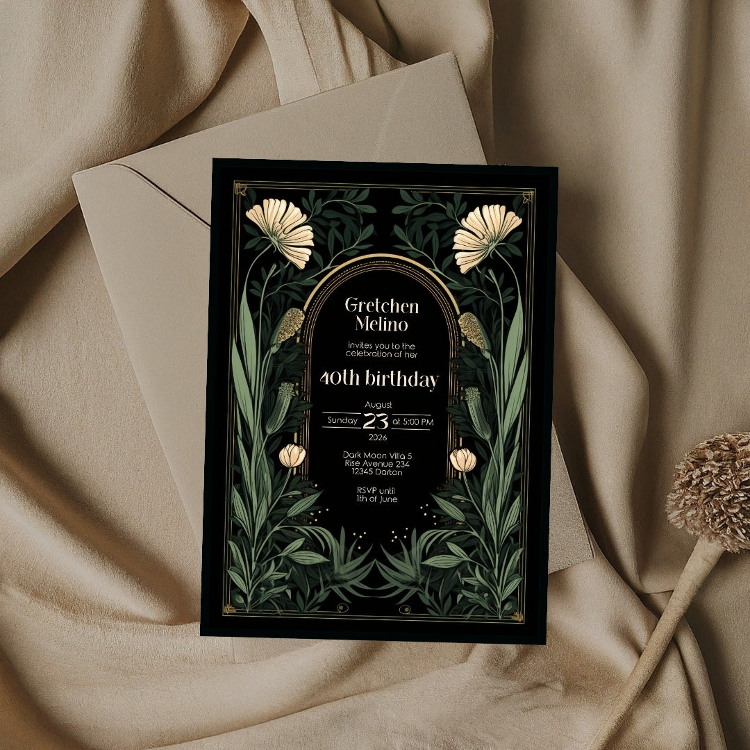 Gothic Art Nouveau Birthday Invitation - Elegant Dark Floral Design