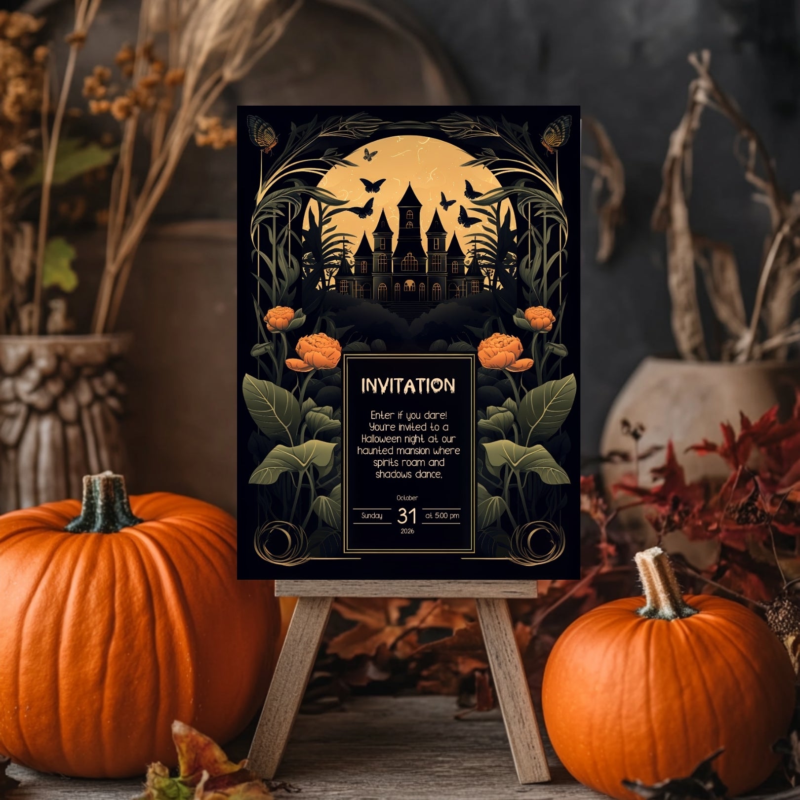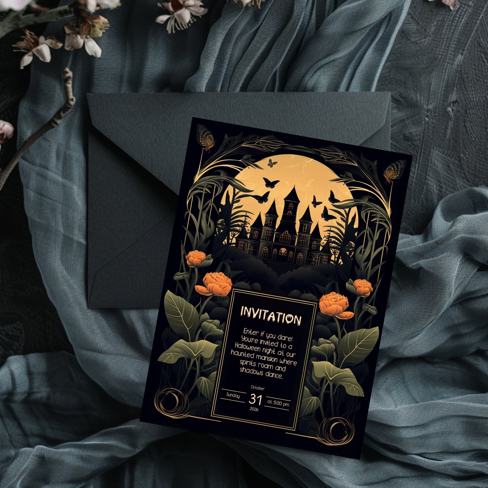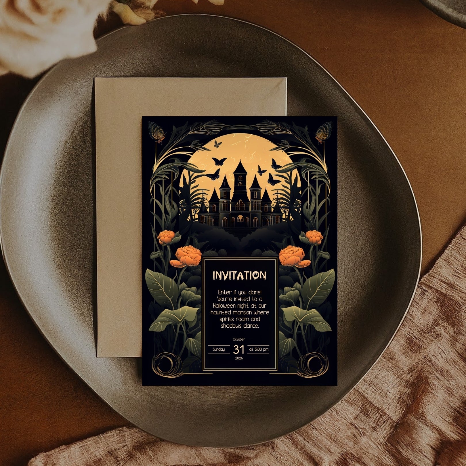 ✔️𝙎𝙩𝙪𝙣𝙣𝙞𝙣𝙜 𝘿𝙚𝙨𝙞𝙜𝙣: This invitation combines Gothic architecture with Art Nouveau flourishes, featuring a spooky mansion, intricate floral motifs, and a rich color palette of black, orange, and gold. The glowing full moon adds an ethereal touch, making it an unforgettable design for your Halloween event.