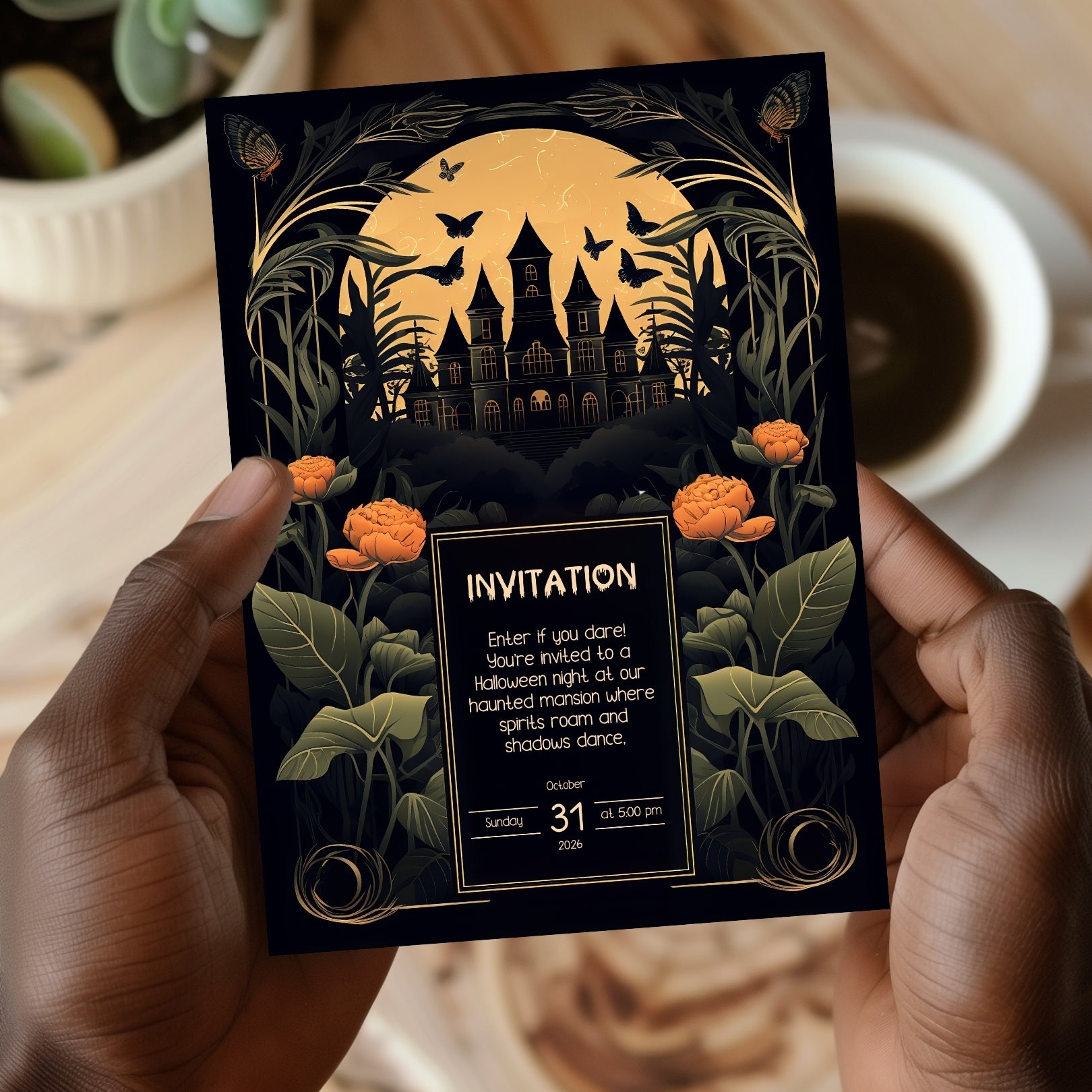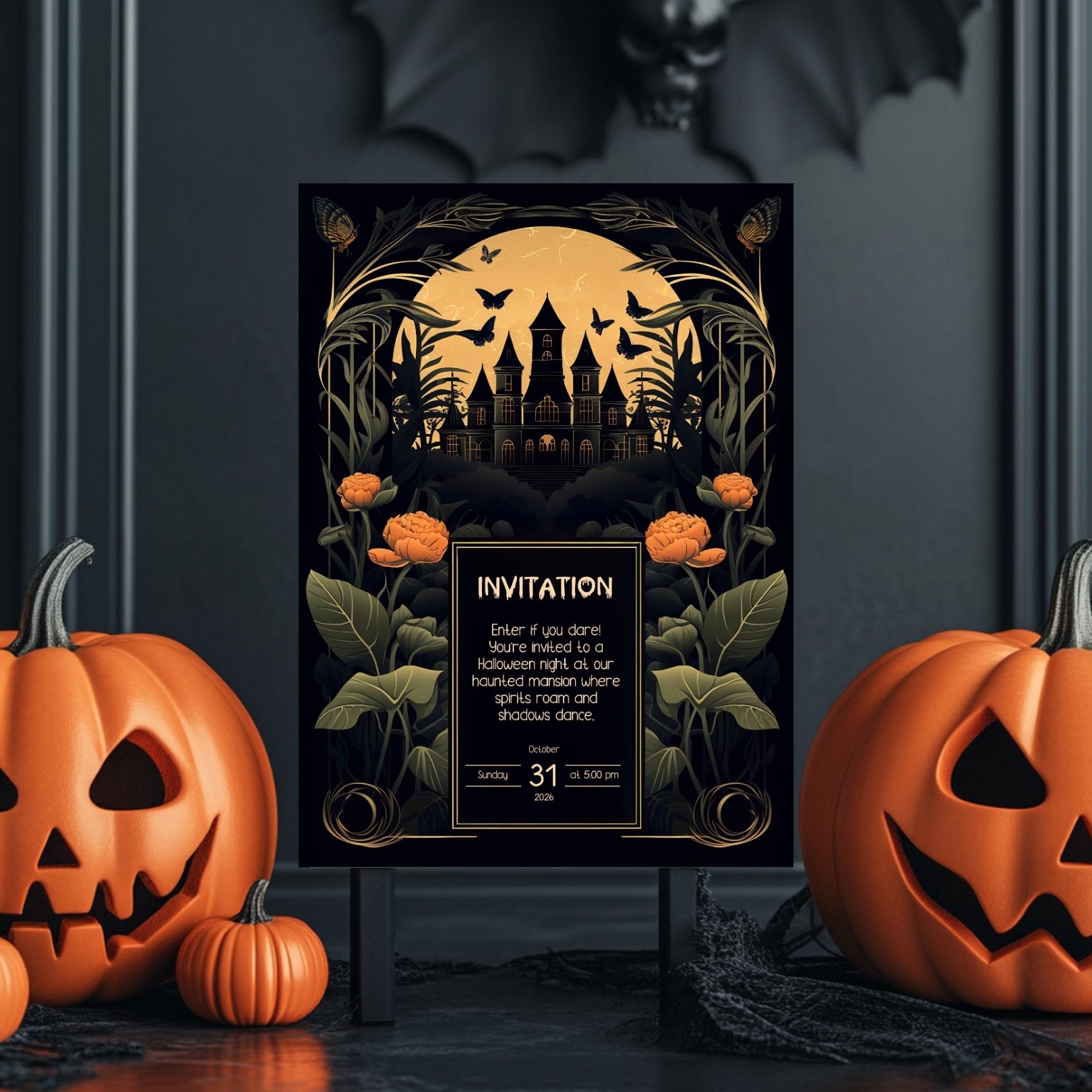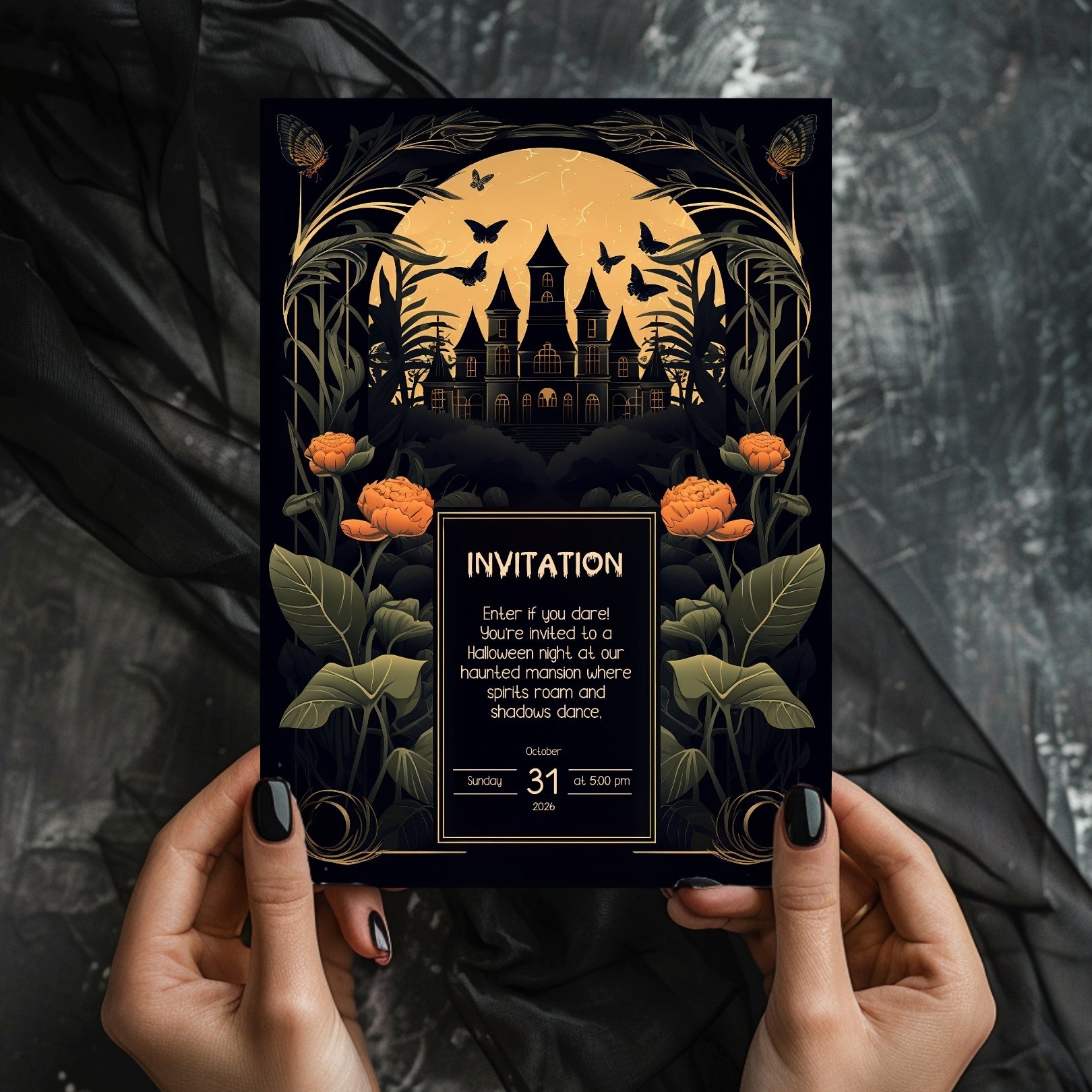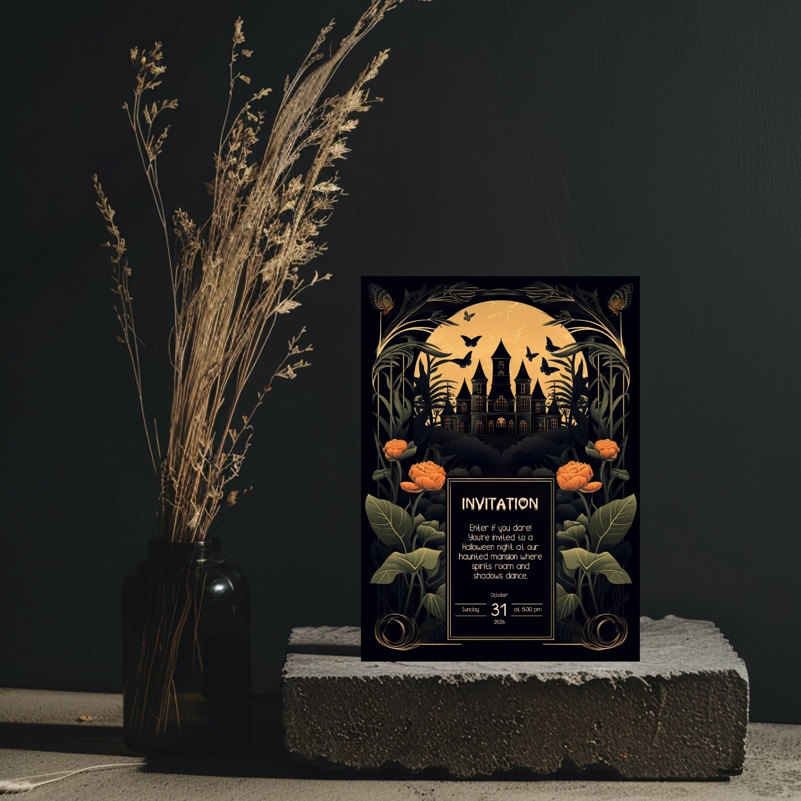 ✔️𝙎𝙩𝙪𝙣𝙣𝙞𝙣𝙜 𝘿𝙚𝙨𝙞𝙜𝙣: This invitation combines Gothic architecture with Art Nouveau flourishes, featuring a spooky mansion, intricate floral motifs, and a rich color palette of black, orange, and gold. The glowing full moon adds an ethereal touch, making it an unforgettable design for your Halloween event.