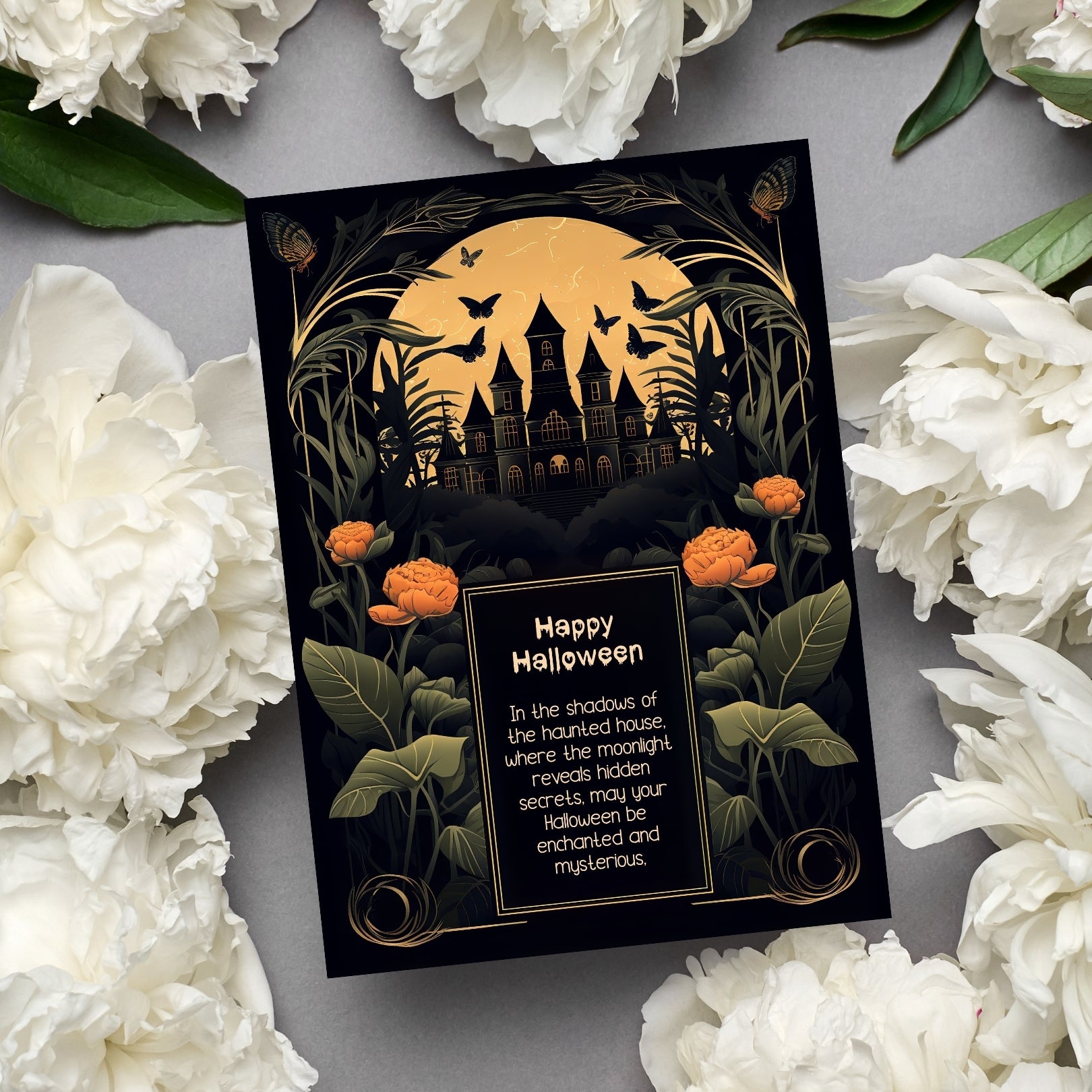 Step into a world of mystery and elegance with this Gothic Art Nouveau Halloween invitation. Perfect for those who appreciate the darker, more refined side of Halloween, this invitation features a hauntingly beautiful design of a silhouetted mansion under a full moon. Surrounded by dark botanical elements and fluttering butterflies, it sets the perfect tone for a night of enchantment and mystery.