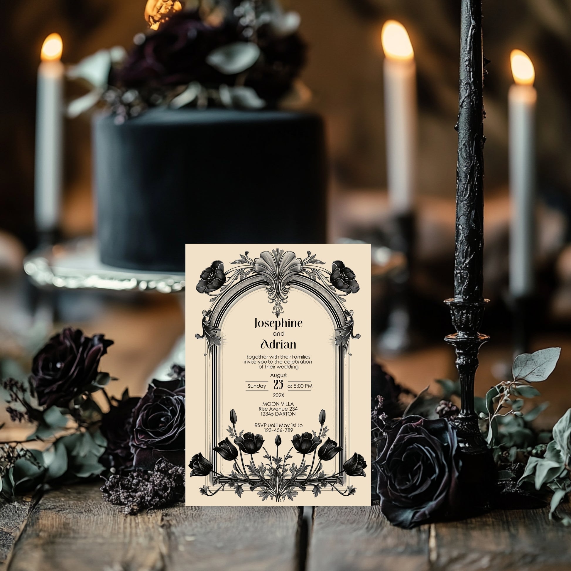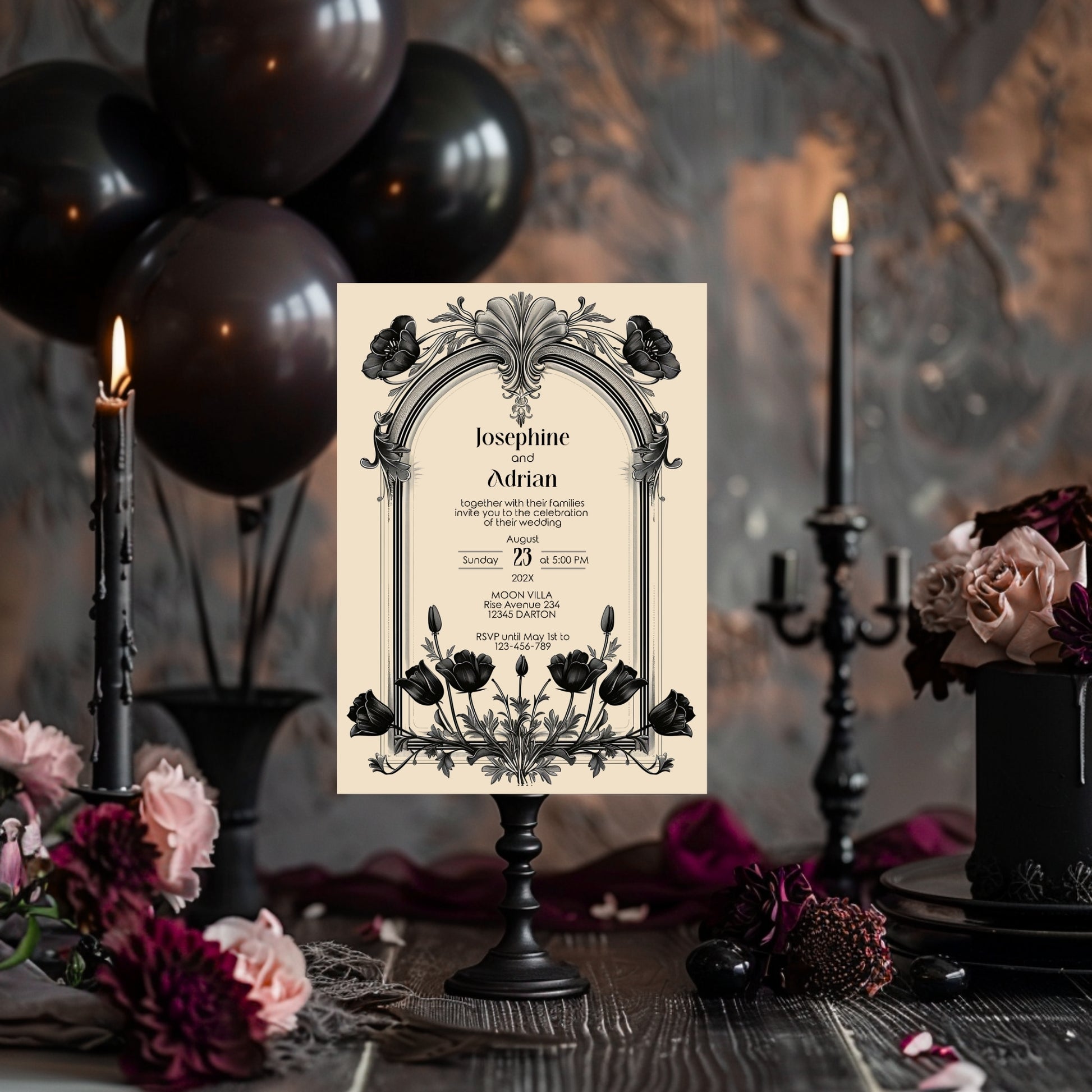 Celebrate your wedding in moody elegance with this Gothic Baroque 3-piece wedding stationery set, featuring a dramatic vintage arch, intricate black poppies, and ornate crest scrollwork. Perfect for couples who adore timeless romance and dark sophistication, this matching suite includes a wedding invitation, details card, and RSVP — ensuring a cohesive and luxurious presentation for your big day.