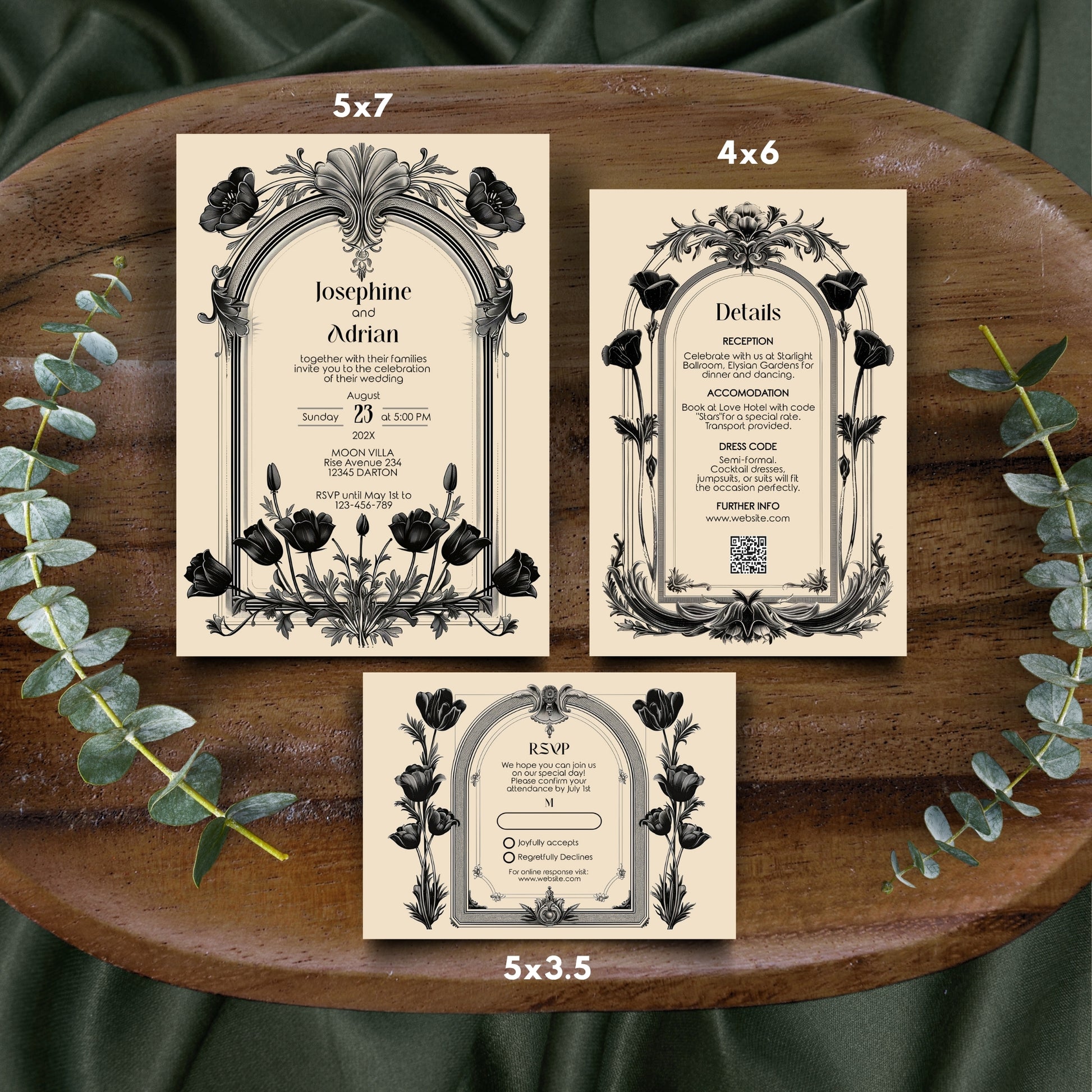 Gothic Baroque Wedding Invitation Set - Vintage Arch and Black Poppy Flowers, Invitation, RSVP & Details Card