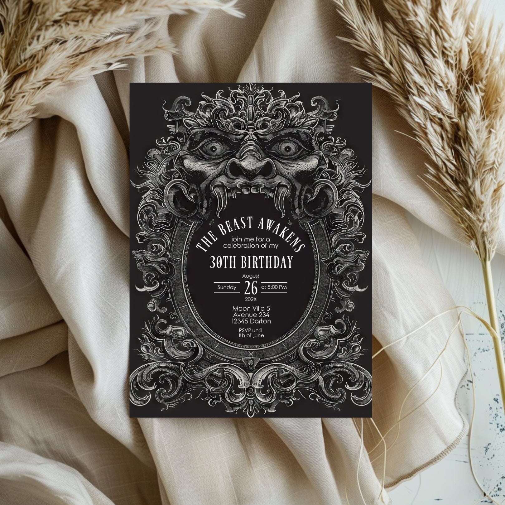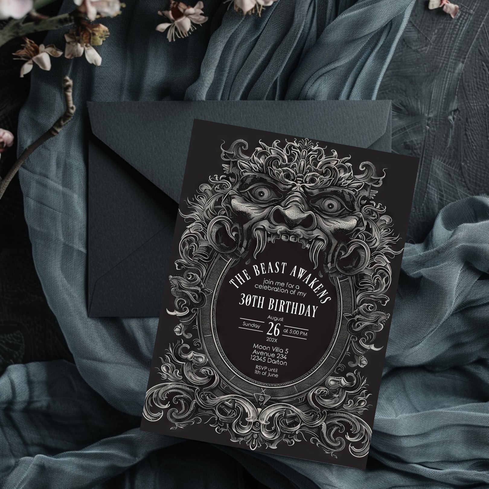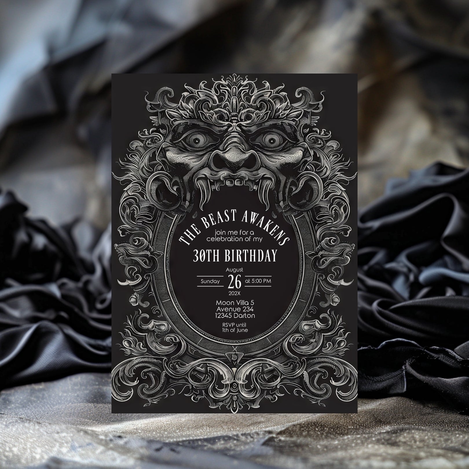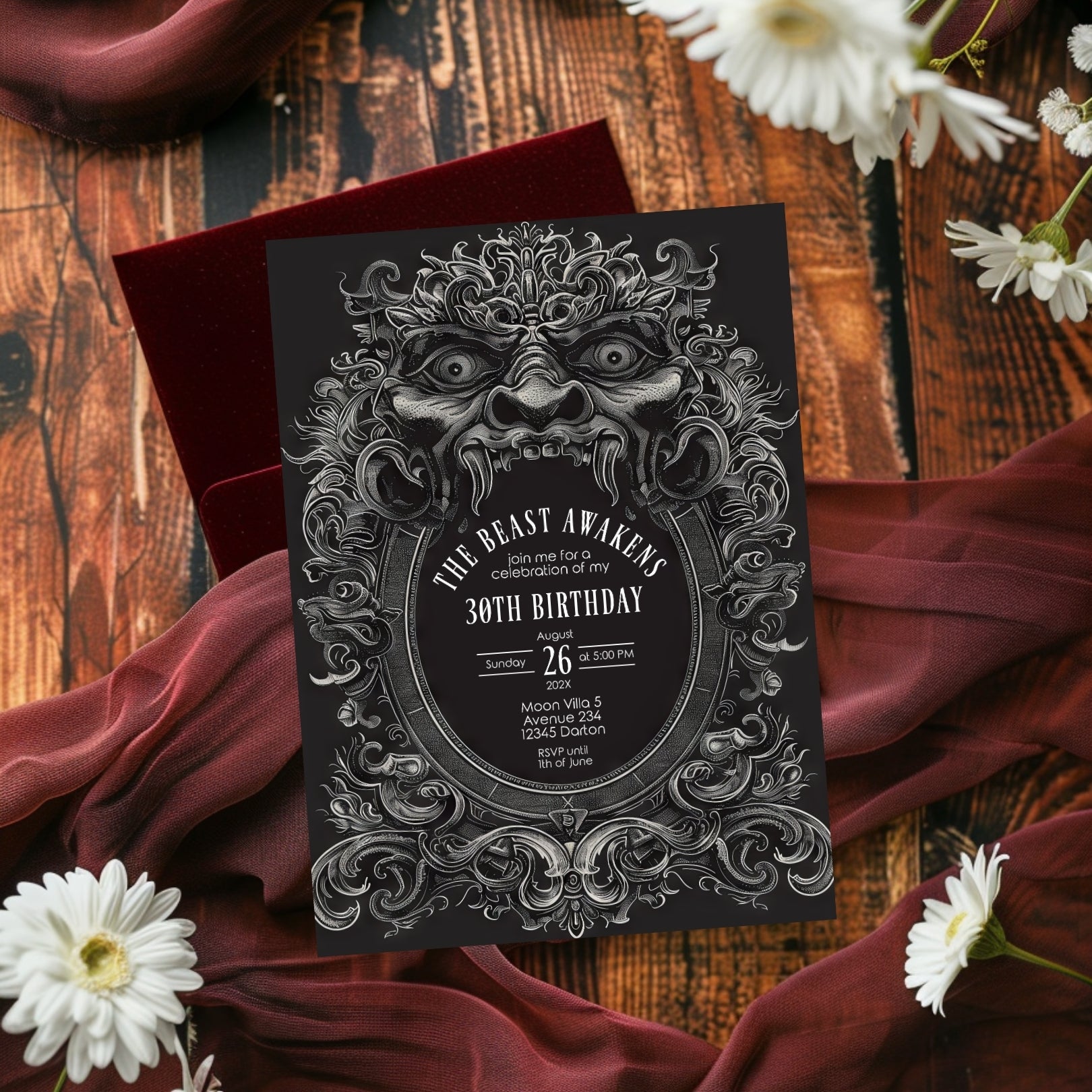 ✔️𝙎𝙩𝙪𝙣𝙣𝙞𝙣𝙜 𝘿𝙚𝙨𝙞𝙜𝙣: The central grotesque face, reminiscent of Chinese dragon art, surrounded by swirling Baroque flourishes in a bold black-and-white palette, creates a dramatic yet elegant invitation that is sure to stand out.