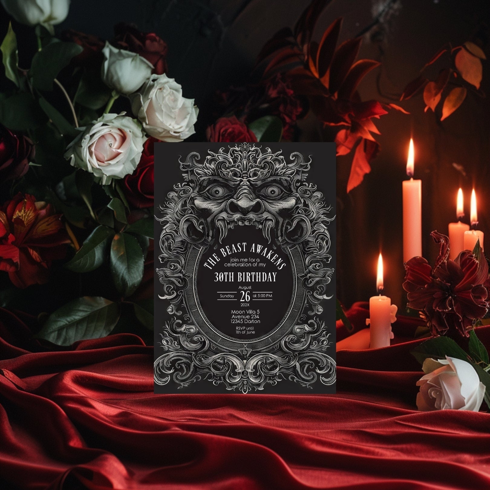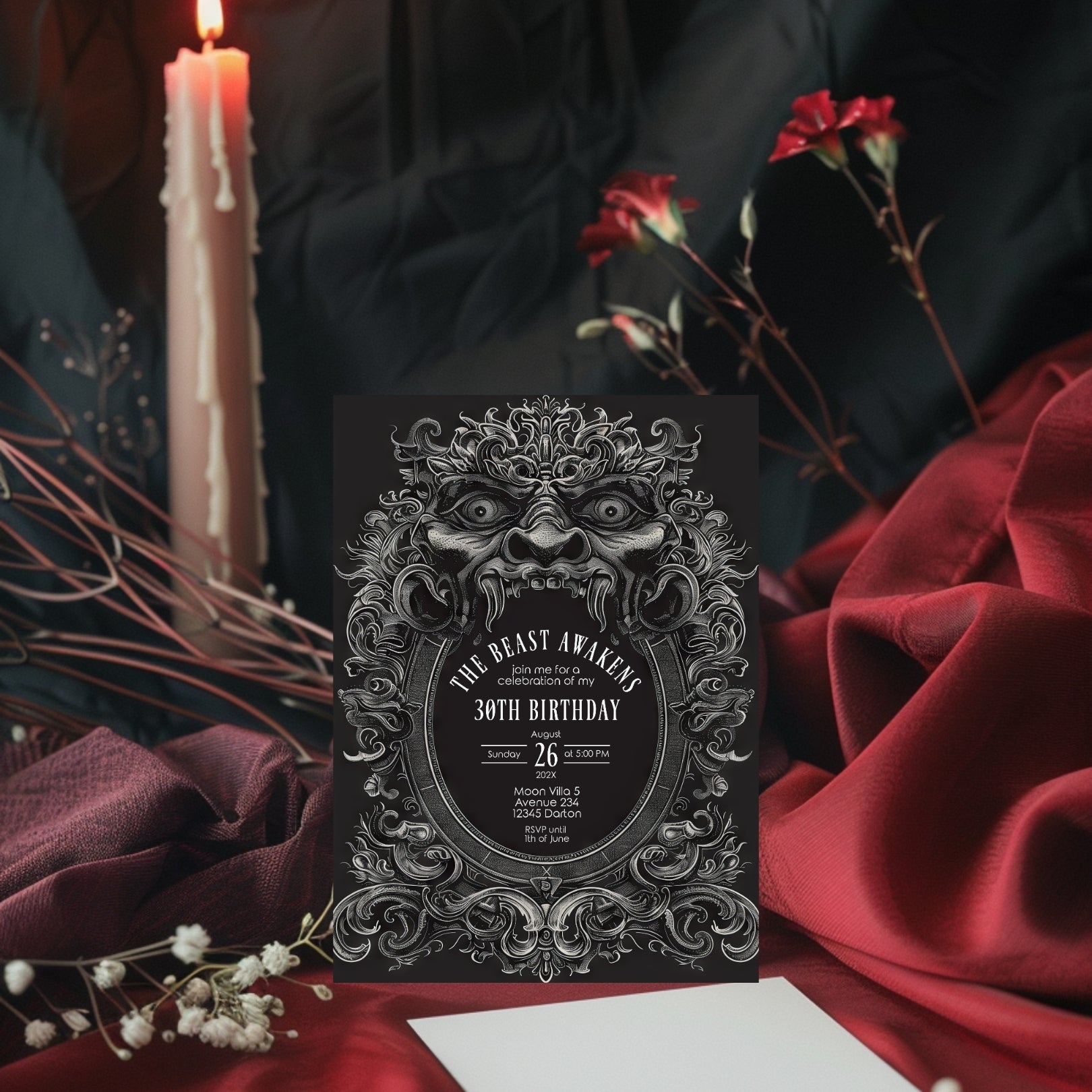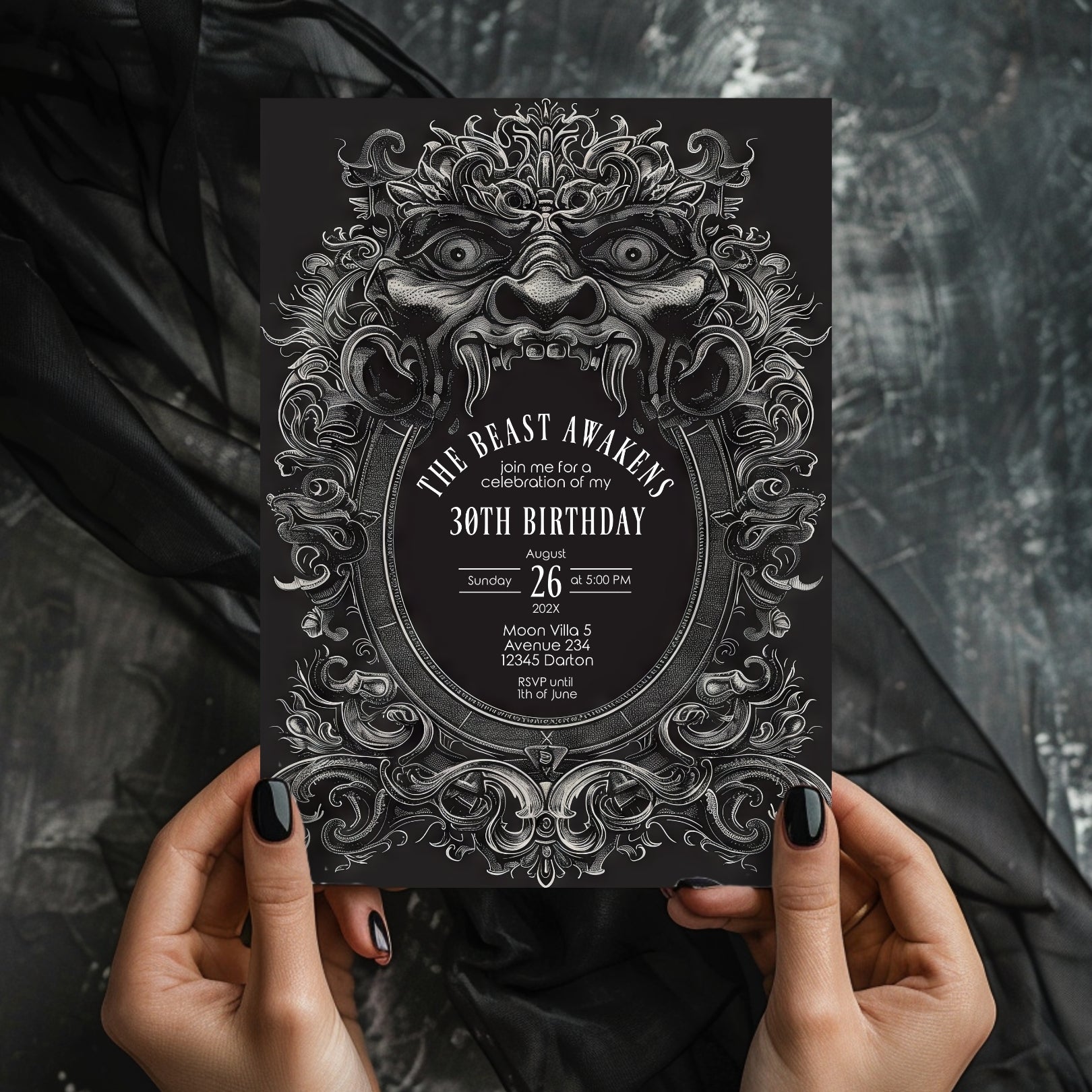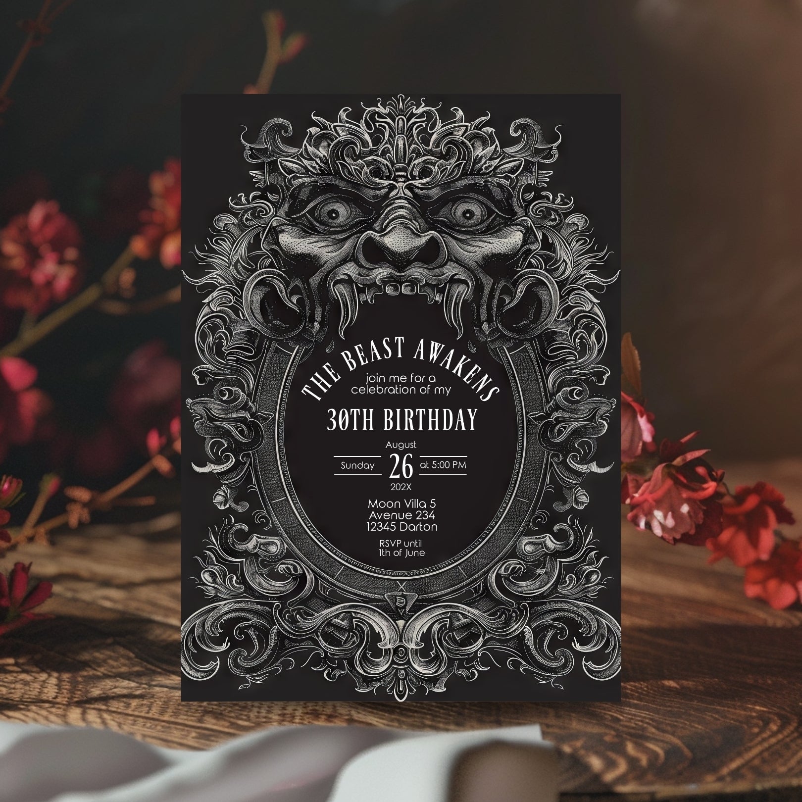 ✔️𝙎𝙩𝙪𝙣𝙣𝙞𝙣𝙜 𝘿𝙚𝙨𝙞𝙜𝙣: The central grotesque face, reminiscent of Chinese dragon art, surrounded by swirling Baroque flourishes in a bold black-and-white palette, creates a dramatic yet elegant invitation that is sure to stand out.