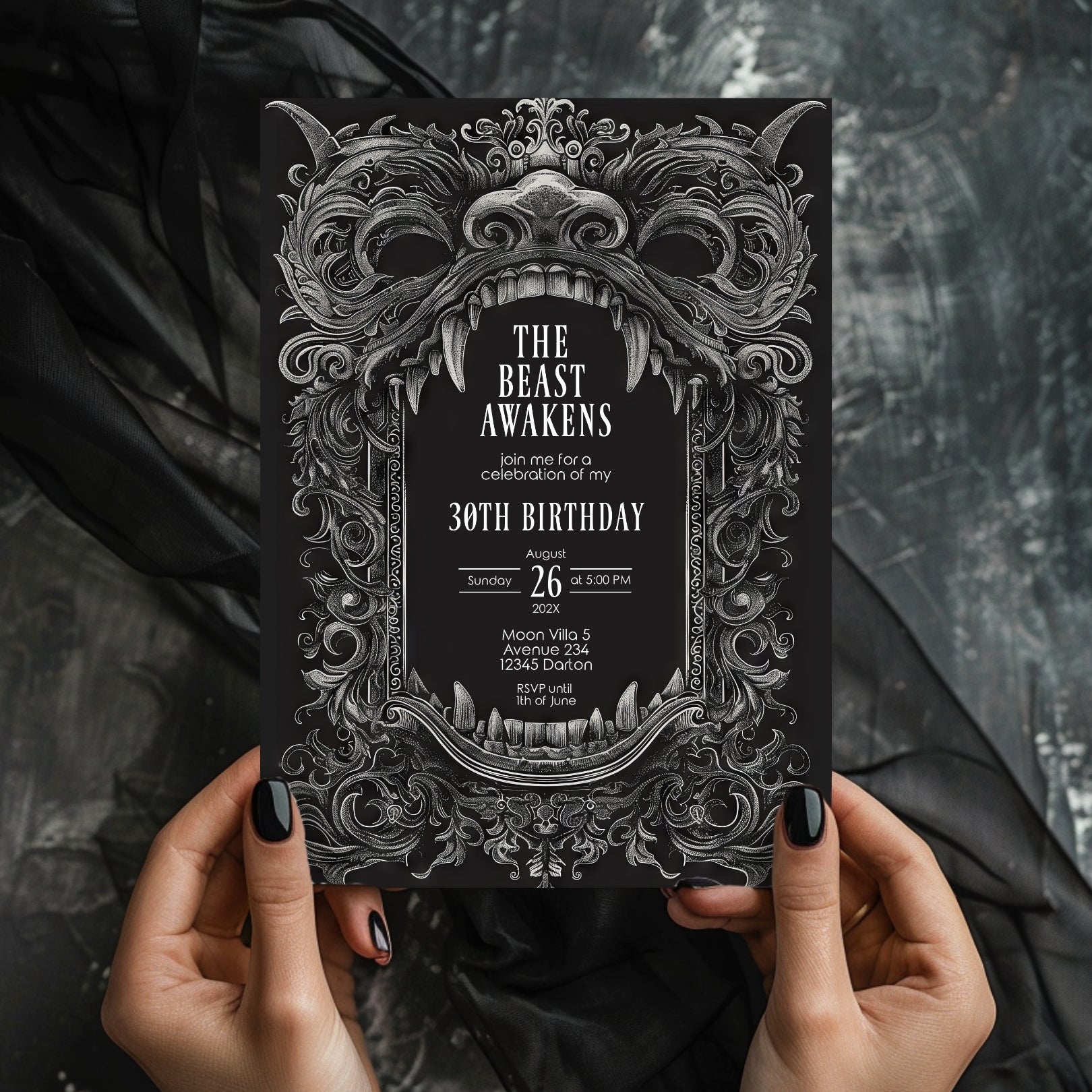 ✔️𝙎𝙩𝙪𝙣𝙣𝙞𝙣𝙜 𝘿𝙚𝙨𝙞𝙜𝙣: A gothic dragon face with fangs surrounds the central event details, while swirling Baroque flourishes add elegance to this black-and-white invitation. Perfect for a dark fantasy, horror-themed, or gothic celebration.