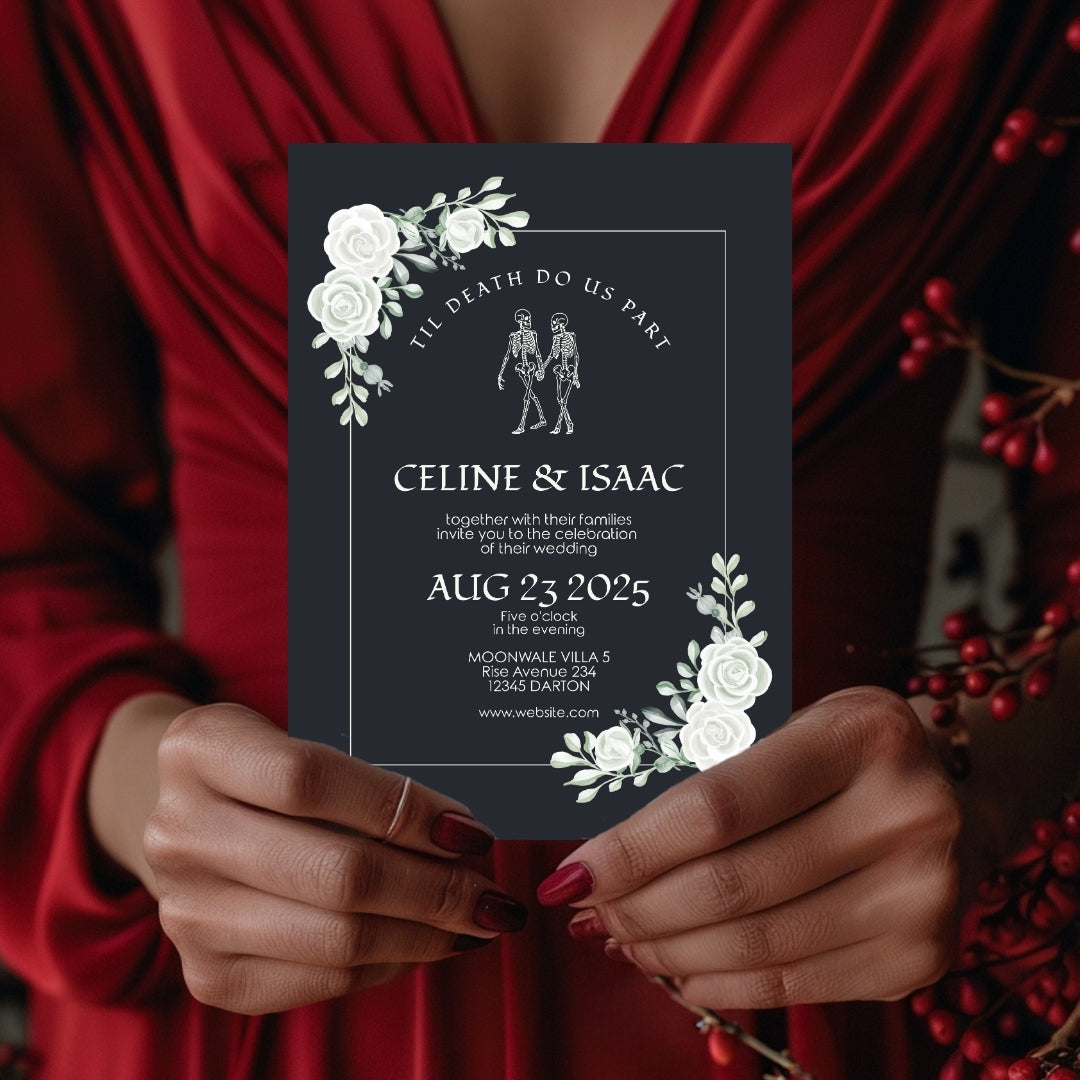 This Gothic Romance Wedding Invitation is a digital ode to love eternal, blending the solemn vow 'Til Death Do Us Part' with an exquisite mix of dark charm and floral sophistication. Perfect for couples celebrating their union with a touch of the ethereal, this template is ideal for weddings, anniversaries, or other mystical gatherings. Adorned with elegant white roses and eucalyptus against a stark black backdrop, it sets the tone for a ceremony that's as unforgettable as the promise made. Fully customizable with Corjl, this invitation is designed to be printed at home or by a professional, or shared with the ease of digital technology.