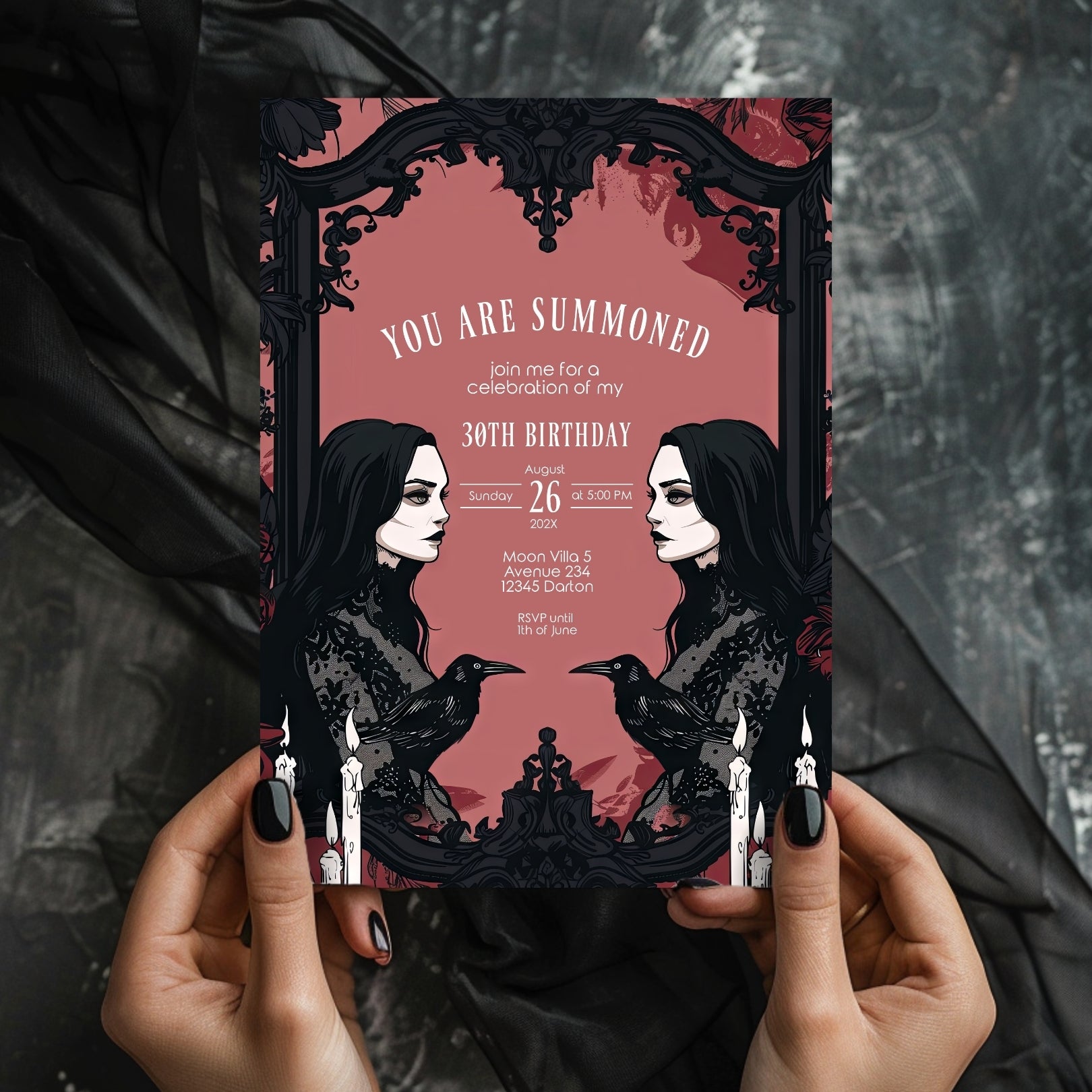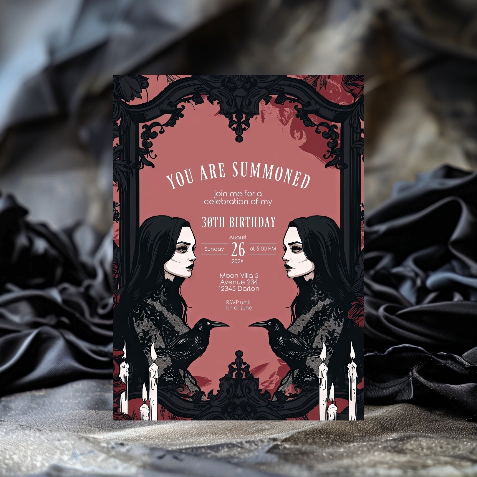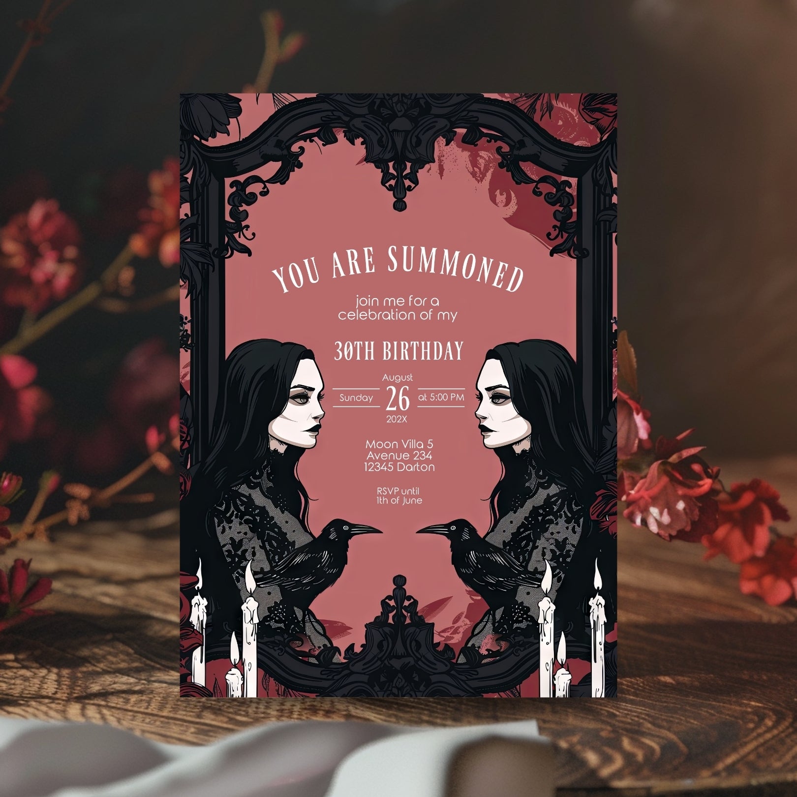 Summon your guests with this Gothic Raven and Victorian Witch Birthday Party Invitation, perfect for anyone who loves dark fantasy and gothic themes. Featuring two gothic women mirrored in a Victorian-style frame, accompanied by ravens, candles, and dark roses, this invitation is ideal for a unique and mysterious birthday celebration.