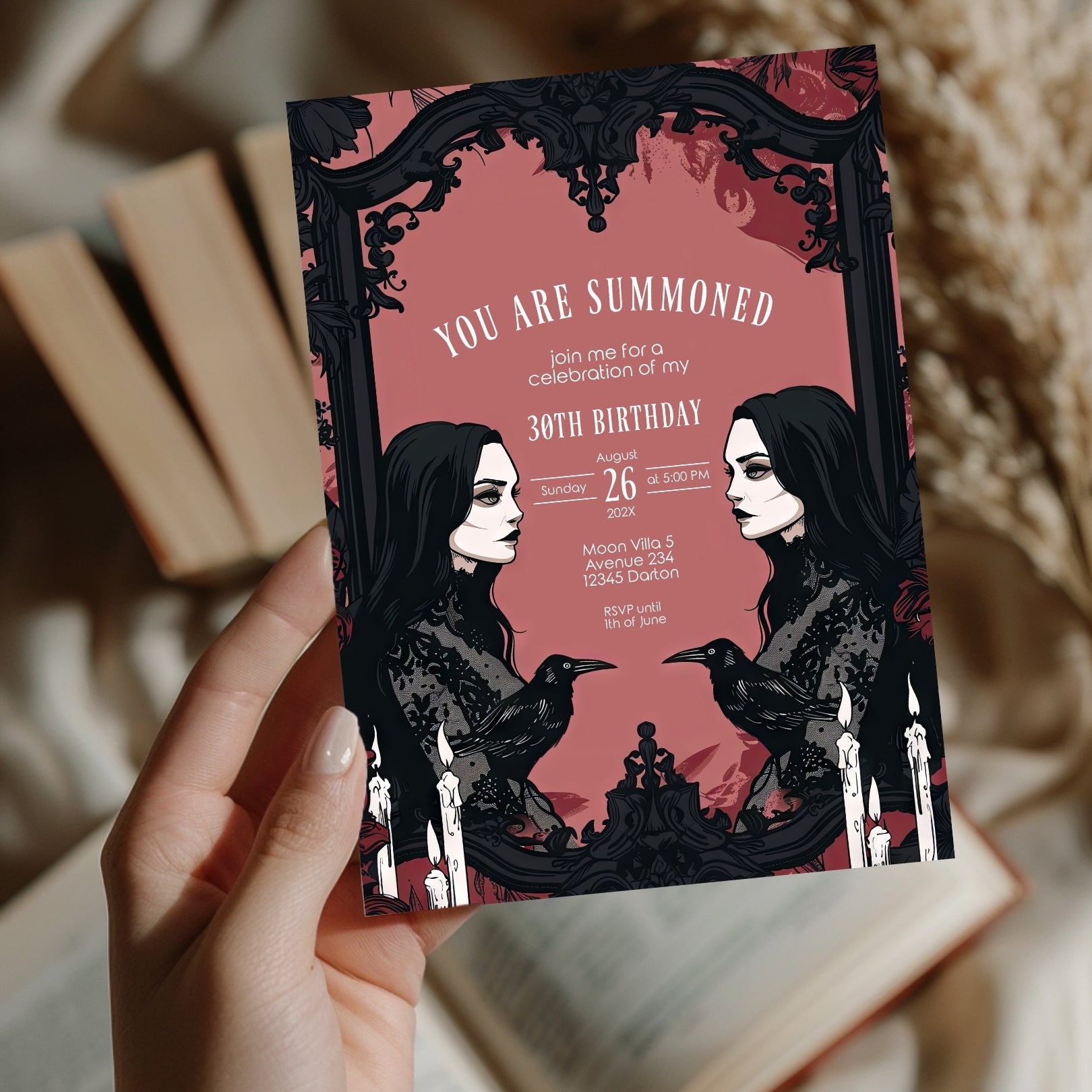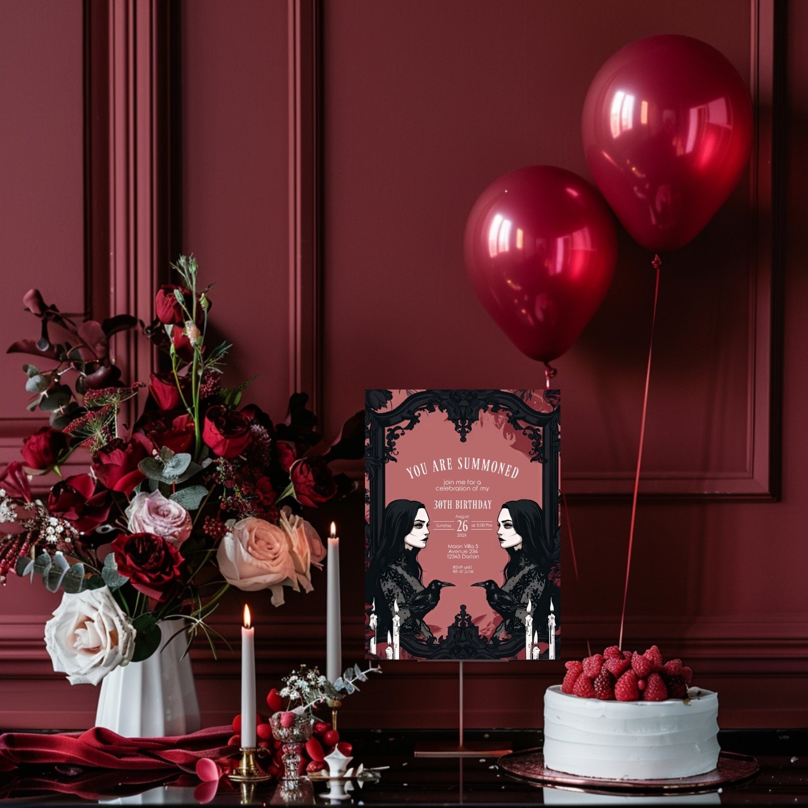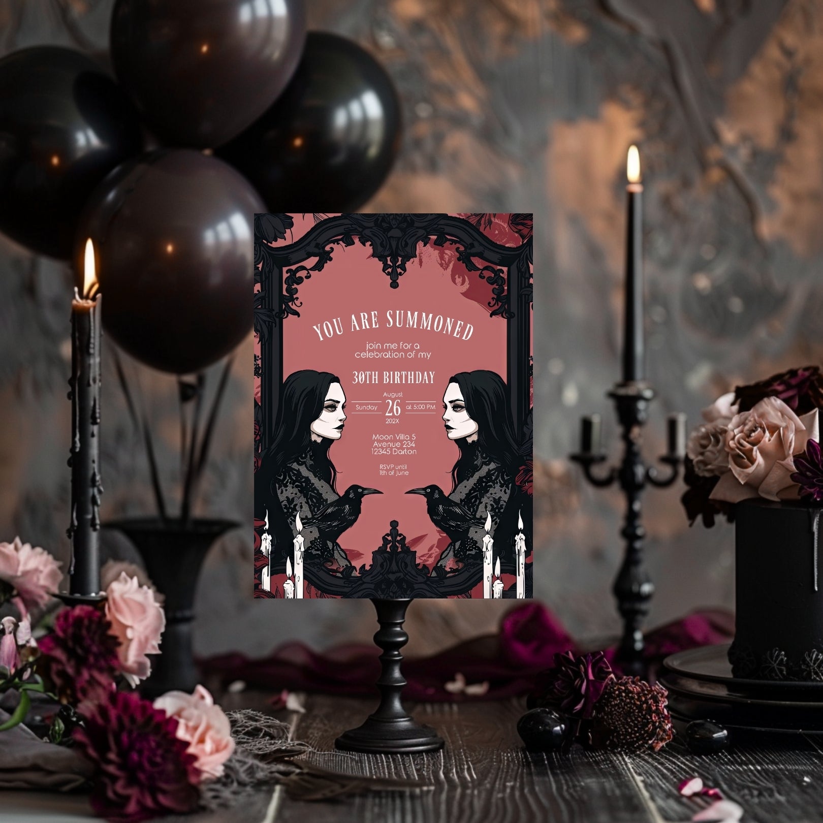 Summon your guests with this Gothic Raven and Victorian Witch Birthday Party Invitation, perfect for anyone who loves dark fantasy and gothic themes. Featuring two gothic women mirrored in a Victorian-style frame, accompanied by ravens, candles, and dark roses, this invitation is ideal for a unique and mysterious birthday celebration.