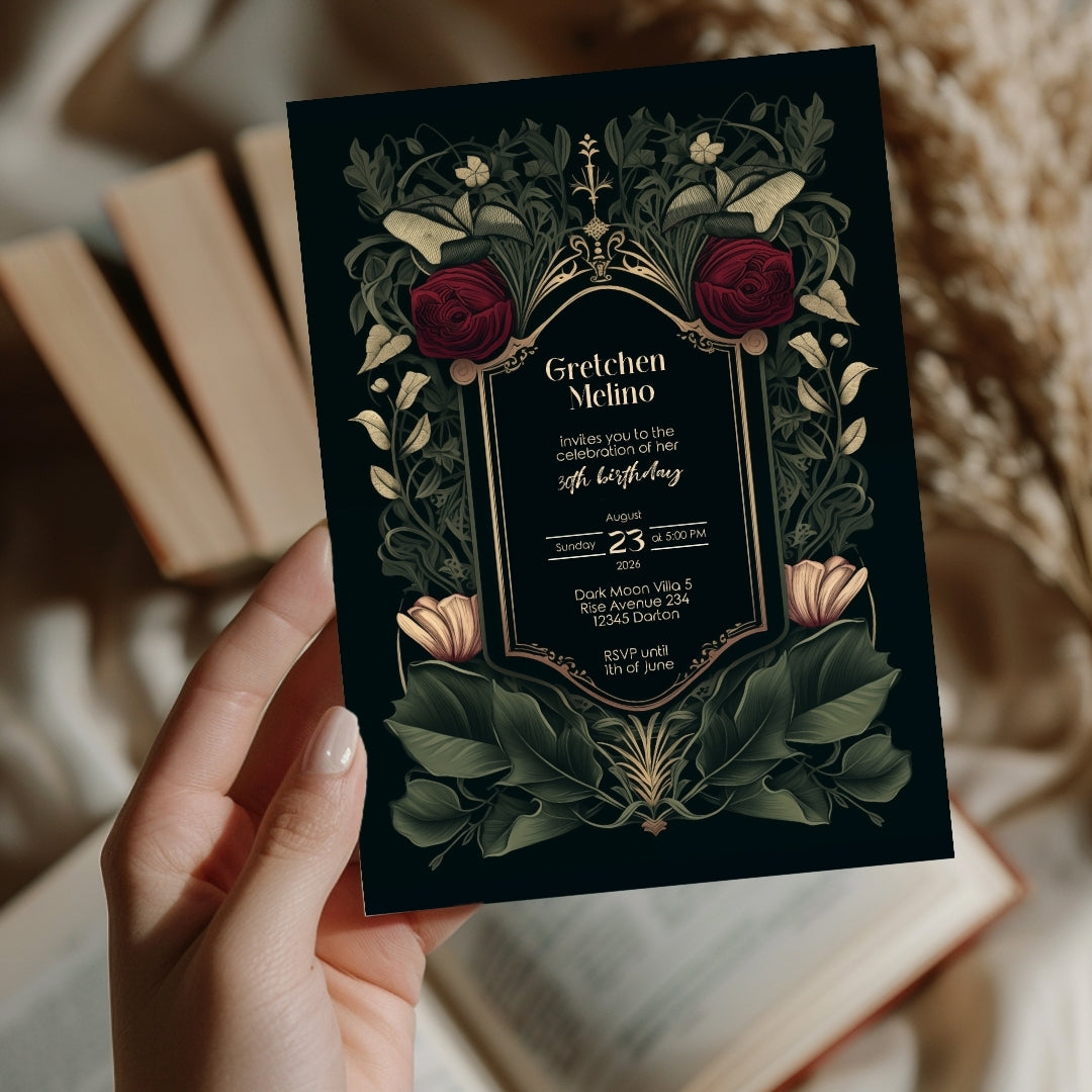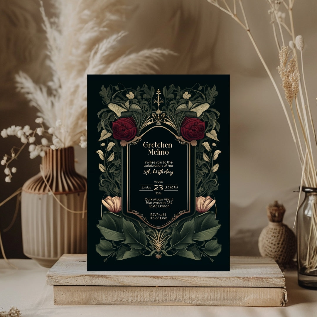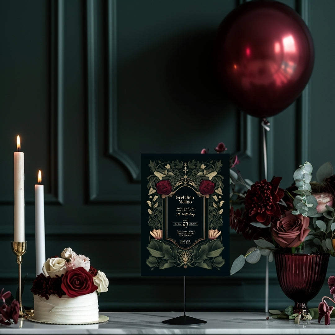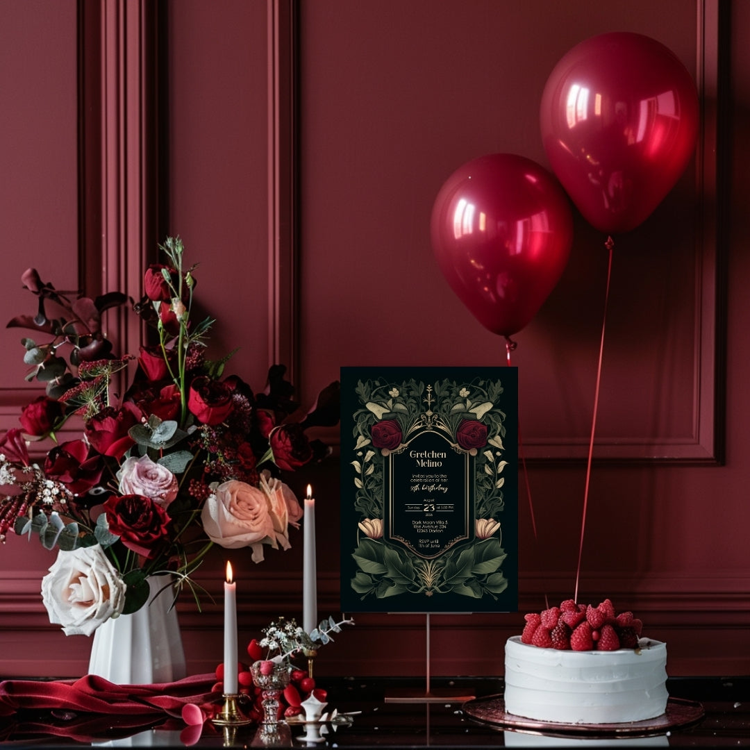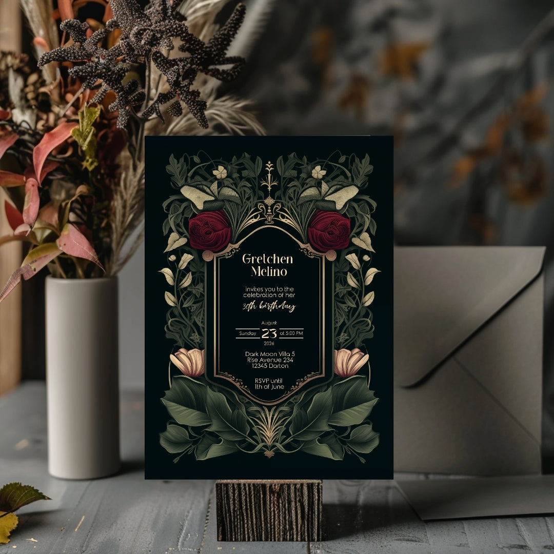 Summon the splendor of nature and the elegance of a bygone era with this Enchanted Garden Frame Birthday Invitation, your gateway to an unforgettable celebration. With every year that passes, there are stories to be told and moments to be cherished—let the announcement of your 30th, 40th, 50th birthday, or any esteemed occasion, reflect this narrative richness. Set upon a canvas of deep forest green, this template features an ornate frame of gilded filigree, intertwined with roses of the deepest crimson and botanicals in shades of sage and gold. This timeless digital template allows you to evoke a sense of enchantment that will allure your guests, hinting at the majesty of the festivities to come. Tailor with ease using Corjl and share your unique celebration in print or digitally, as you prefer.