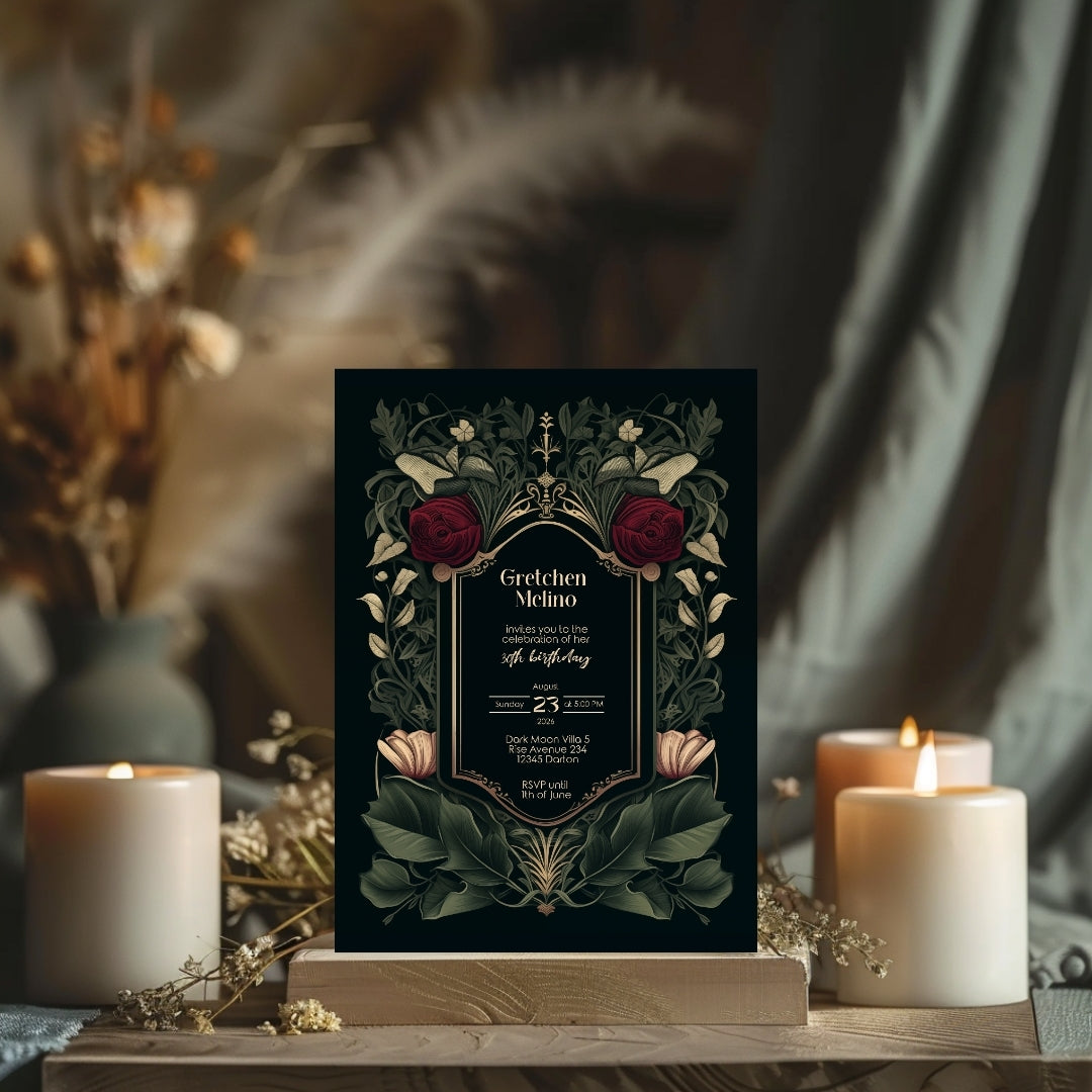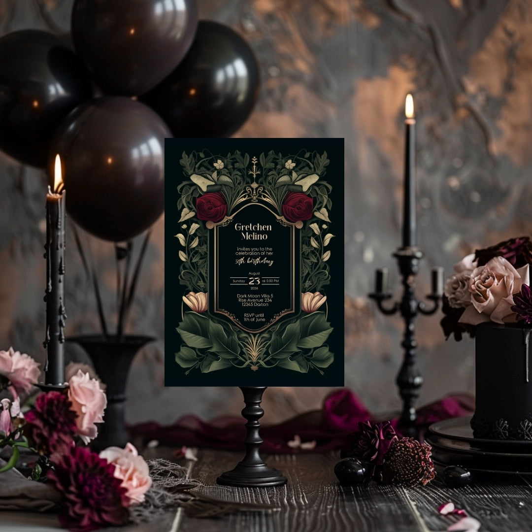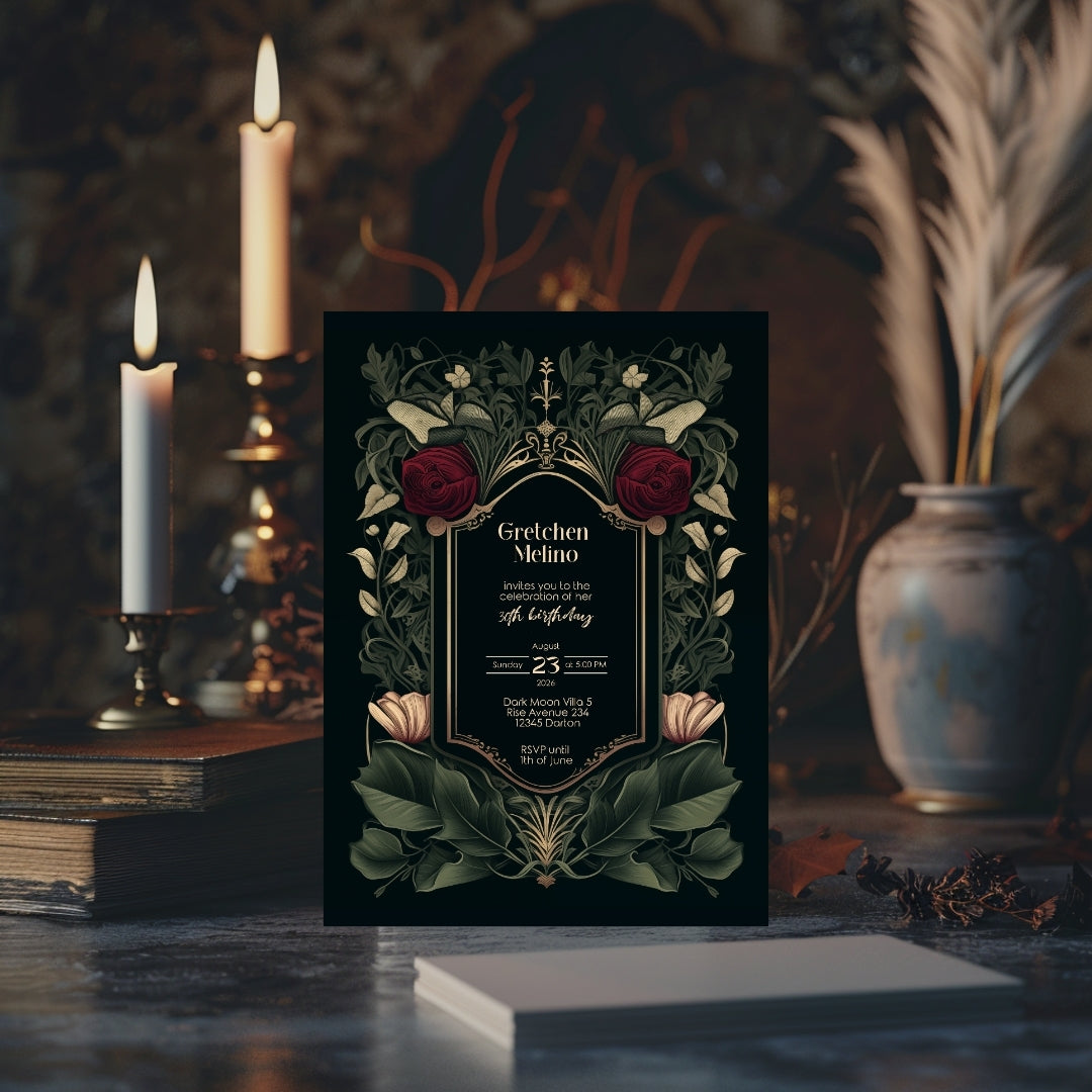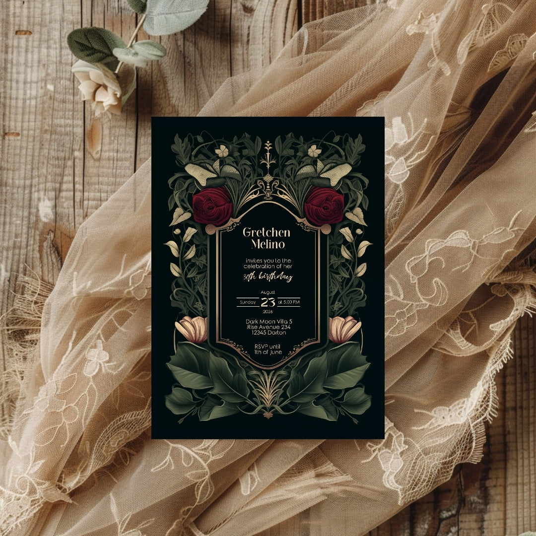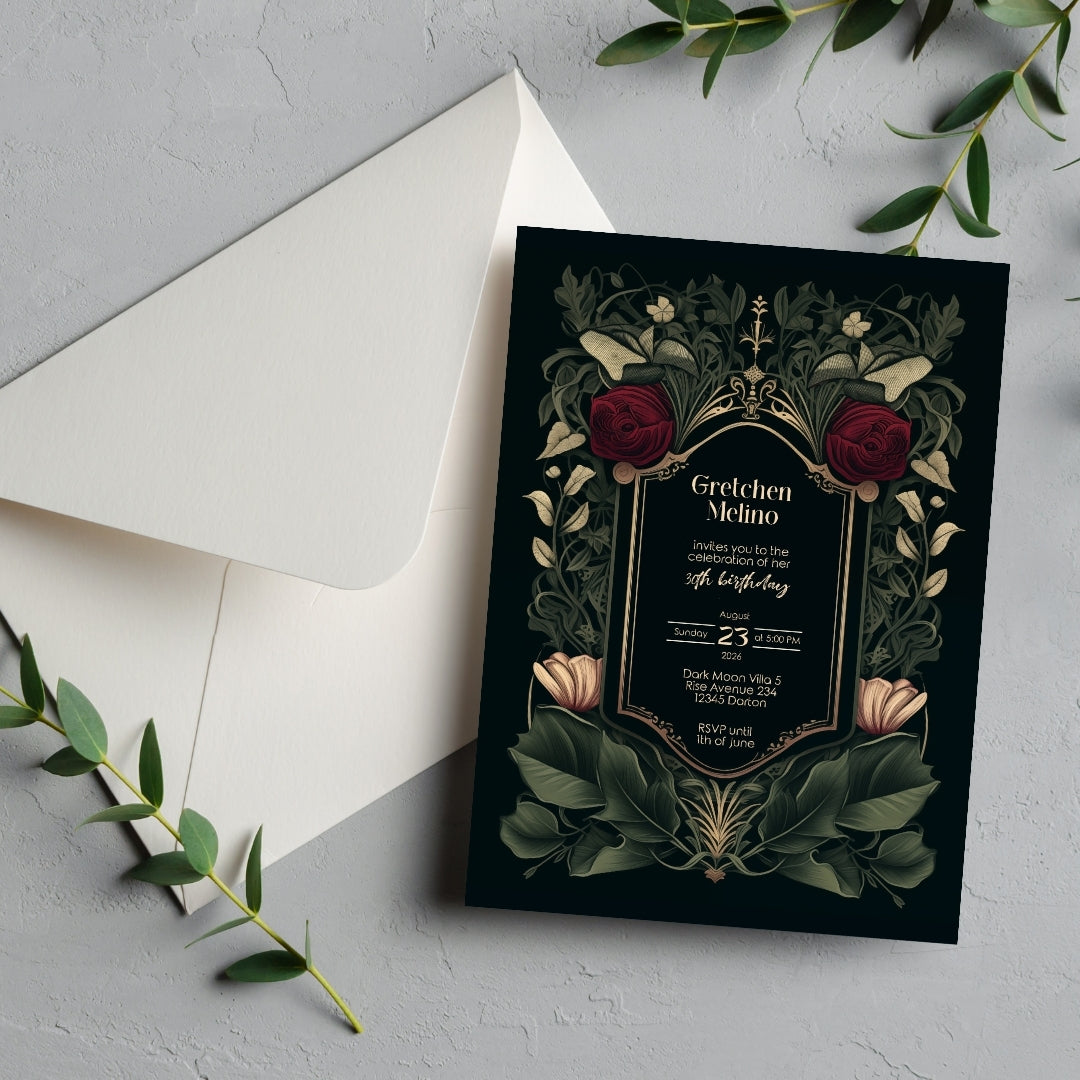 Summon the splendor of nature and the elegance of a bygone era with this Enchanted Garden Frame Birthday Invitation, your gateway to an unforgettable celebration. With every year that passes, there are stories to be told and moments to be cherished—let the announcement of your 30th, 40th, 50th birthday, or any esteemed occasion, reflect this narrative richness. Set upon a canvas of deep forest green, this template features an ornate frame of gilded filigree, intertwined with roses of the deepest crimson and botanicals in shades of sage and gold. This timeless digital template allows you to evoke a sense of enchantment that will allure your guests, hinting at the majesty of the festivities to come. Tailor with ease using Corjl and share your unique celebration in print or digitally, as you prefer.