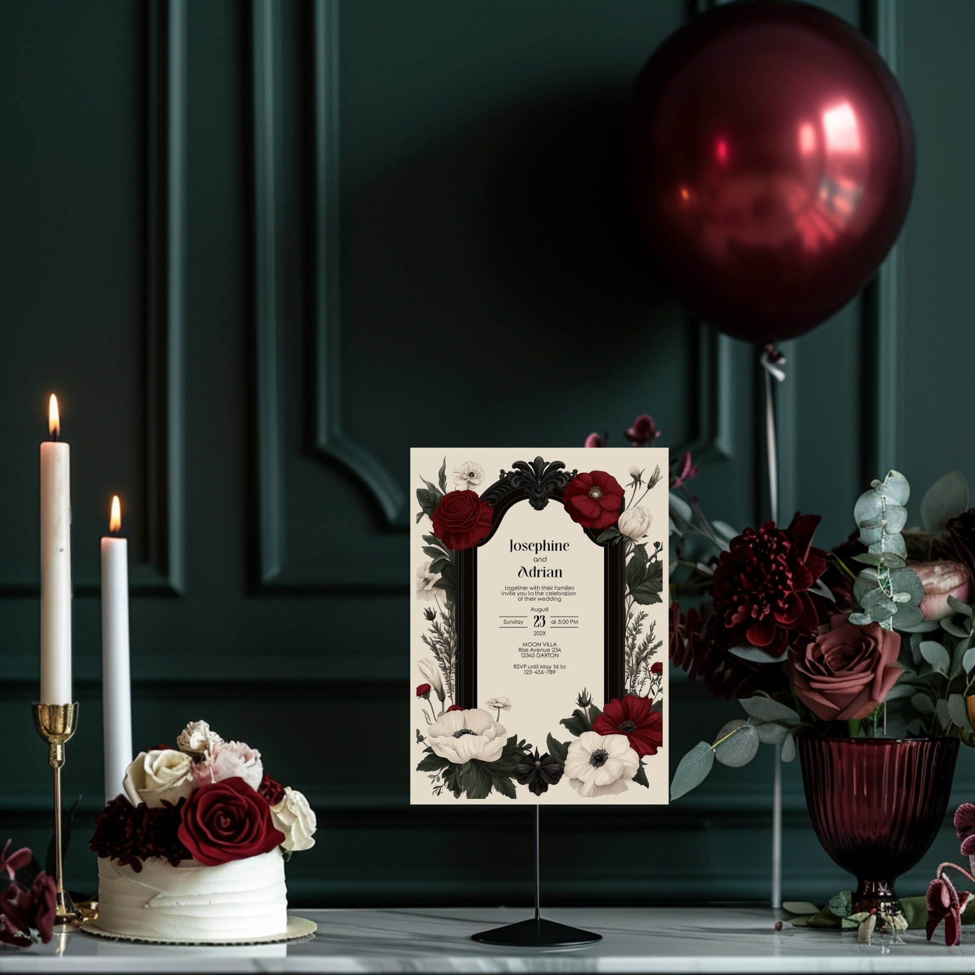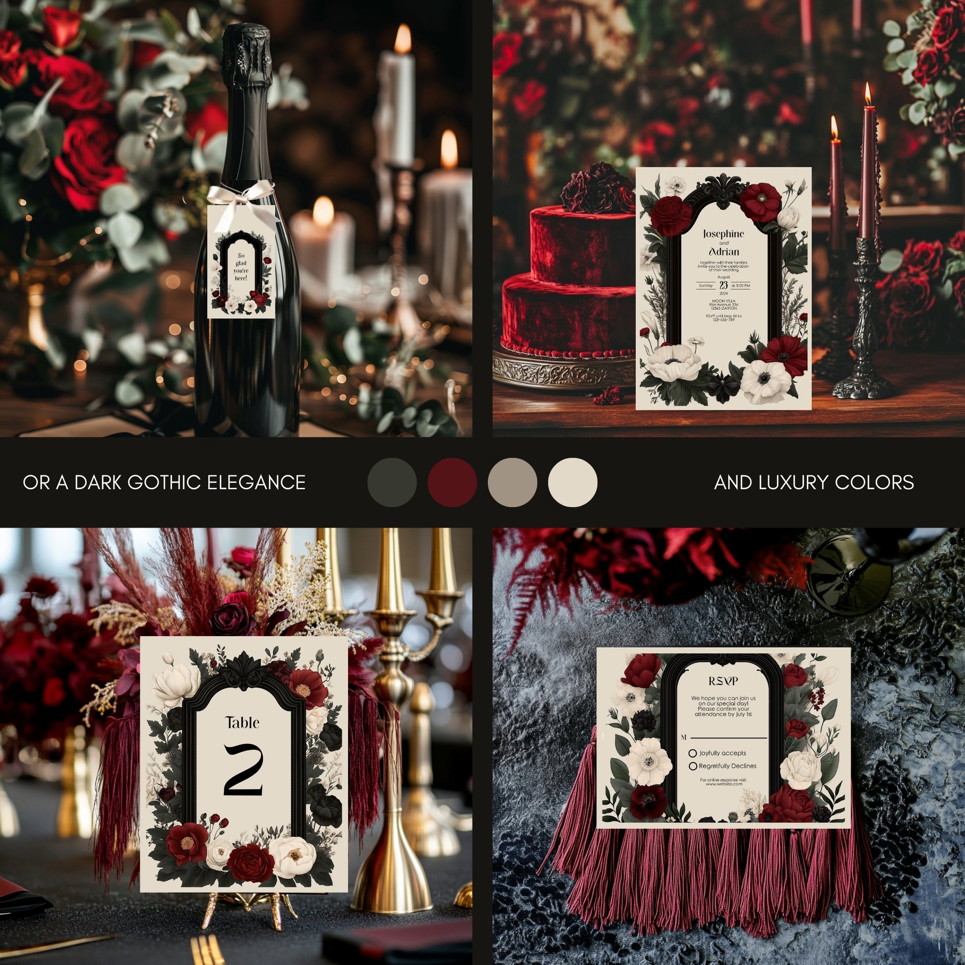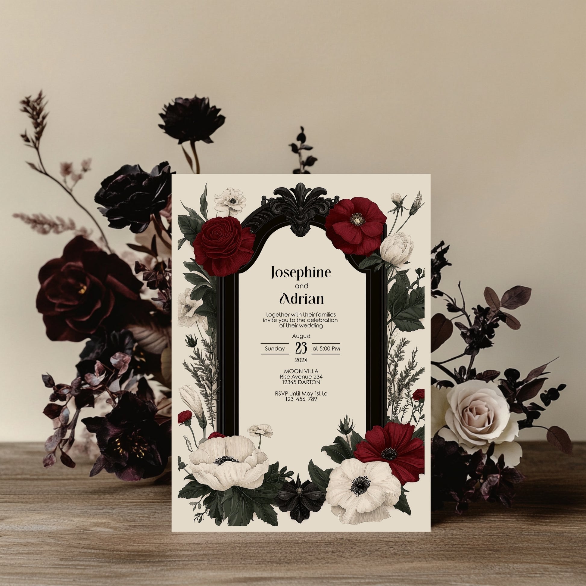 Set a dramatic and romantic tone for your wedding with this Gothic Elegance wedding stationery set. Featuring ornate black baroque frames, deep red and ivory florals, and vintage-inspired detailing, this 8-piece bundle is perfect for gothic weddings, dark romance themes, Victorian-inspired celebrations, and alternative events. The rich floral arrangements of roses and anemones paired with the classic black and cream color palette create an atmosphere of moody sophistication. Fully editable and available for instant download, this printable set allows for effortless customization and stunning printed results.