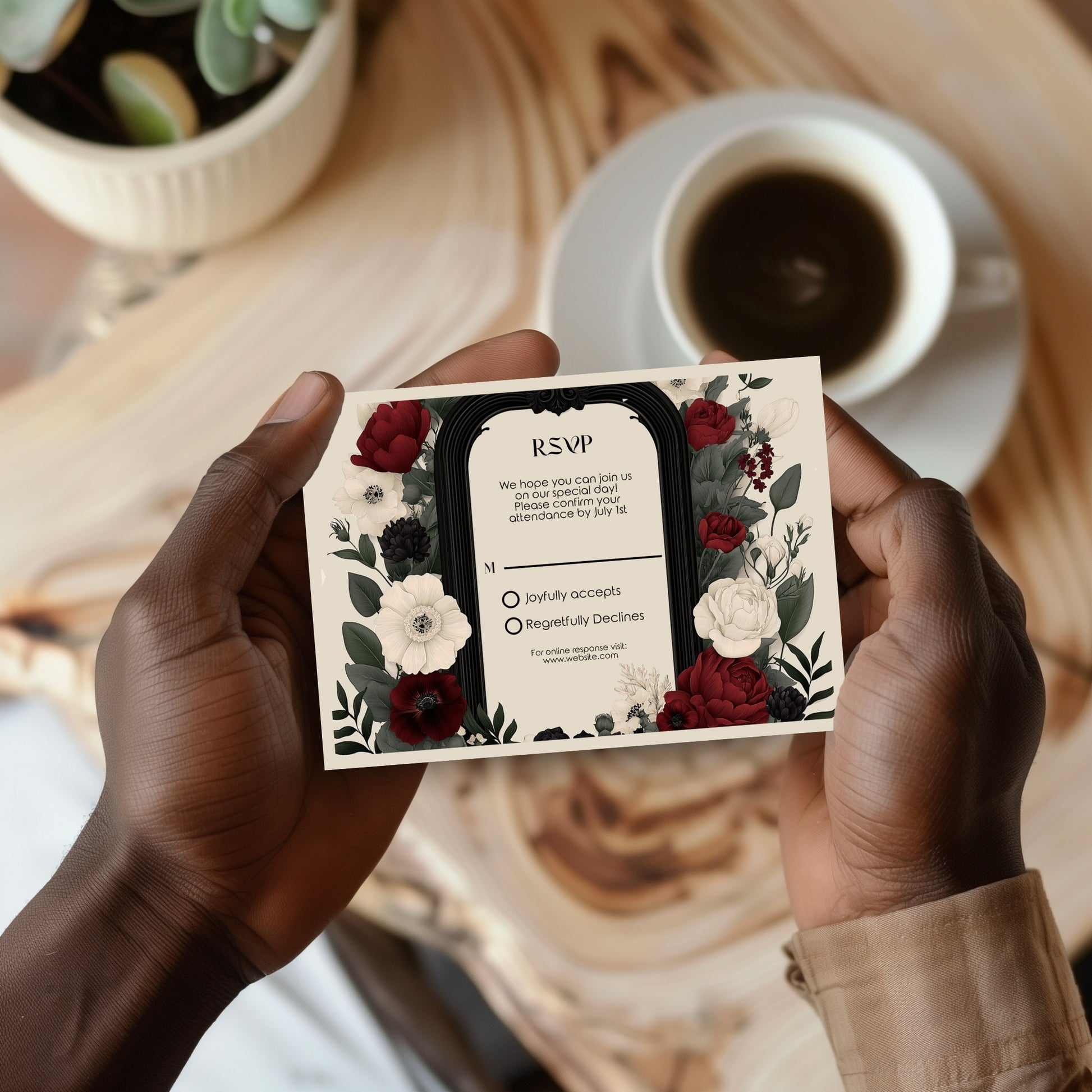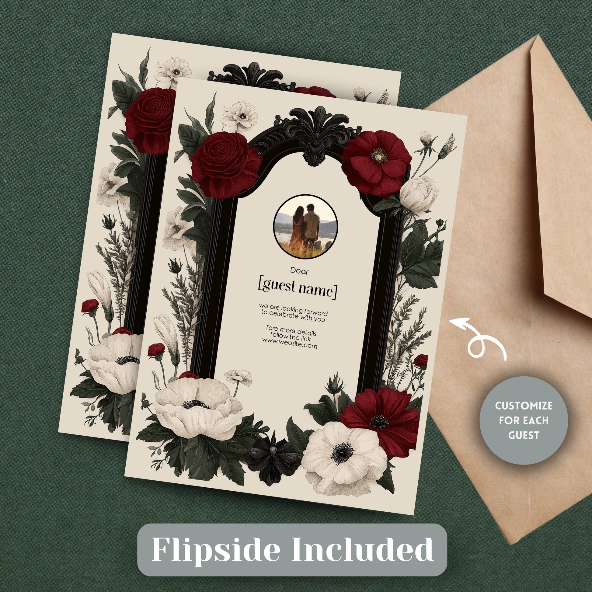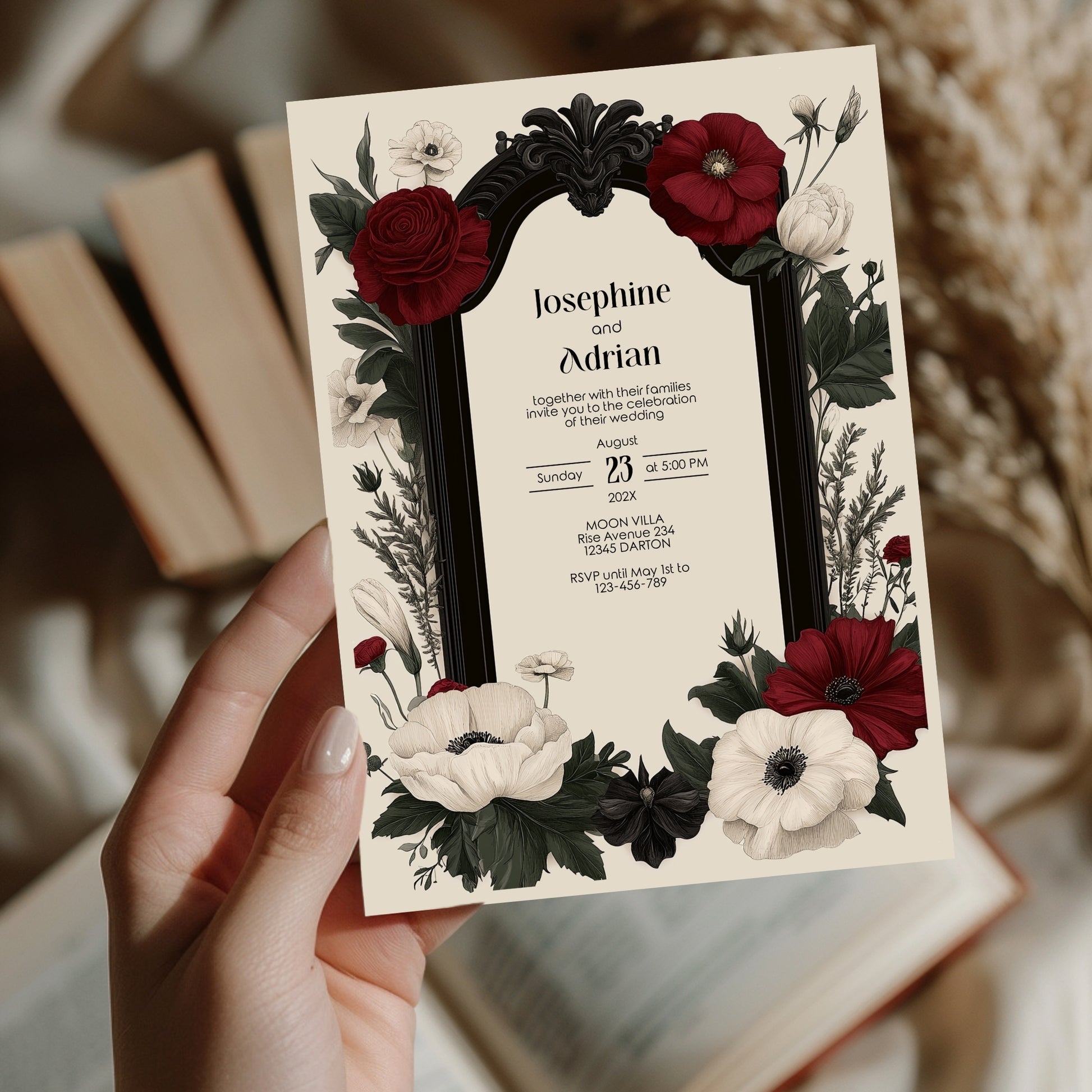 Set a dramatic and romantic tone for your wedding with this Gothic Elegance wedding stationery set. Featuring ornate black baroque frames, deep red and ivory florals, and vintage-inspired detailing, this 8-piece bundle is perfect for gothic weddings, dark romance themes, Victorian-inspired celebrations, and alternative events. The rich floral arrangements of roses and anemones paired with the classic black and cream color palette create an atmosphere of moody sophistication. Fully editable and available for instant download, this printable set allows for effortless customization and stunning printed results.
