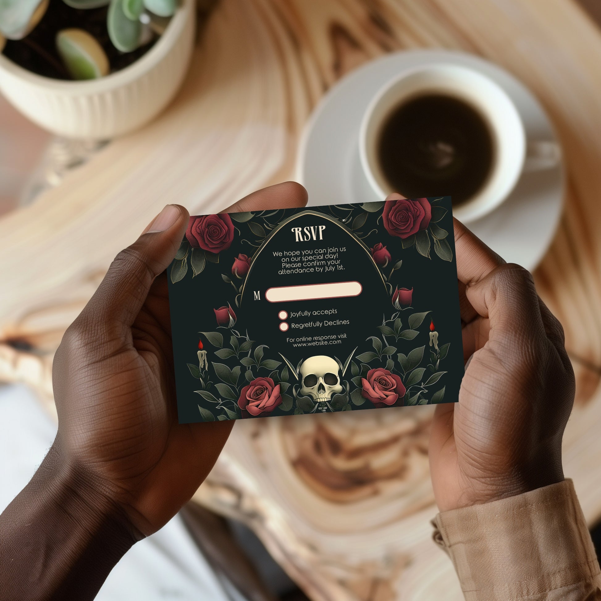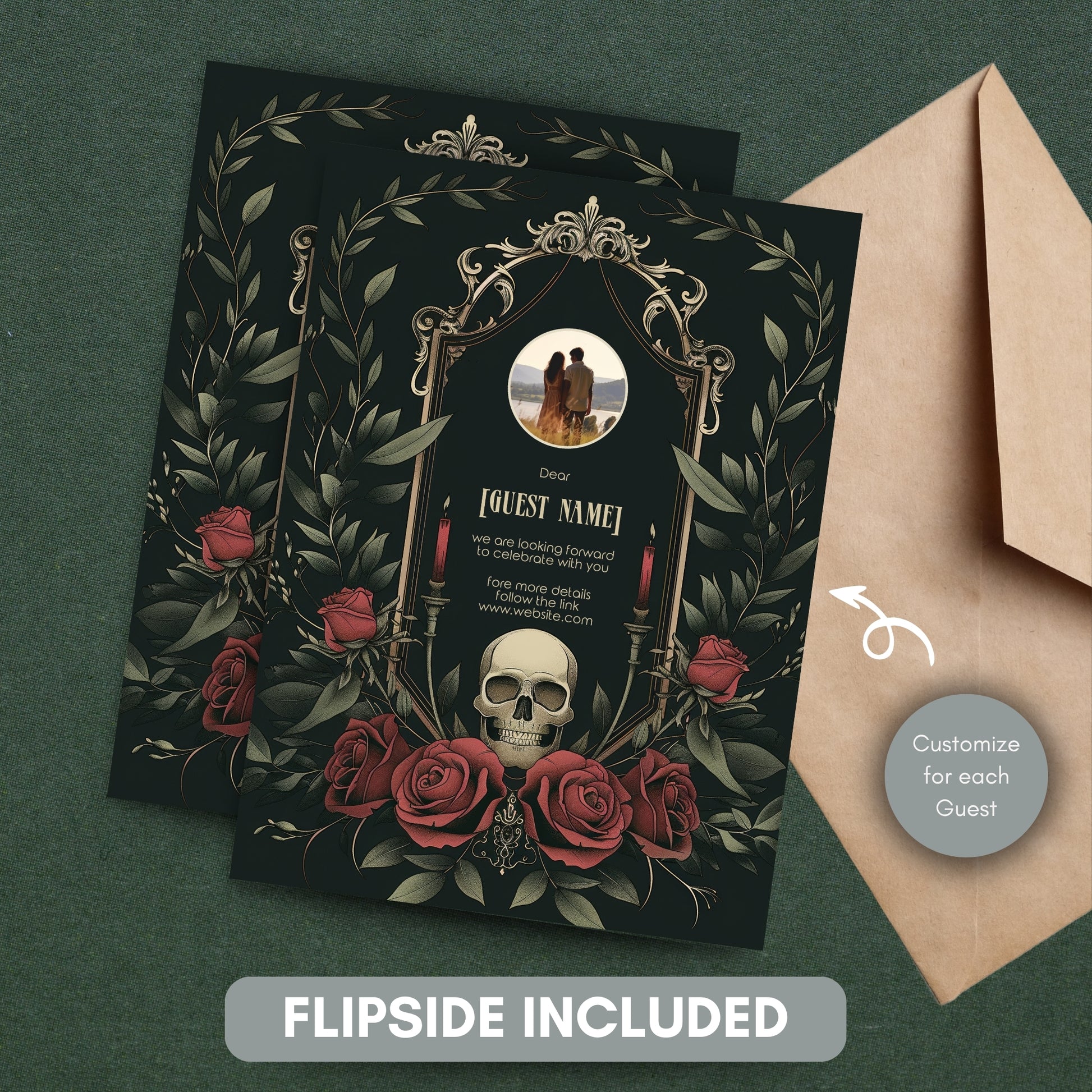 Gothic Skull & Roses Wedding Invitation - Victorian Botanical Elegance - Editable 8 Items Bundle for Gothic Weddings